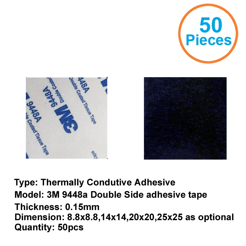 50 шт. 3M9448 термальная клейкая лента клейкая пленка для радиатора алюминиевый радиатор, теплопроводящие адгезивные радиаторы отопления 8,8 мм 14 мм 20 мм 25 мм 50 шт. 3M9448 Двусторонняя тканевая лента с покрытием термальная проводящая клейкая термальная прокладка для радиатора теплоотвода Особенности Сделанные 3M9448A, Используется для применения, требующих высокой теплопроводности с хорошей электрической изоляцией Высокая производительность не-силиконовые тепловые прокладки конструкции Мягкий и пригодный для использования на неплоских поверхностях Хороший прибор для тестирования диэлектрической производительности Отличная долговечность для долгосрочной теплопроводности и стабильности электрической изоляции Размер по желанию 8,8x8,8x0,15 мм, 50 шт./лот 14x14x0,15 мм, 50 шт./лот 20x20x0,15 мм, 50 шт./лот 25x25x0,15 мм, 50 шт./лот