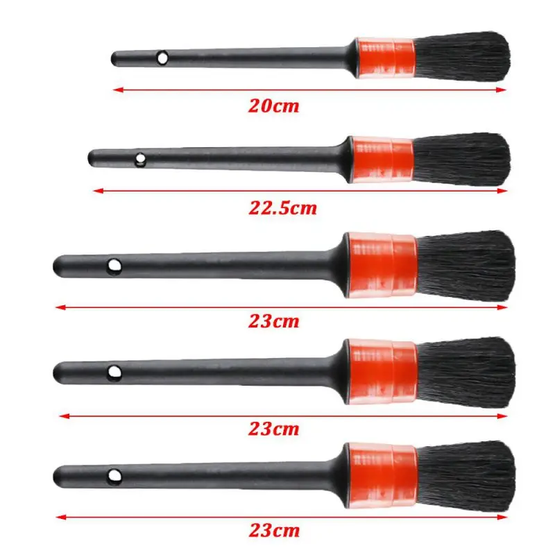 Особенности: 1. 5 различных размеров кисти, удовлетворяют ваши различные потребности 2. Достаточная длина для легкого изучения и достижения в гайки, узкое или плотное пространство 3. Можно использовать для удаления пыли, хлебной крошки и других мелких предметов из ваших колес, вентиляционных отверстий, отделки, сидений и эмблем, чтобы ваш автомобиль был полностью аккуратным и чистым изнутри Спецификация: Материал: полипропилен Длина кисти: около 20/22.2/23/23/23 см Цвет: черный + красный В комплект входит: 5 шт. * кисти Примечание: Возможны отклонения в 1-10 мм вследствие измерений вручную.