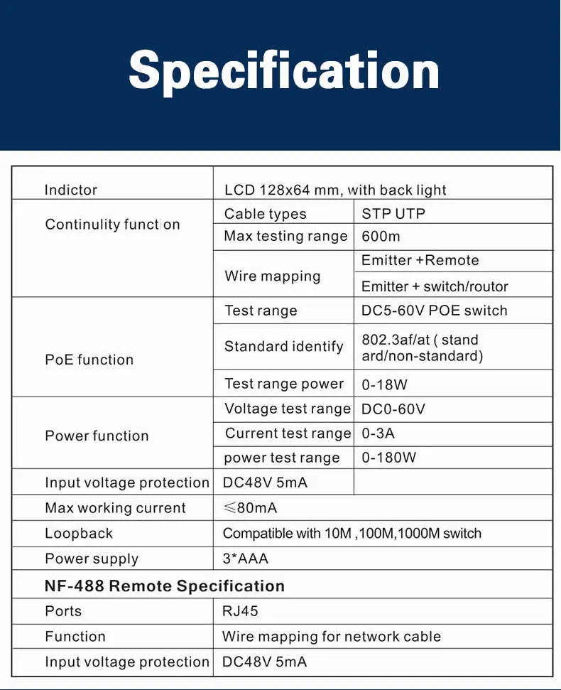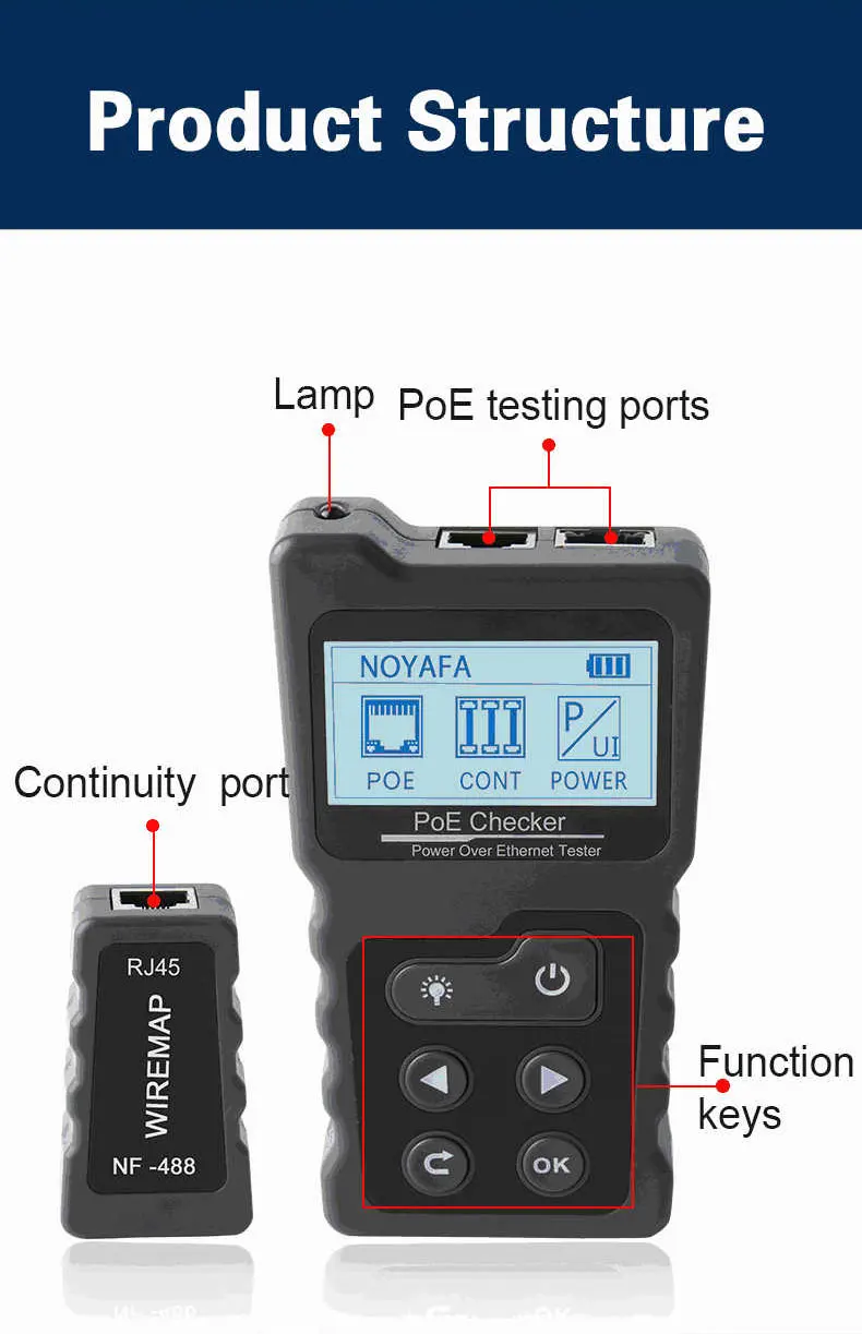 Примечание: Этот продукт не содержит батареек NF-488 проверки PoE Особенности товара: Is_customized: Да Название бренда: Noyafa Номер модели: NF-488 Место происхождения: Шэньчжэнь. Китай Порт: RJ45,POE Тест POE: Проверьте POE(power over ethernet) stwich standard af/at Мощность: 3 * AAA Основные функции · Определение напряжения питания, полярности источника питания и режима кроссовера нестандартных устройств PoE. · Проверьте состояние короткого замыкания, кроссовера и открытой цепи в сетевом кабеле с дальним концом. · Проверка мощности, потребляемой приборами постоянного тока. . Функция проверки на обратной стороне переключателя.