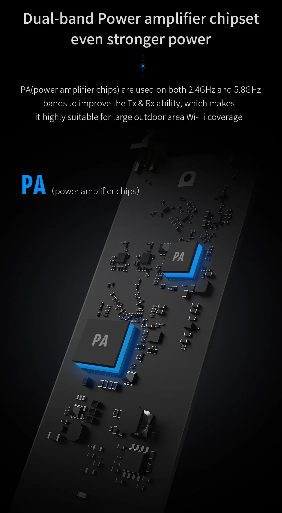 PA (усилитель мощности-сторонние микросхемы) используются как на 2,4 ГГц и 5,8 ГГц полосы для того, чтобы улучшить Tx/Rx способность, что делает ее очень хорошо подходит для большой открытый зона покрытия Wi-Fi