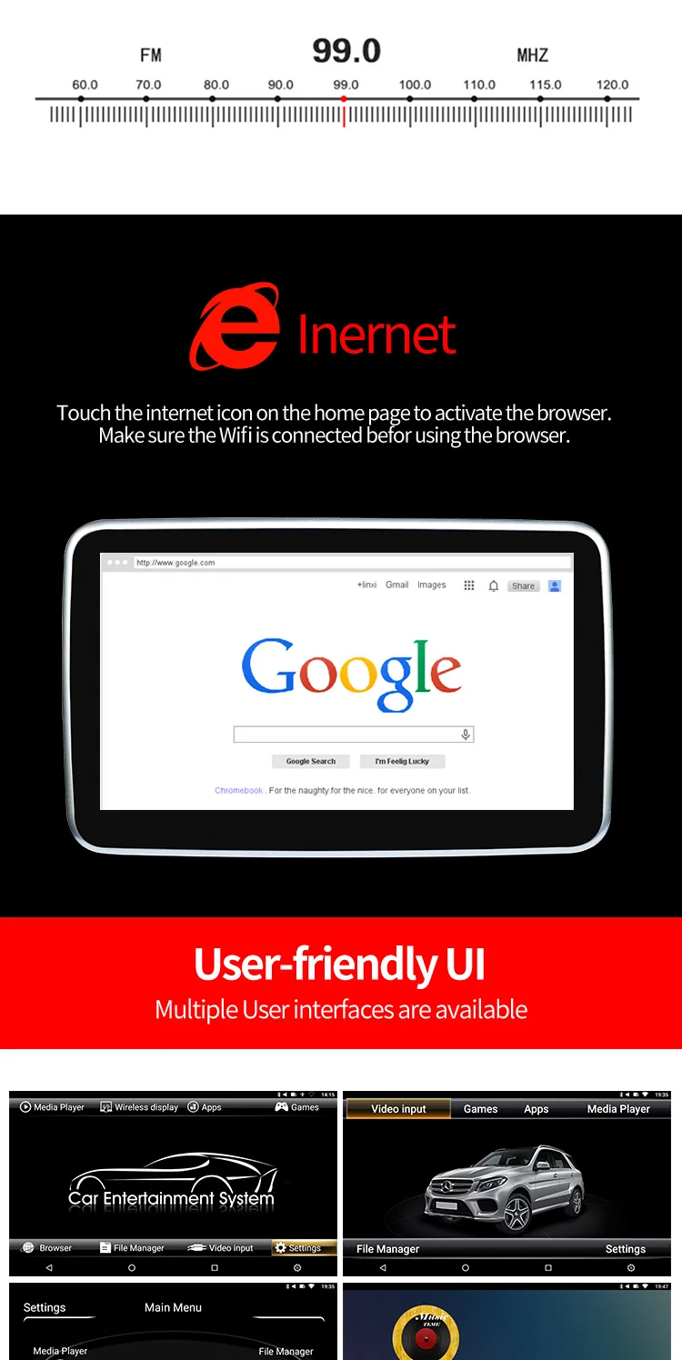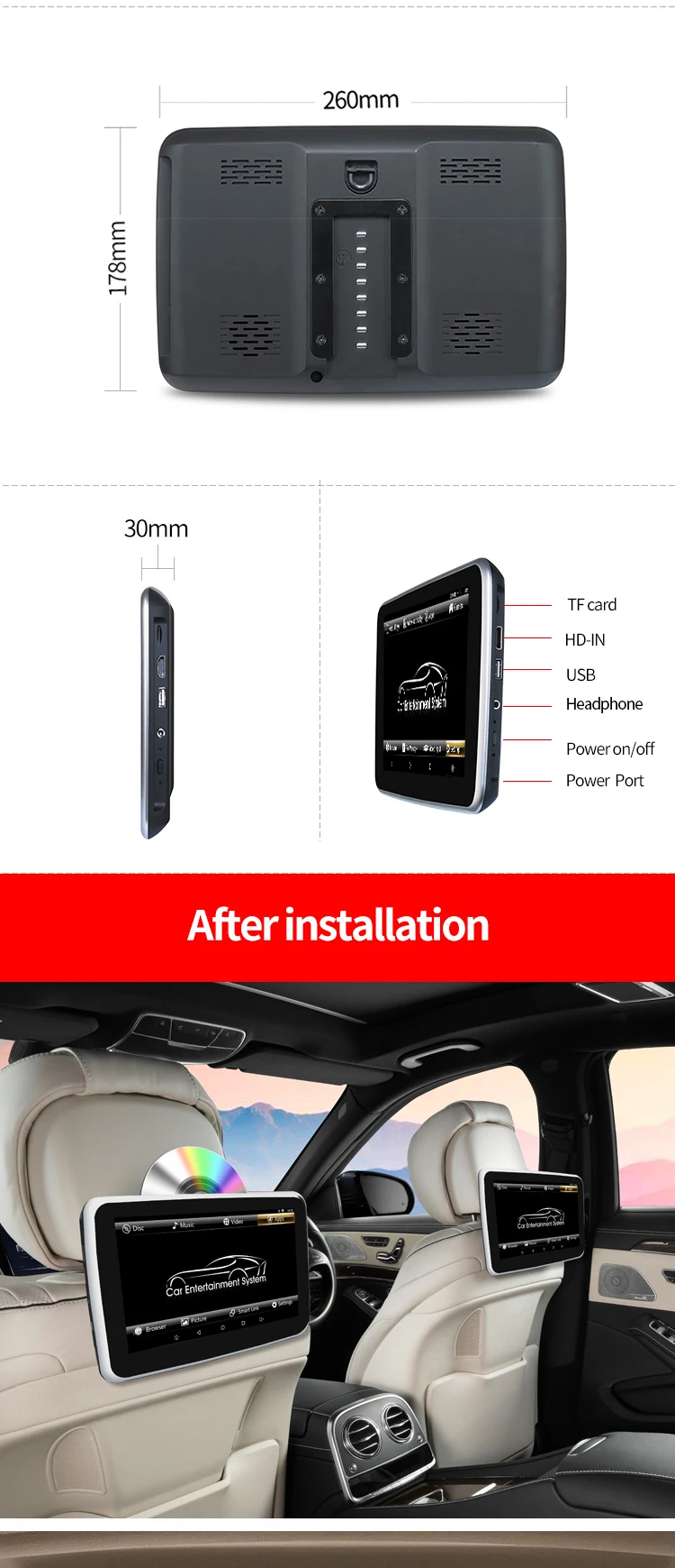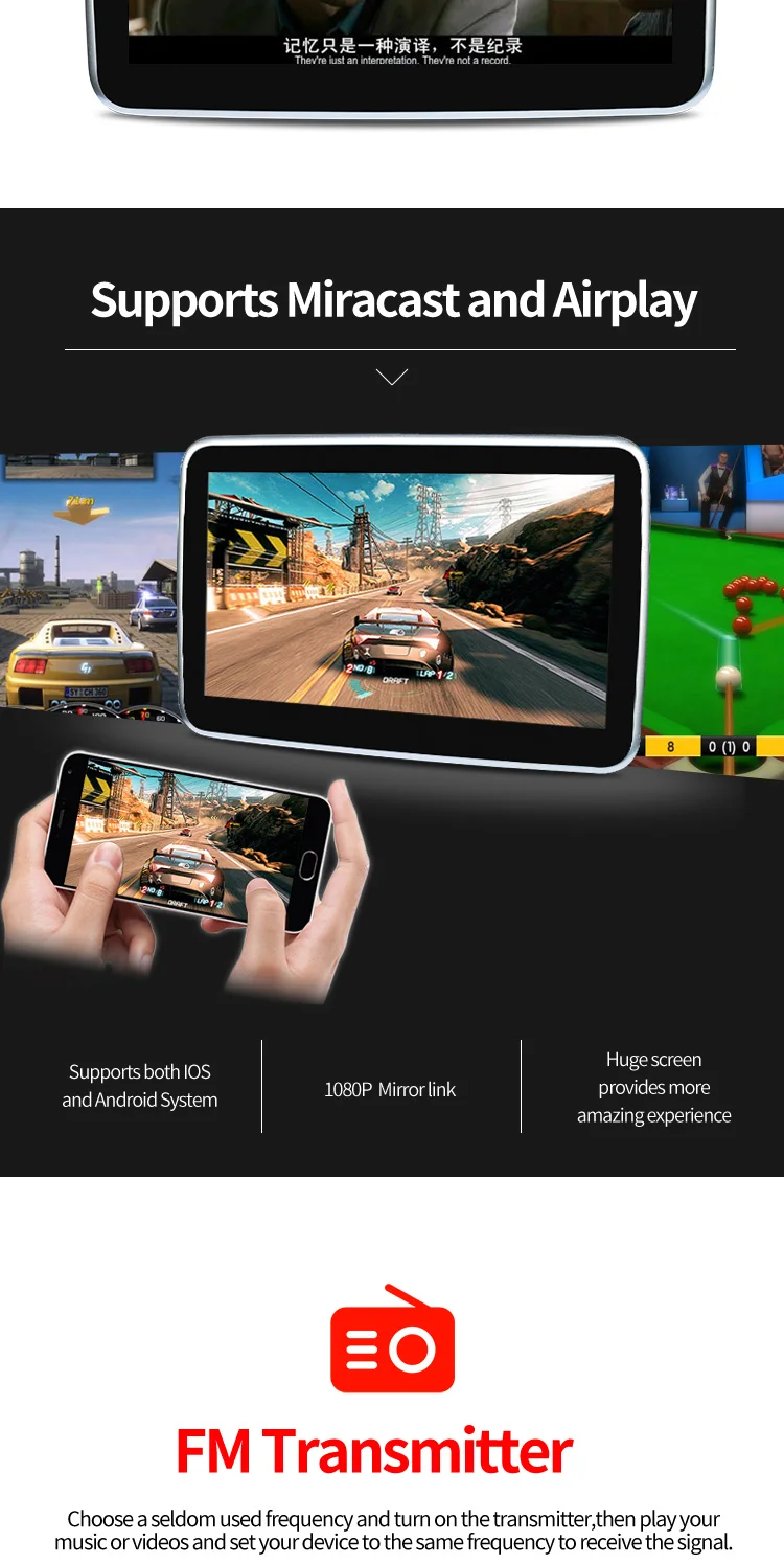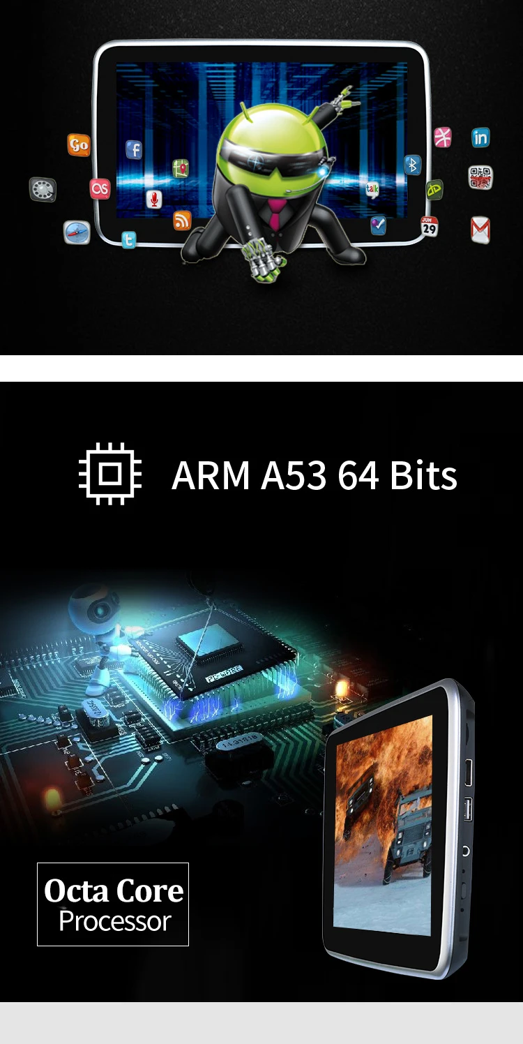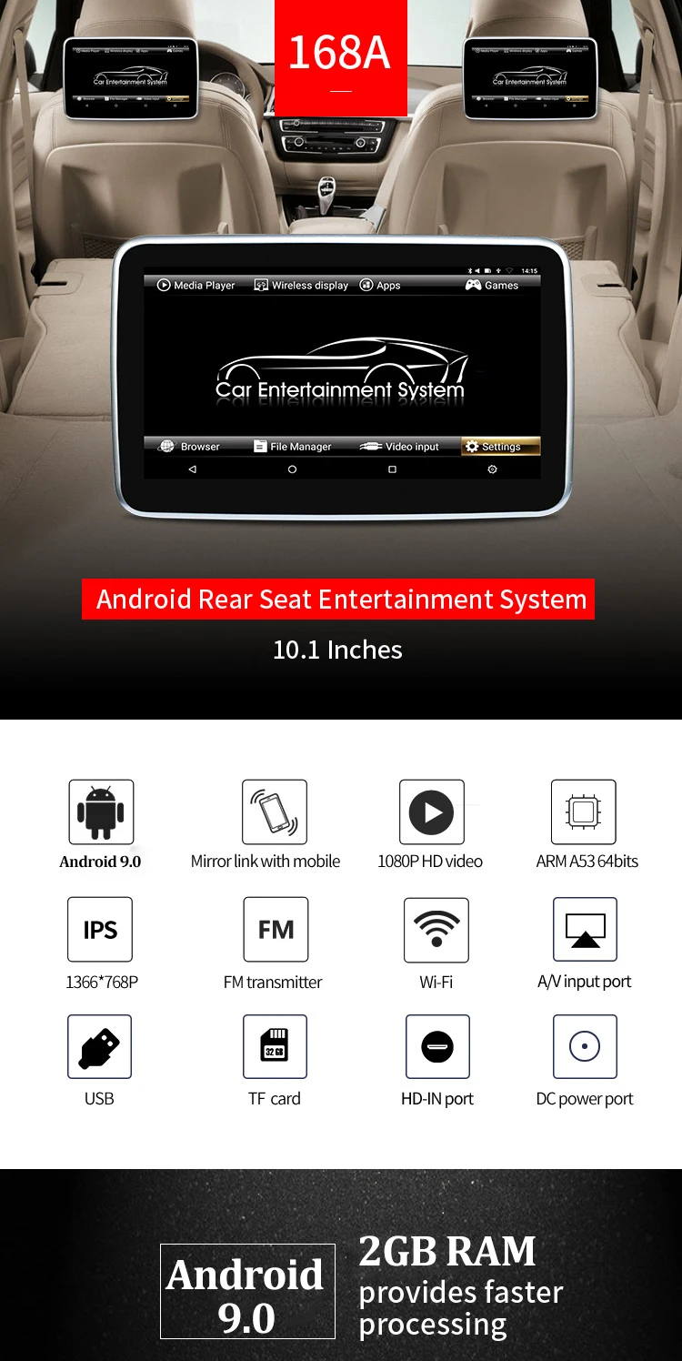 1,10,1-дюймовый сенсорный экран 1920*1080 IPS 2.Android 9,0 Pie и Octa Core 3,64 битная ОС Android, 2 Гб RAM, обработка мощной и плавной 4,16 Гб ПЗУ, расширение памяти: до 128 ГБ памяти USB и TF-карта 5. Встроенный беспроводной доступ в Интернет WLMA, поддерживает android APK 6. Встроенный Wi-Fi дисплей и Airplay 7,73 логотипов автомобилей и 18 пользовательских интерфейсов для автомобилей на выбор 8. Универсальный дизайн подходит для всех автомобилей 9. Плавное воспроизведение видео 4K / 1080P 10. Встроенный динамик 11.AV-вход: поддерживает связь с автомобильным хостом или цифровым тв 12. Поддержка FM-передатчика 13. Поддержка Bluetooth стерео 14. Аудио и видео вход 15. Вход HDMI: Поддержка аудио и видео HDMI 16. Рабочее напряжение: 12 В постоянного тока 17. Рабочая температура: от-20 ℃ до 60 ℃