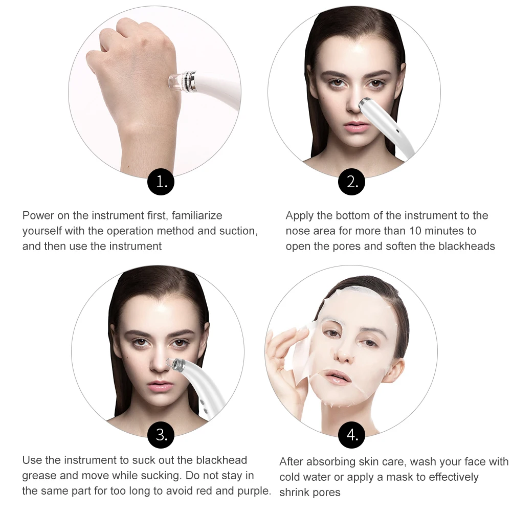 * 1. Многофункциональная вакуумная машина для удаления угрей и акне обеспечивает 4 режима и 5 различных всасывающих наконечников, чтобы гарантировать, что очиститель пор подходит для всех типов кожи. Выберите различные профессиональные советы для разных типов кожи.