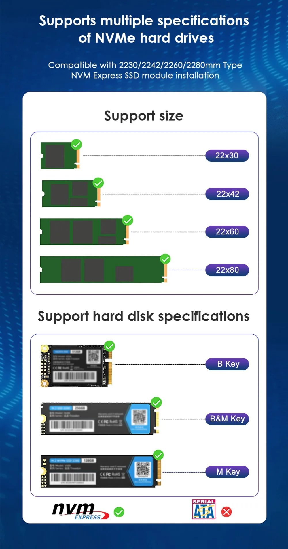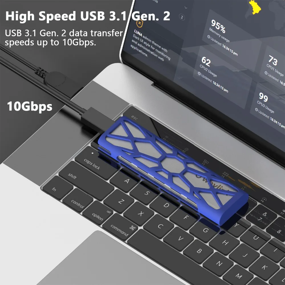 USB 3,1 Gen 2 к NVMe корпус отдается 2230/ 2242/ 2260/ 2280 мм NVMe SSD модуль установки. USB 3,1 Gen 2 интерфейса обеспечивает скорость передачи данных до 10 Гбит/с, удвоения USB 3,1 Gen 1 скорость. Скорость считывания данных Максимальная может до около 1500 Мбит/с. Уникальная оболочка groove конструкция улучшить тепло рассеивается от внутренней жаростойкий корпус записана. Таким образом, чтобы увеличить NVMe SSD физические показатели во время бега. На какую-либо поверхность Портативный дизайн, более высокую скорость, подключи и работай, Mac OS и Windows Совместимость во время работы, драйверы не требуются всего предусмотрено в хорошем состоянии для путешественников и все любят производительность пользователей.