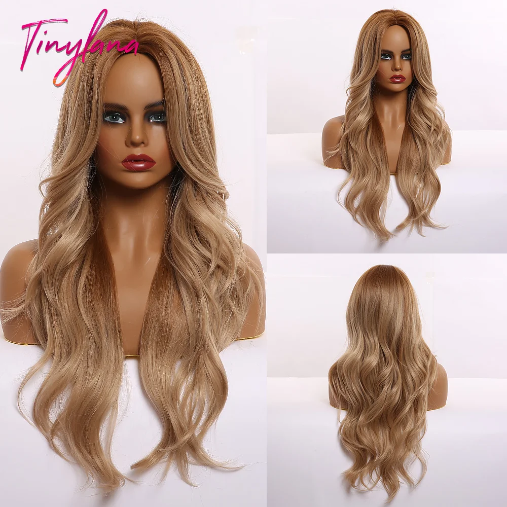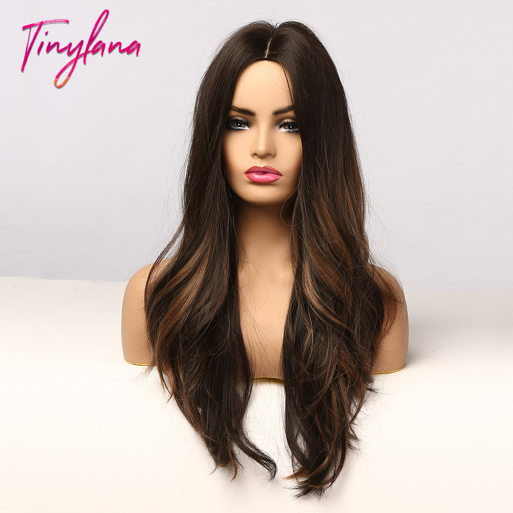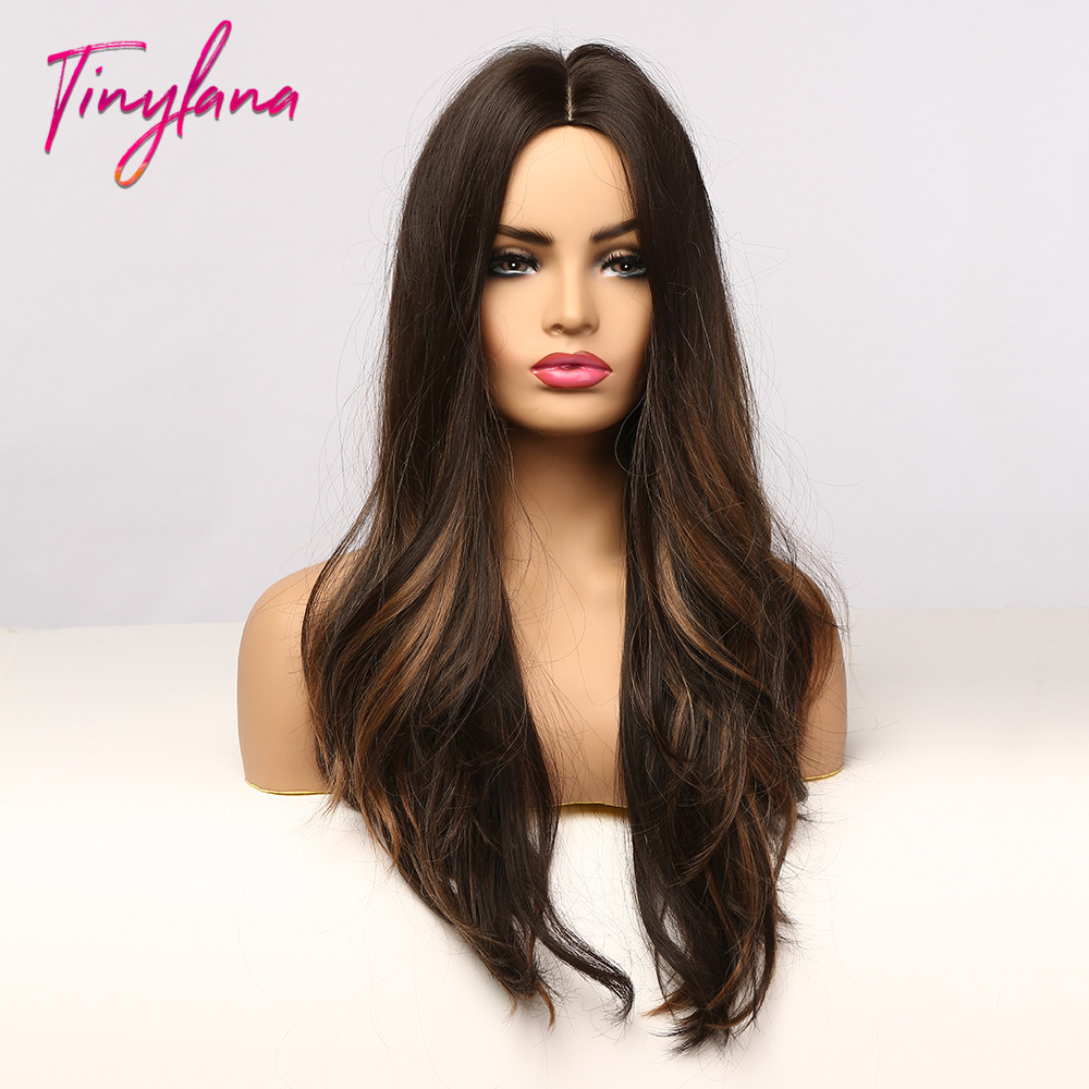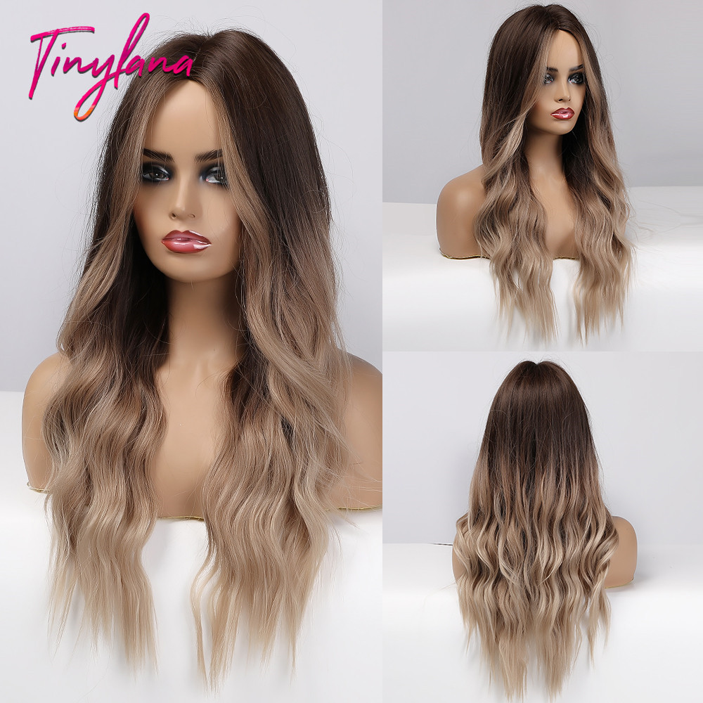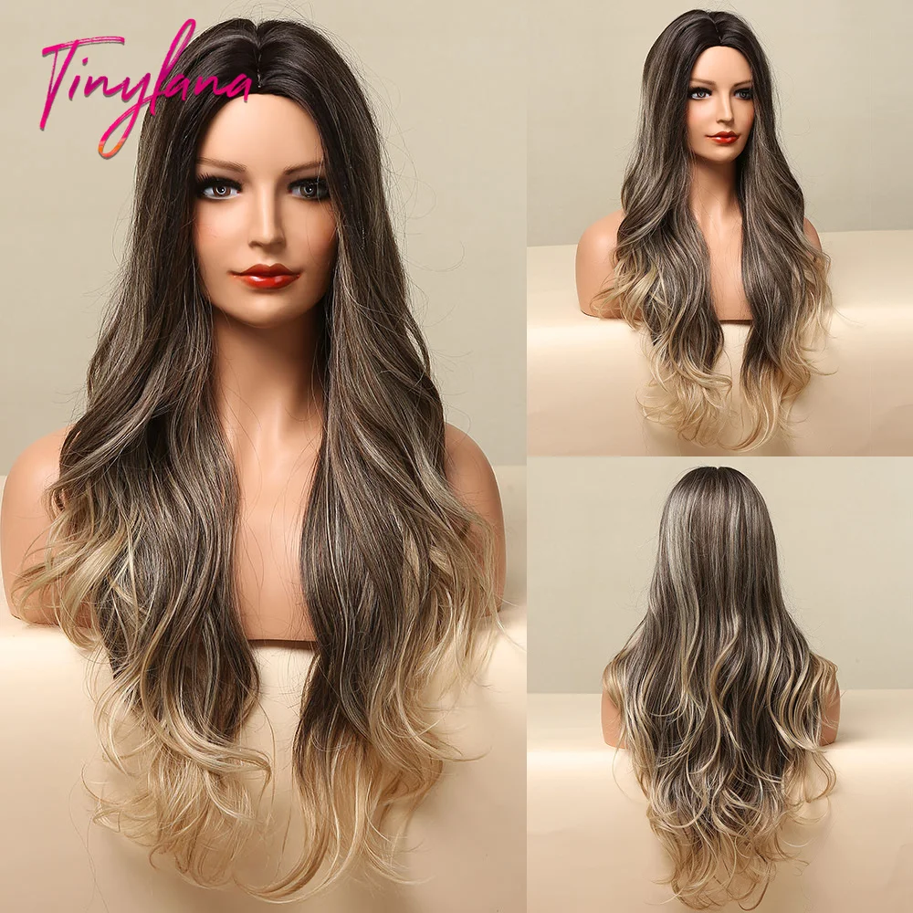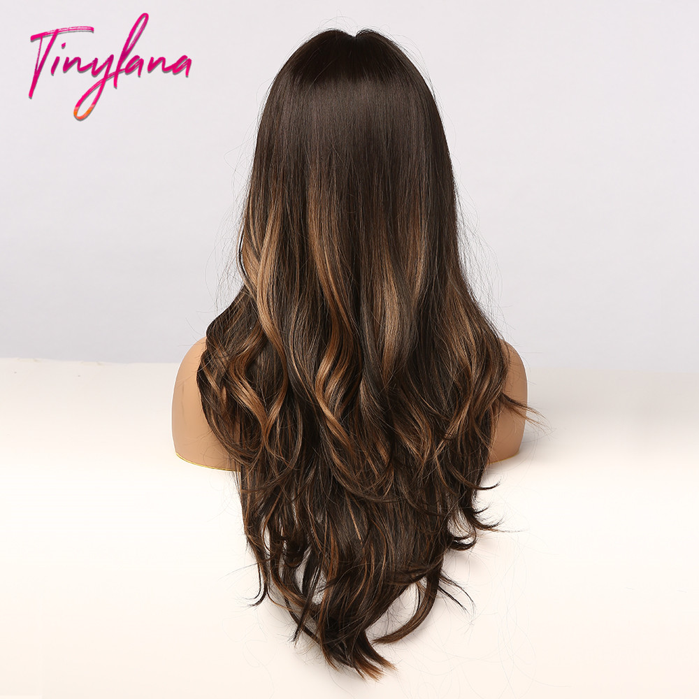 Крошечный LANA синтетический Омбре черный коричневый с золотыми бликами парики длинные волнистые термостойкие средняя часть косплей парики для женщин