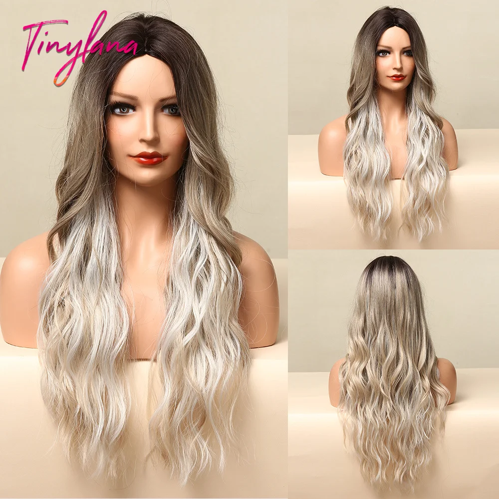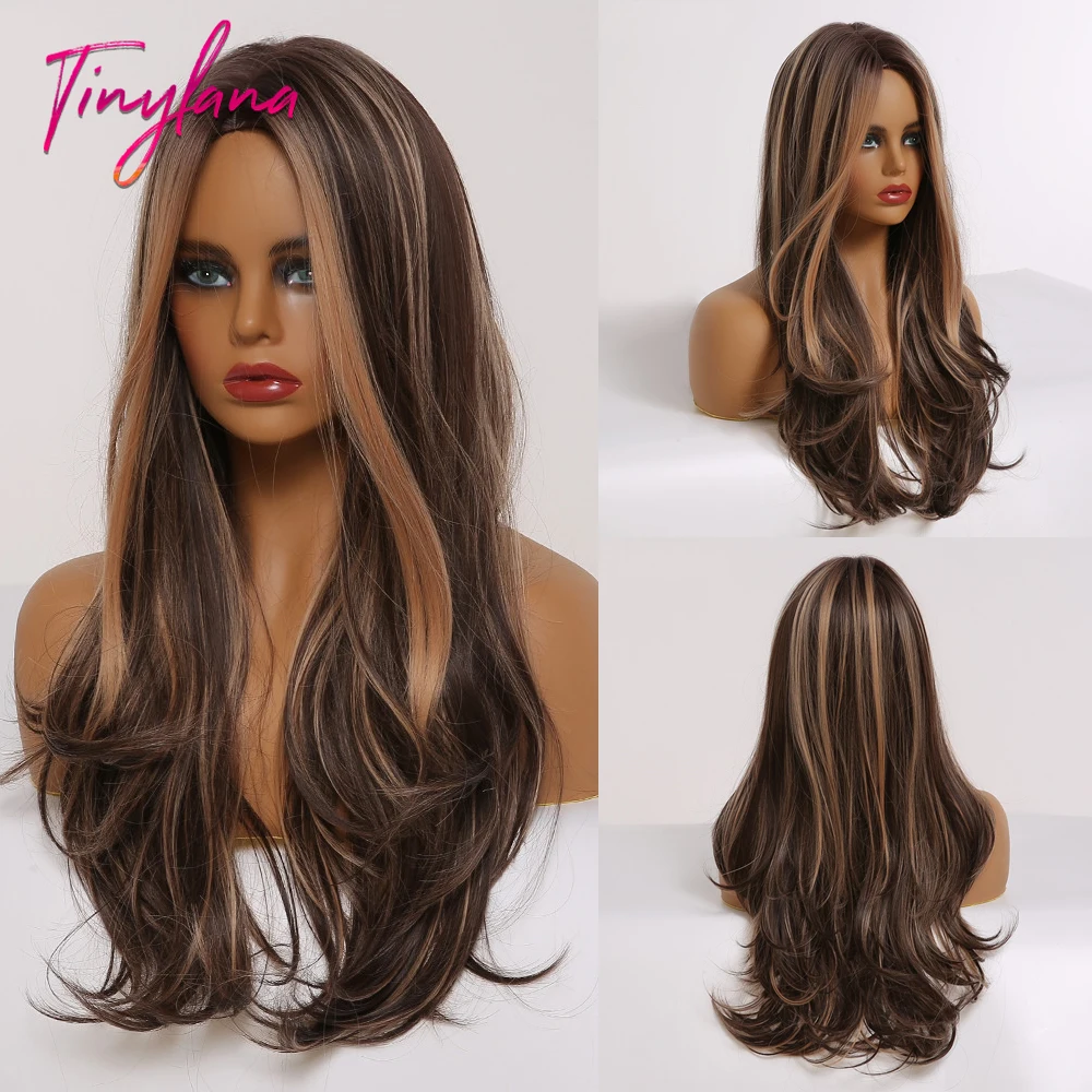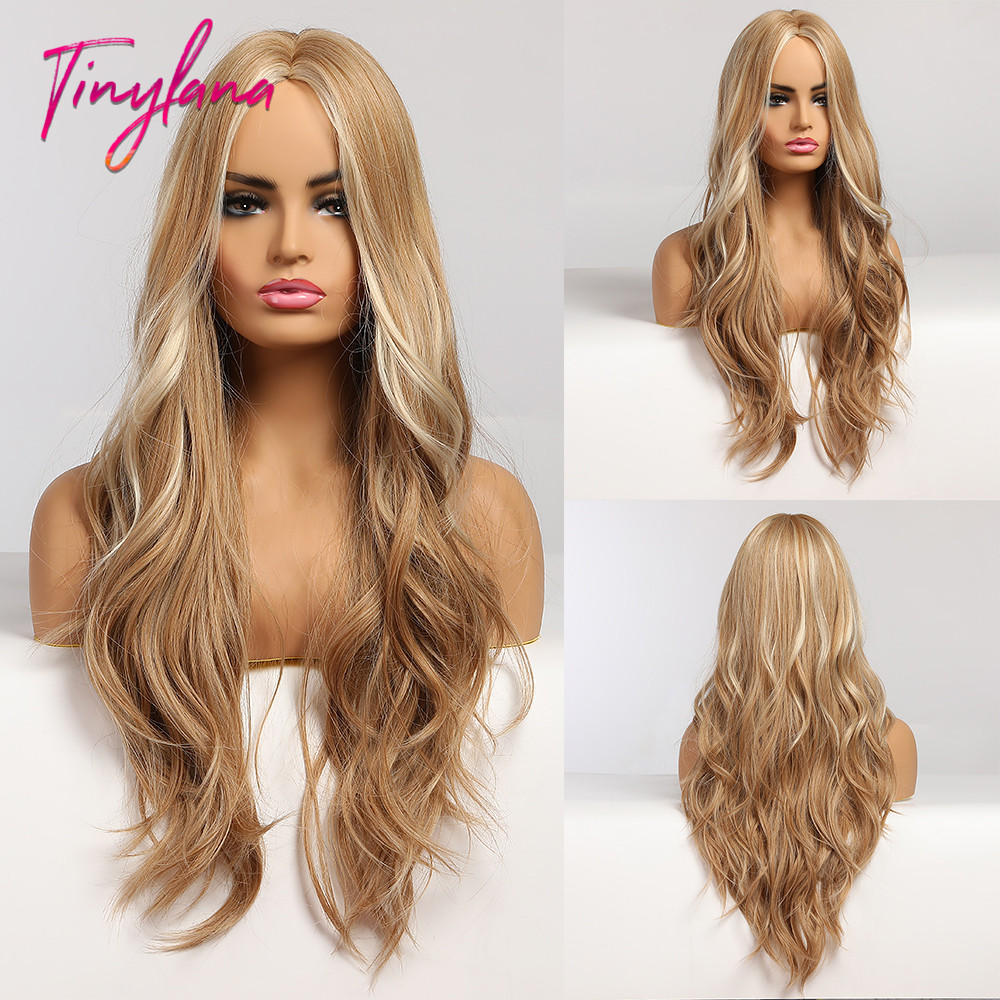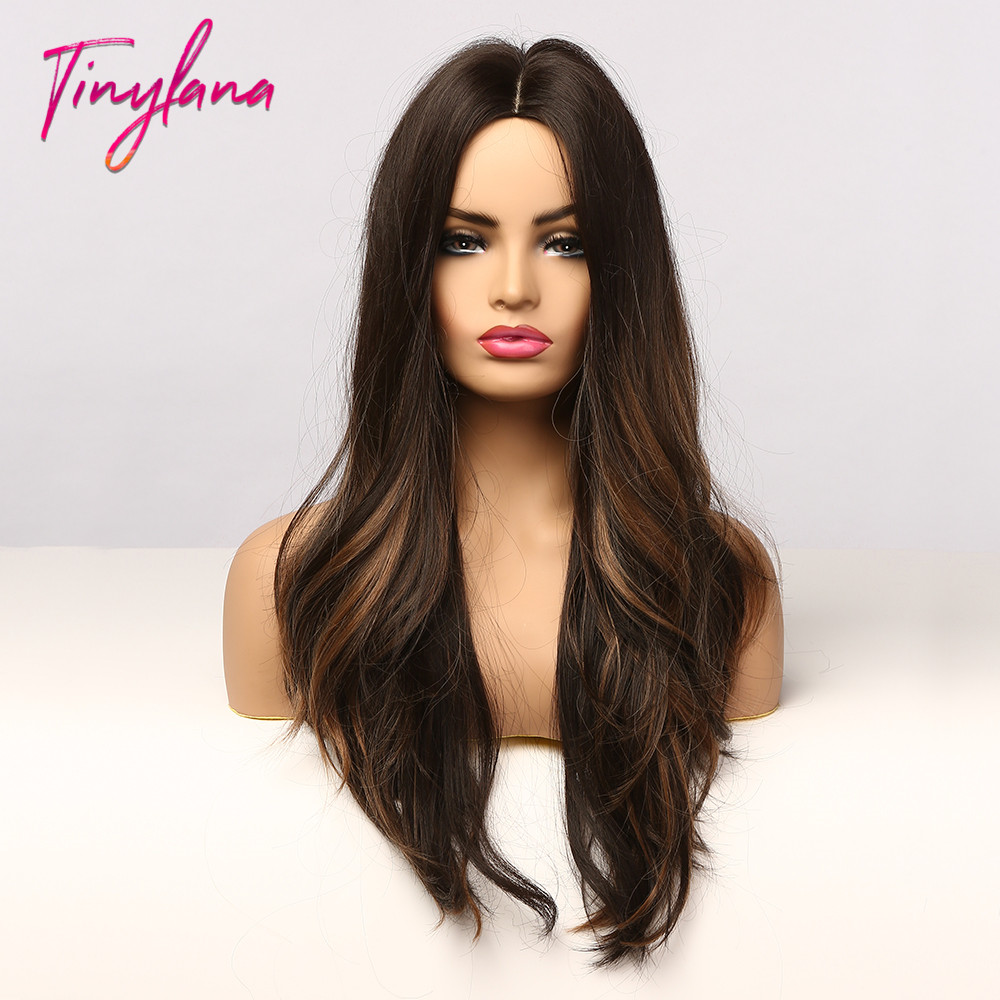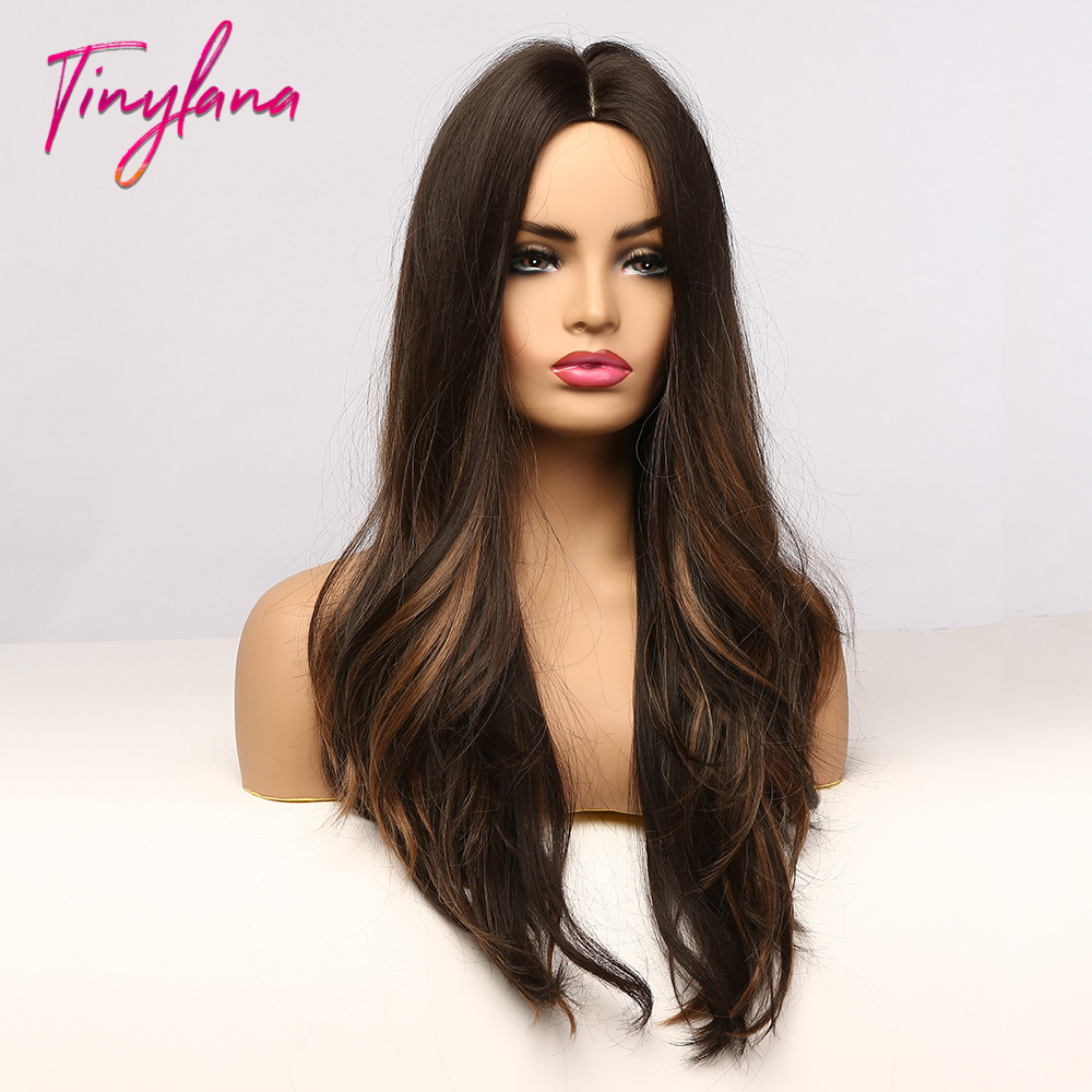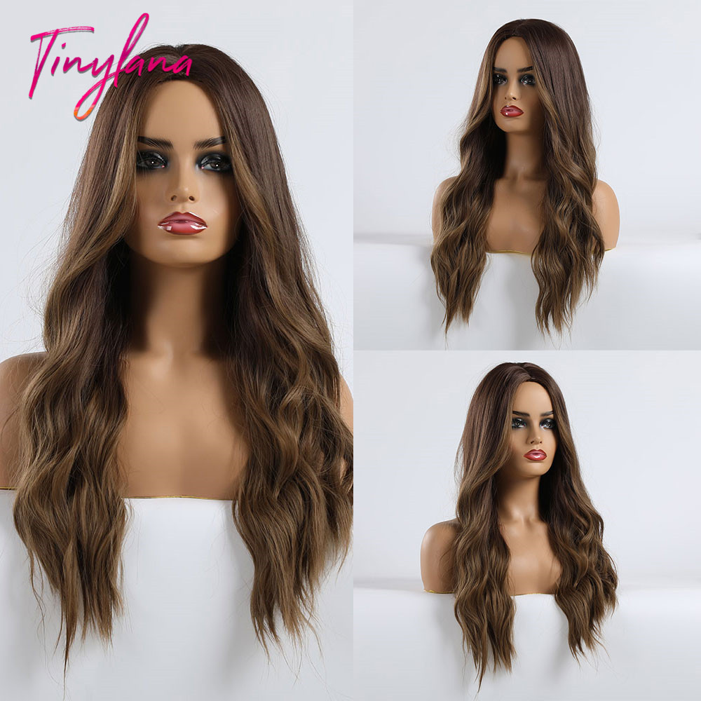 Крошечный LANA синтетический Омбре черный коричневый с золотыми бликами парики длинные волнистые термостойкие средняя часть косплей парики для женщин