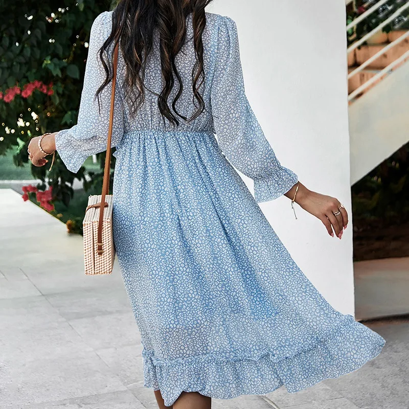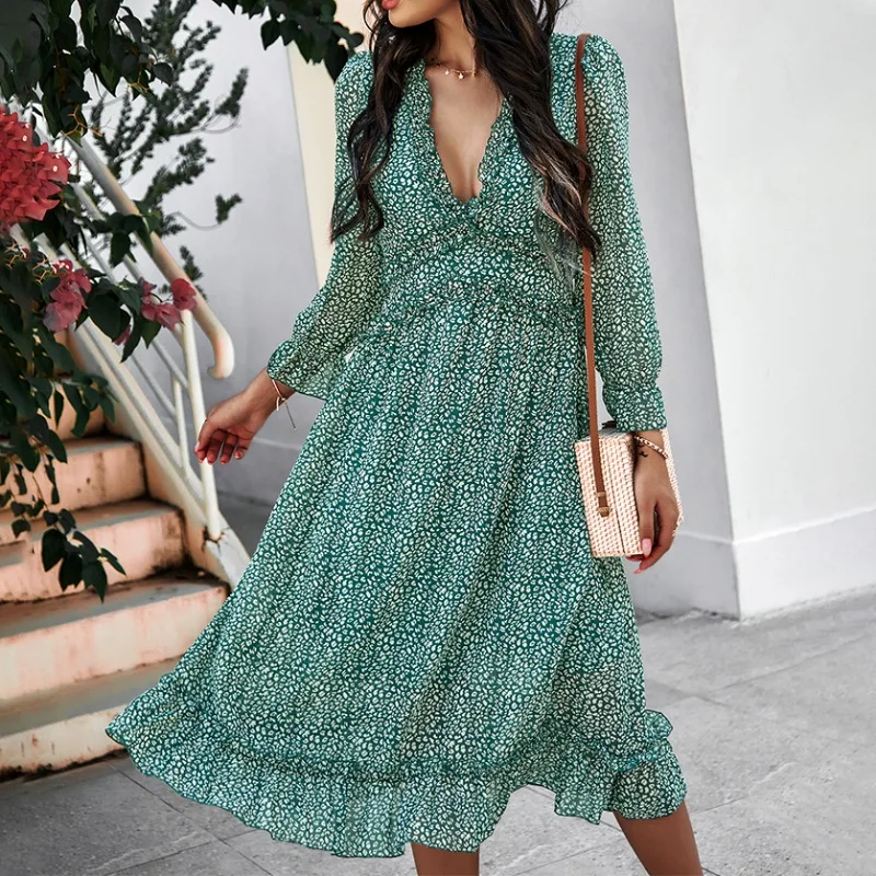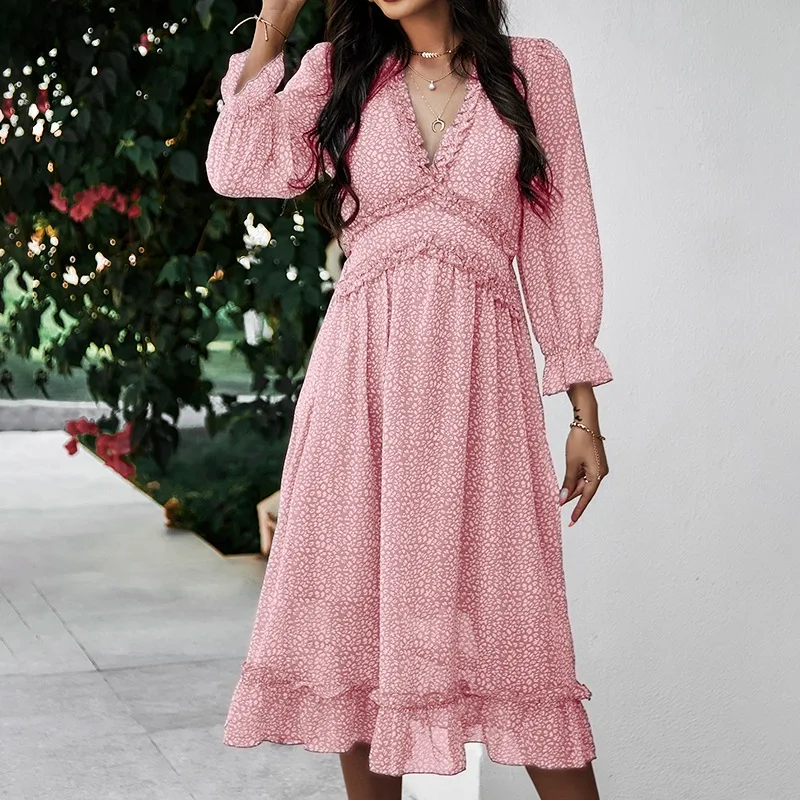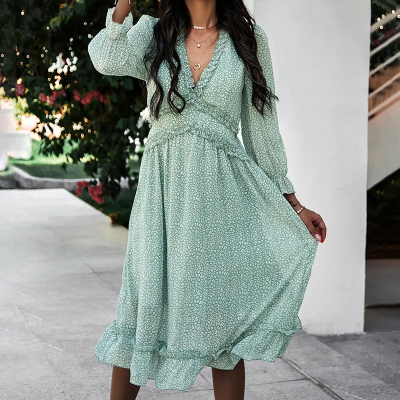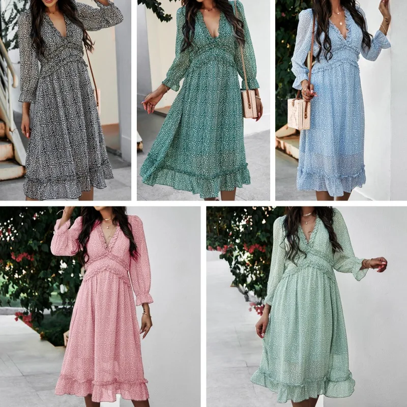 Особенности: пикантный и милый стиль, мягкий материал, удобный светильник. Глубокий v-образный вырез, отделка в виде листьев лотоса, цветочный узор, длинные рукава, это милое платье добавит вашей жизни.