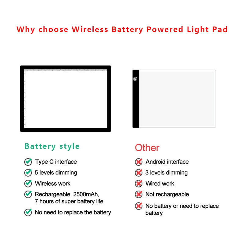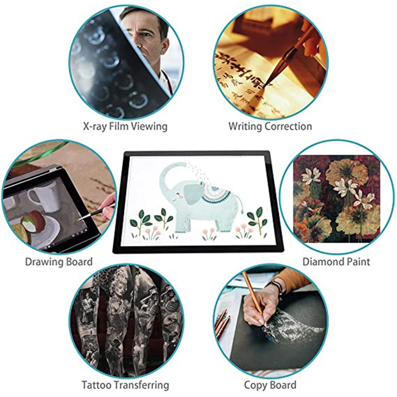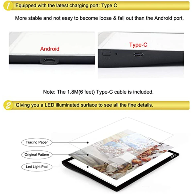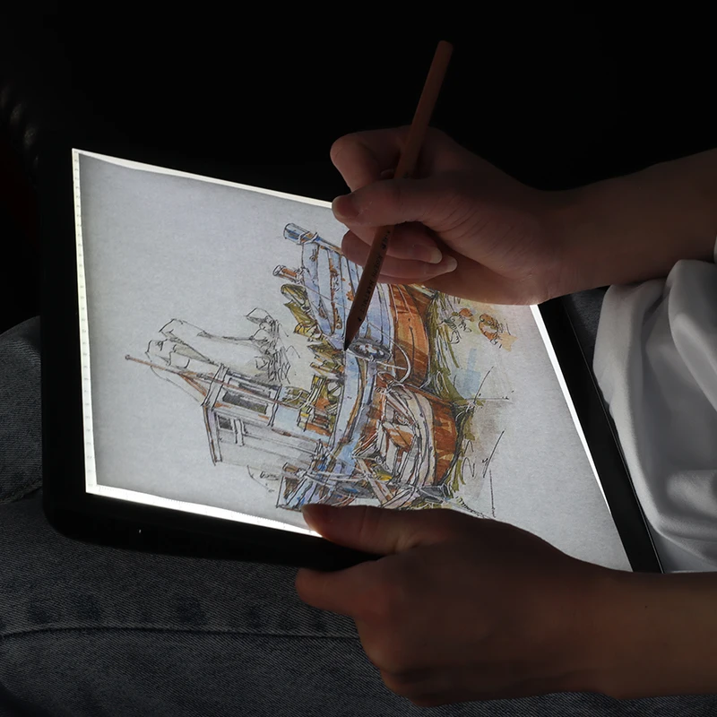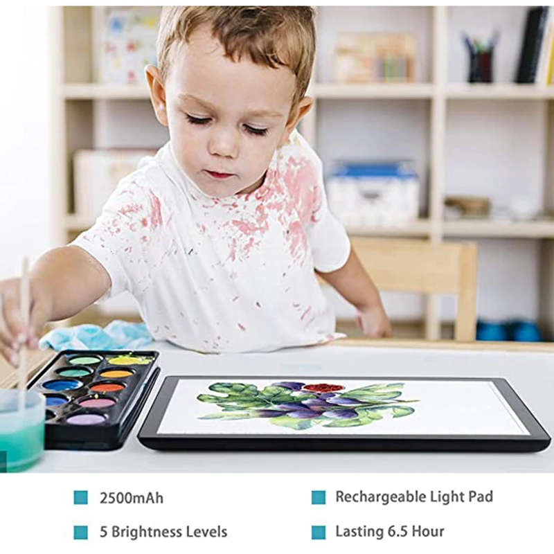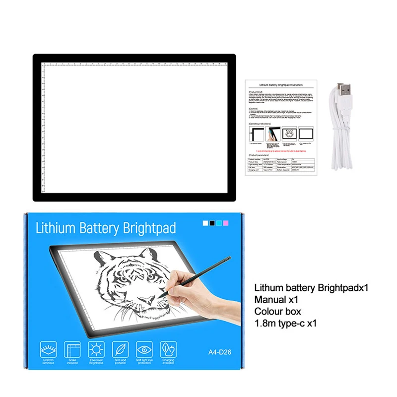 Батареи: литиевая батарея 2500 ма Диммирование: 5 уровней затемнения Размер: 340*249 * мм Площадь освещения: 308*218 мм Рабочая поверхность: акриловые панели Источник светильник светодиодный Рабочее напряжение: 5 В/50/60 Гц Потребляемая мощность: 1,88 Вт Интерфейс питания: Type-C Направляющий способ светильник щения светильник вая панель Размер шкалы: Да Применение: след/эскиз/мультфильм/2D Анимация/рентгеновский обзор/алмазная живопись
