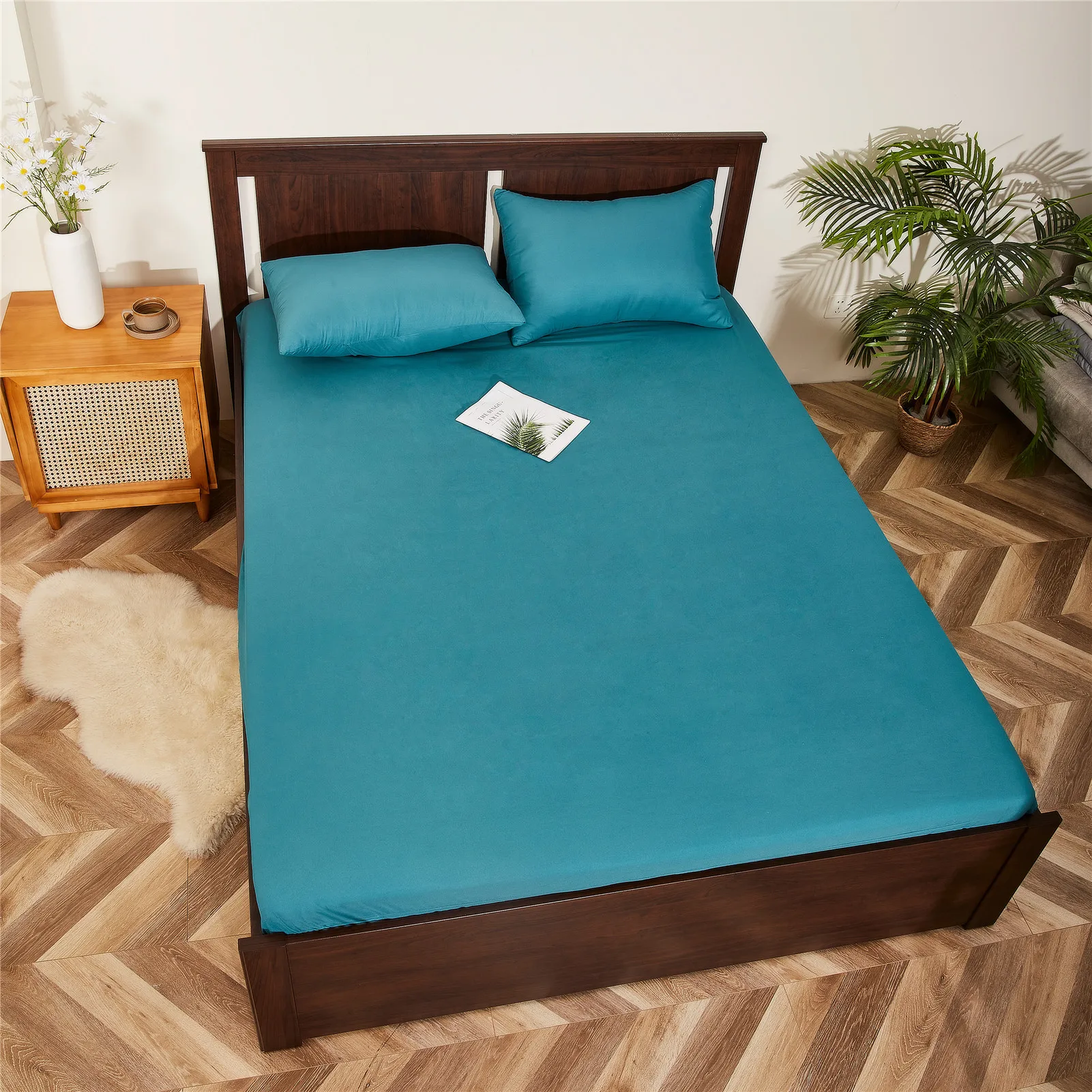 Однотонная простая простыня, фиксируется резинкой, легко устанавливается и заменяется.