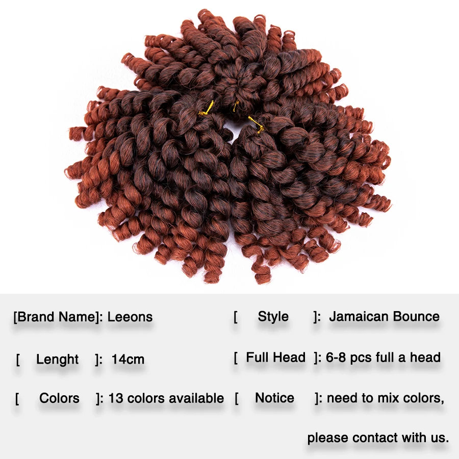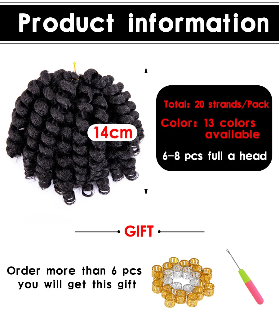 Материал: синтетический волос Цвет: чистый/цвет Омбре, 13 цветов на выбор Длина: 14 см Посылка: 20 корней в посылка и бесплатный подарок Обычно 6-8 штук для головы, закажите более 6 штук, вы получите этот подарок Использование: повседневная одежда, свадебные, вечерние, другие подходящие места 1. Ямайское эластичное вязаное крючком плетение щипцы для завивки плетеные крючком плетеные волосы предварительно петля СИНТЕТИЧЕСКОЕ Наращивание. 2. Мягкий на ощупь, без запутывания, без запаха, более пушистый и легко отделяется, естественный внешний вид. 3. Ямайские тянущиеся крючком волосы, ямайские одноформенные кудрявые крючком африканские коллекции предназначены для афро-американских женщин. 4. Наши вязаные локоны изготовлены из синтетических волокон, которые имитируют ощущение и ощущение настоящих волос. 5. Пожалуйста, расчешите или пришлите его в форму пальцами. При расчесывании волос ваш парик может упасть. Это очень нормальная вещь, и нет необходимости беспокоиться об этом.