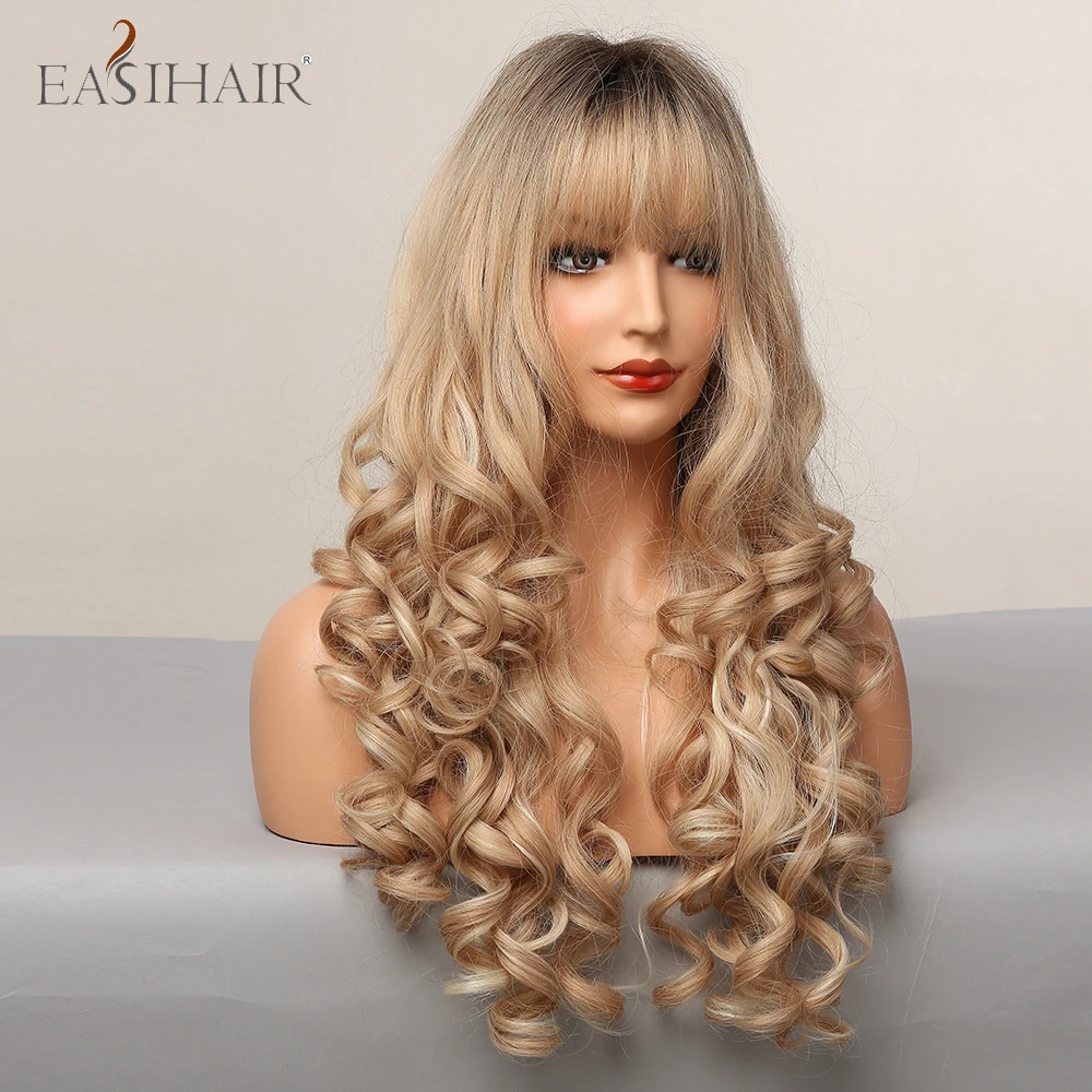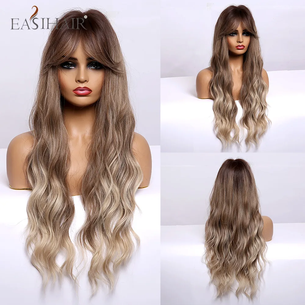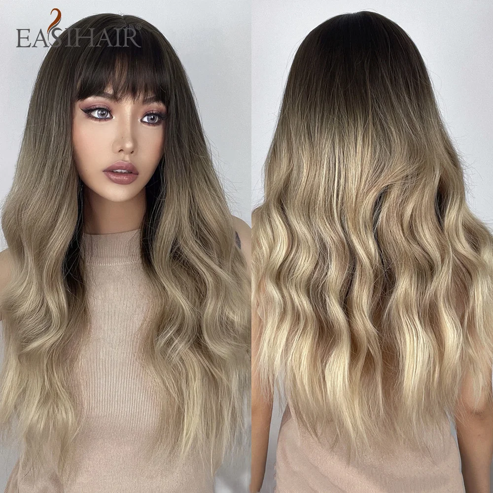EASIHAIR, Омбре, коричневый, шампань, блонд, выделка, Длинные свободные волнистые синтетические волосы, парики с челкой, термостойкие поддельные волосы для женщин