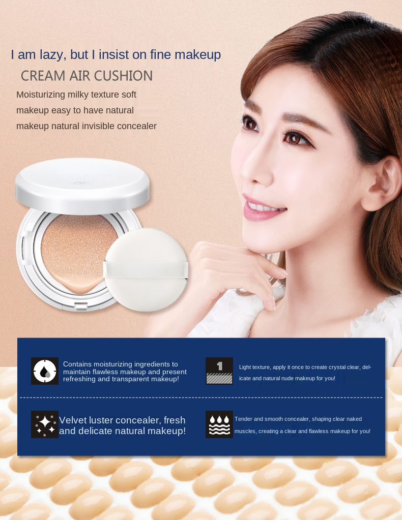Three different colors are available, can be all kinds of skin color needs Air cushion design , light and breathable Contains Sodium hyaluronate, VE , with skin care effect, skin care and makeup dual combination Sodium hyaluronate has a good moisturizing effect Smooth texture, fit the skin,create a skin like a baby Cover face flaws, creat nude makeup With a super soft puff, gentle care of your skin Note: Old Packing or New Packing will be send at ramdom