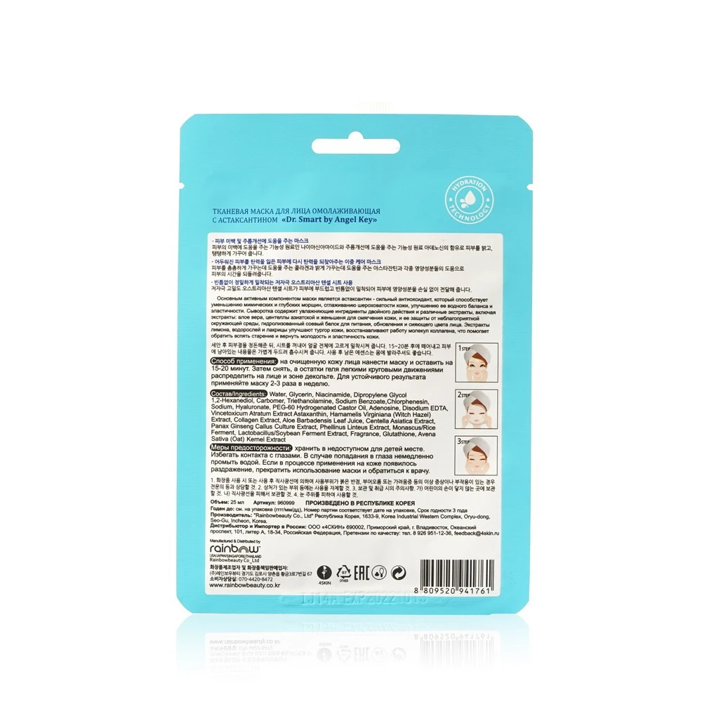 Описание от производителя:Тканевая маска для лица омолаживающая с астаксантином Dr. Smart — на основе технологии волокон TENCEL для создания тончайшей структуры, удерживающей влагу. Маска изготовлена из натуральной биоразлагаемой целлюлозы, благодаря чему удерживает влагу на 50% лучше, чем синтетика, что позволяет коже абсорбировать эссенции от маски и улучшает питание и восстанавливает тонуса кожи. Не содержит химических клеев и биологически разлагается. Не раздражает кожу и не вредит окружающей среде. Основным активным компонентом маски является астаксантин - сильный антиоксидант, который способствует уменьшению мимических морщинок и морщин, сглаживанию шероховатовсти кожи, улучшению ее водного баланса и эластичности.Сыворотка содержит увлажняющие ингредиенты двойного действия и различные экстракты, включая экстракты: алое вера, центеллы азиатской и женьшеня для смягчения кожи и ее защиты от неблагоприятной окружающей среды, гидролизованный соевый белок для питания, обновления и сияющего цвета лица, экстракты лимона, водорослей и лакрицы улучшают тургор кожи, восстанавливают работу молекул коллагена, что помогает обратить вспять старение и вернуть молодость и элостичность кожи. Применение:На очищенную кожу лица нанести маску и оставить на 15-20 минут. Затем снять, а остатки геля легкими круговыми движениями распределить на лице или других проблемных участках тела. Для устойчивого результата применяйте маску 2-3 раза в неделю. Состав:Water, Glycerin, Niacinamide, Dipropylene Glycol, 1,2-Hexanediol, Carbomer, Triethanolamine, Sodium Benzoate, Chlorphenesin, Sodium Hyaluronate, PEG-60 Hydrogenated Castor Oil, Adenosine, Disodium EDTA, Vineoxicum Atratum Extract, Astaxanthin, Hamamelis Virginia (Whitch Hazel) Extract, Collagen Extract, Aloe Barbadensi...