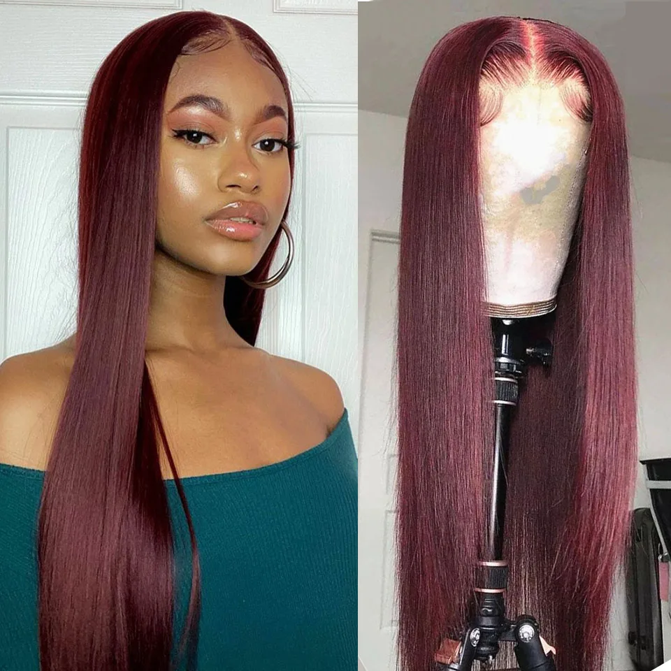 Бордовый прямой кружевной передний парик 180% Плотность красный T часть кружевные парики