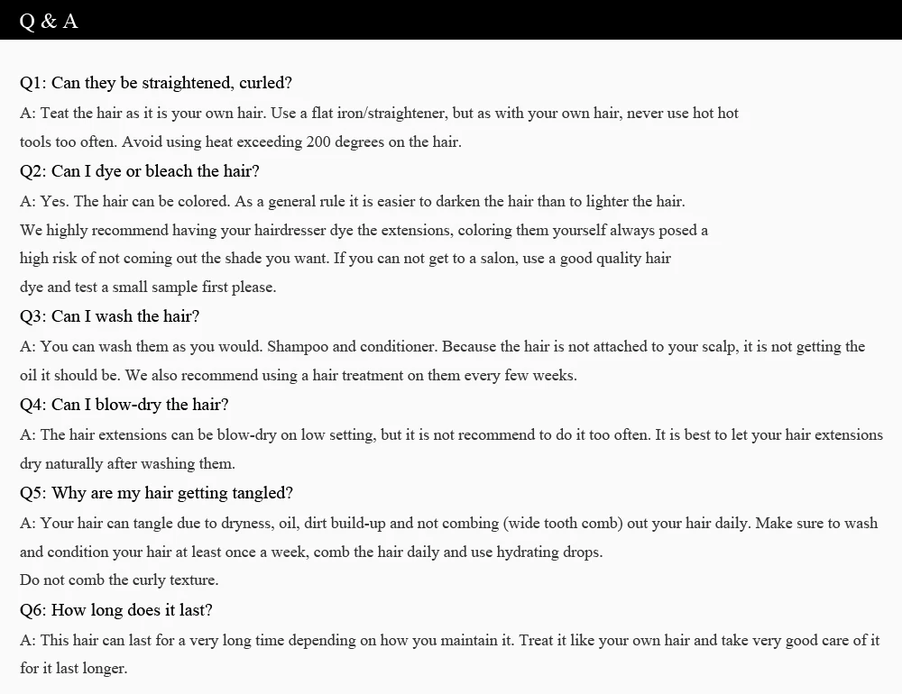 В: я отменить заказ, но почему я все еще не получил возврат? О: требуется 3-20 рабочих дней для Ali express, чтобы обработать возврат, чтобы быть терпеливыми. В: Какова наша политика возврата? О: Если у волосков есть проблемы с качеством, мы принимаем возврат в течение 7 дней после завершения заказа. Если вам не нравятся волосы, но нет проблем с качеством, вы можете вернуть волосы в течение 7 дней, но вам нужно оплатить стоимость доставки. В: как долго это длится? О: эти волосы могут длиться долгое время в зависимости от того, как вы их поддерживаете. Обработайте их, как ваши собственные волосы и Позаботьтесь о них очень хорошо, текстура волос может хорошо удерживаться после стирки. В. Можно ли окрашивать или отбеливать волосы? О: все волосы могут быть окрашены и выбелены в желаемый цвет, но естественный цвет может быть окрашен не легче #27, #613 цвет может быть окрашен в любой Цвета, но вам нужно сделать профессионально, чтобы получить точный цвет, не повреждая волосы. Человеческие волосы легко высохнут после того, как вы оставите донора, поэтому, пожалуйста, не окрашивайте и не отбеливать волосы Часто. Вопрос: какая лучшая температура для плоского железа или свернутого железа? О: мы рекомендуем 160 ~ 180 градусов Цельсия или 320-350 градусов по Фаренгейту! Даже человеческие волосы могут быть сожжены. Если температура слишком высока без правильного контроля времени. Продукты защиты тепла будут рекомендованы во время высокотемпературного железа. Вопрос: будут ли эти волосы хорошо держать локоны? О: да! Наши волосы могут красиво держать локоны! У нас есть несколько советов:> найдите правильную температуру для завивки волос. Мы предложим вам немного повысить температуру, чтобы проверить ее.> контроль времени очень важен, мы советуем, чтобы кудрявый сидит на волосах около 8 ~ 10 секунд при правильной температуре.> нанесите немного аэрозоля для волос, чтобы сохранить изгиб на весь день. В. Почему волосы линяют или запутываются? О: у новых волос будет небольшое количество ниток, что является нормальным. Чрезмерное выпадение и запутывание могут исходить из: a. Плохая уток конструкция b. Уток резки c. Высушите волосы для плохой уток, пожалуйста, свяжитесь с нами и отправьте фотографии немедленно, мы поможем вам вернуть деньги Обмен на основе нашей политики возврата. Мы настоятельно рекомендуем клиентам прокладку уплотнения и DONOT CUT TRACK. И проблемы с сухостью приведут к запутыванию и потере, пожалуйста, следуйте нашей инструкции по уходу за волосами и сделайте кондиционер, чтобы совместно мыть его по крайней мере один раз в неделю!