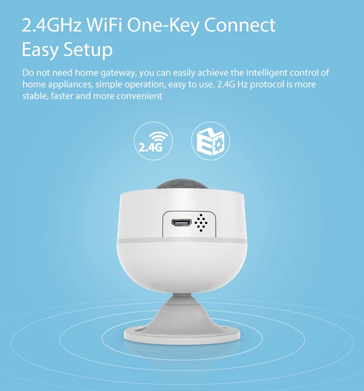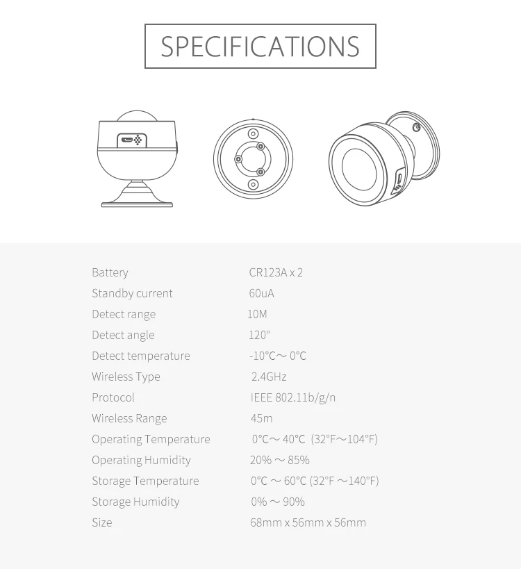 WiFi USB PIR Motion + Температура и влажность Функция анти-сноса, push уведомление, когда устройство удалено Аккумулятор: CR123A * 2-3 в Источник питания USB: 5 В/1 А Ток в режиме ожидания: 39,7ua Беспроводной частота: 2,4 ГГц Стандарт беспроводной связи: IEEE 802.11b/g/n Диапазон Wi-Fi: 45 м Угол чувствительности: 110 ℃ Чувствительное расстояние: 12 м Размер: 68 мм x 56 мм x 56 мм
