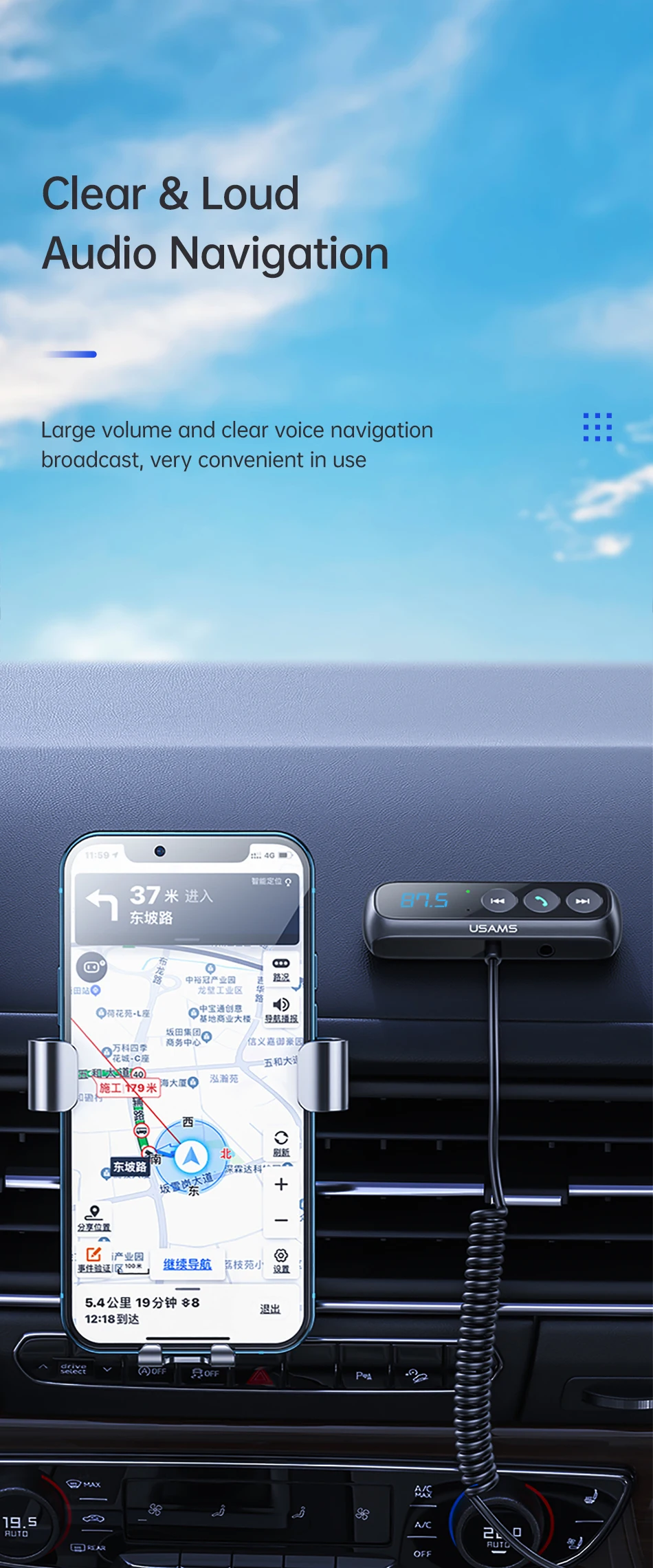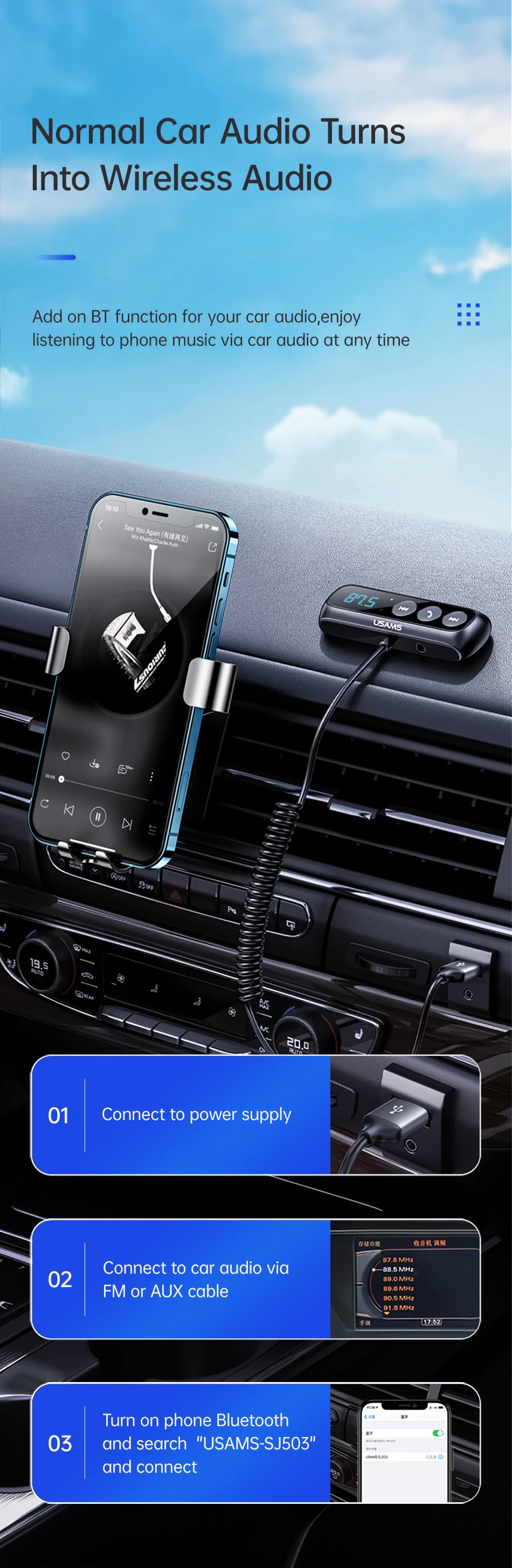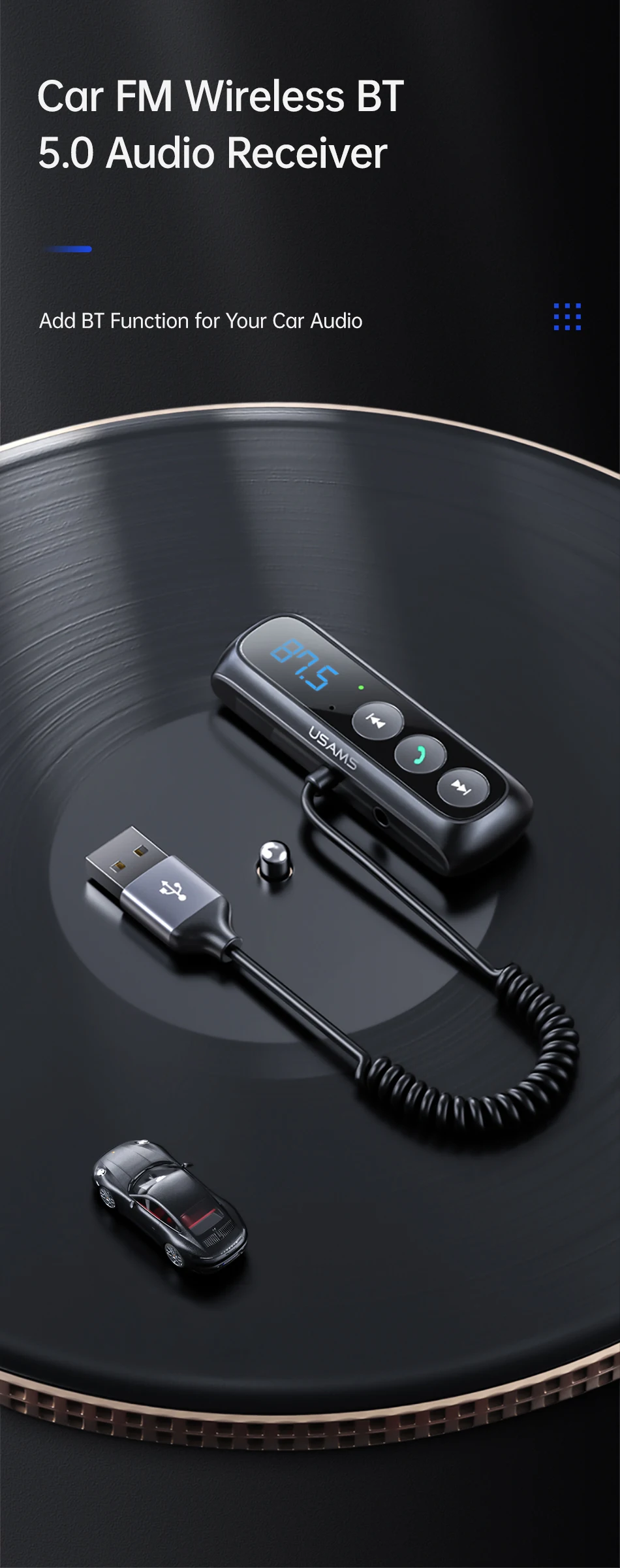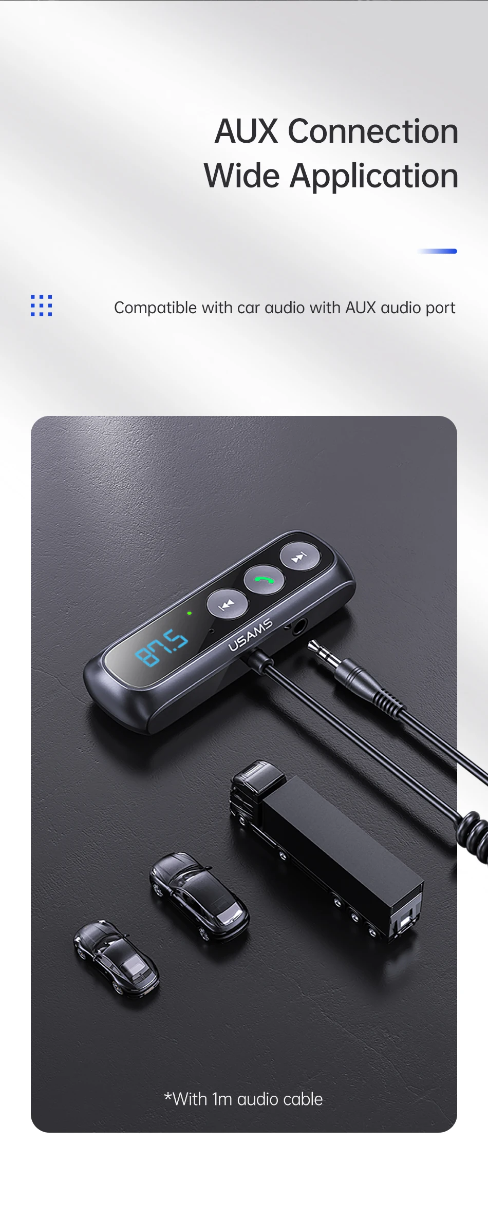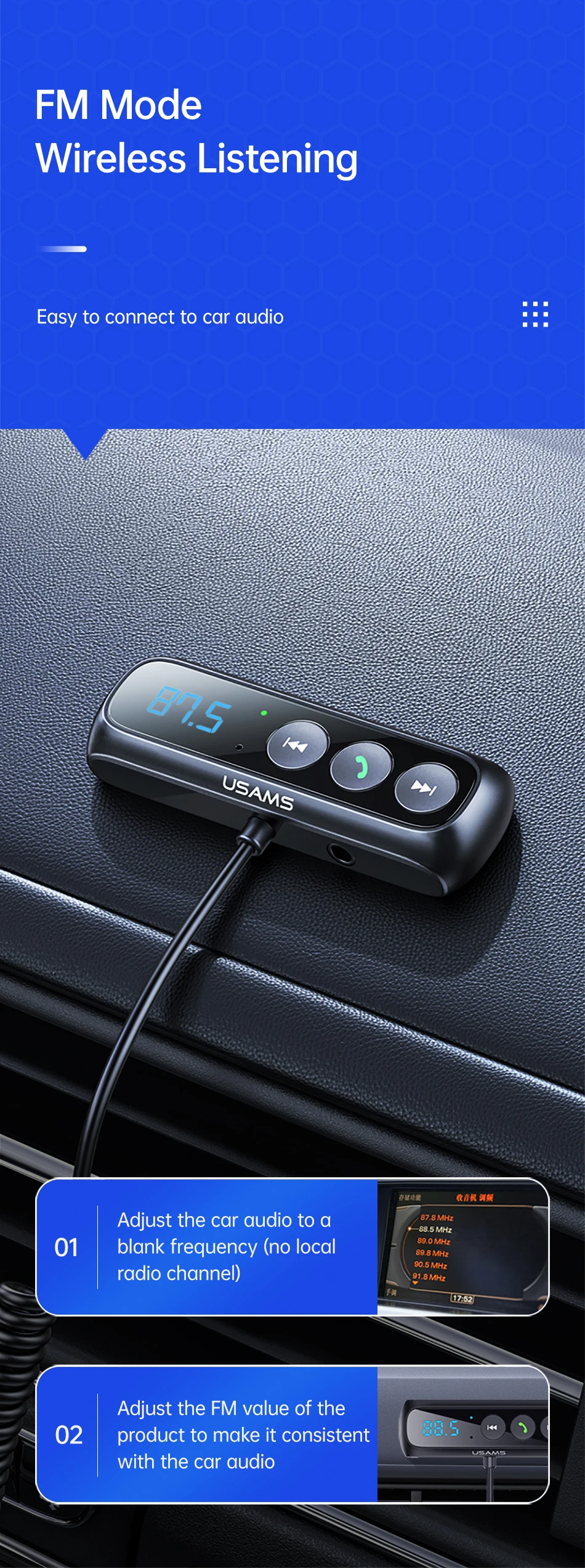 Нажмите и удерживайте многофункциональную кнопку в течение 2 секунд, цифра на светодиодный Дах мигает, настройте значение FM продукта, чтобы он соответствовал автомобильному аудио.
