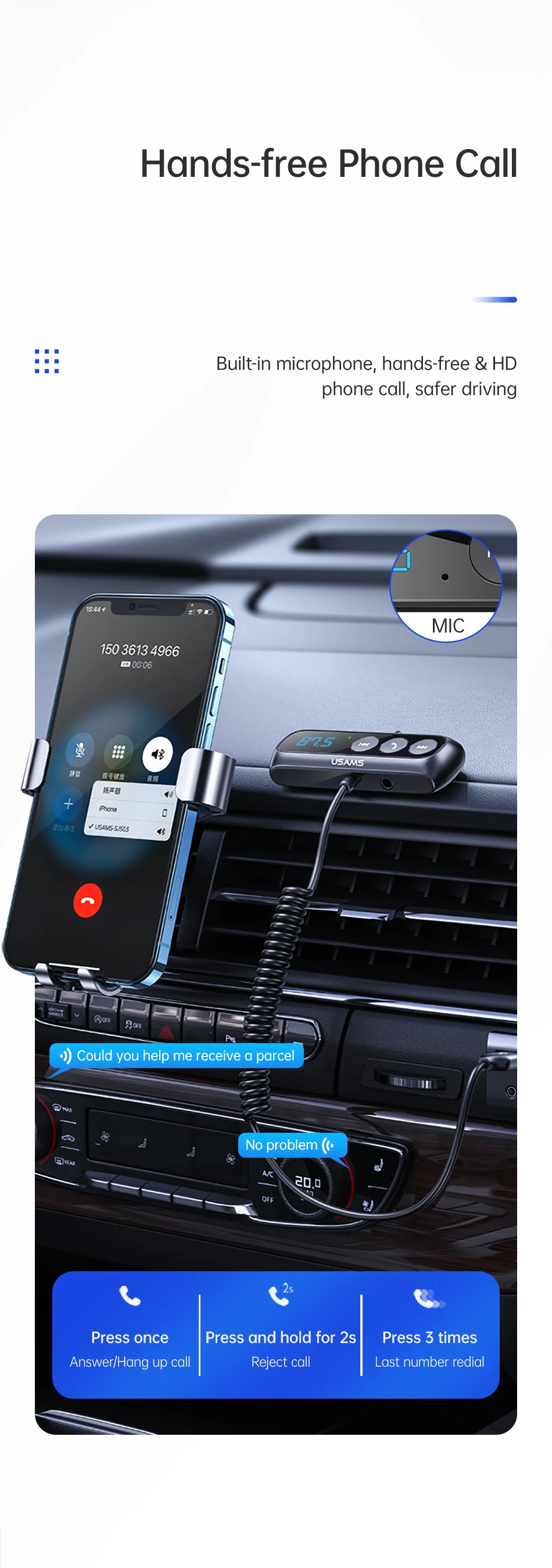 Переключатель Hands-free: во время вызова нажмите и удерживайте многофункциональную кнопку в течение 2 секунд, чтобы переключиться между частным голосовым приводом/громкоговорителем телефона.