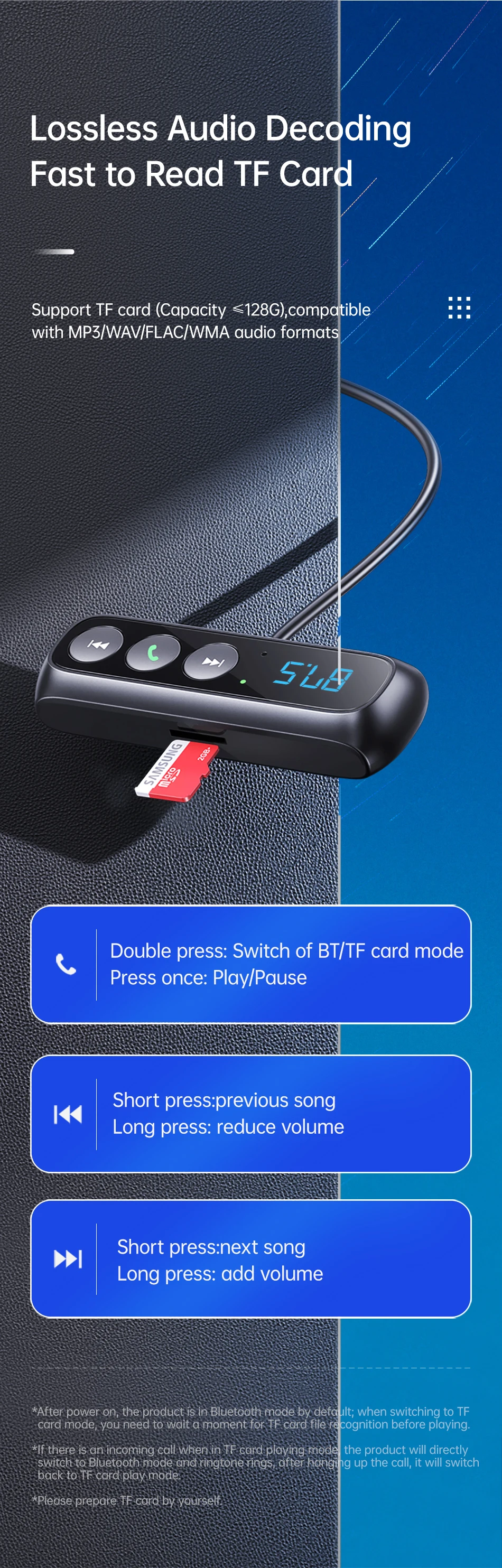 Поддержка TF-карт аудио форматов: MP3/WAV/FLAC/WMA