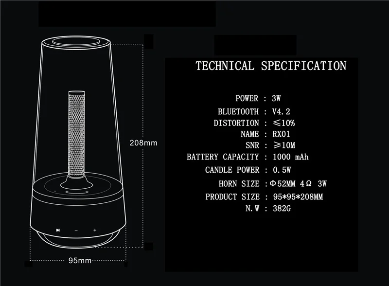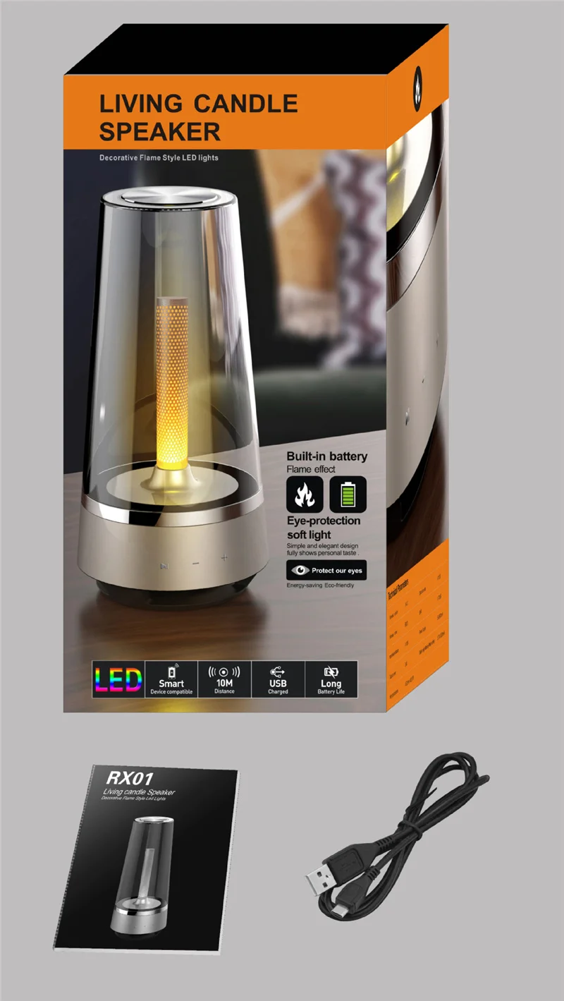 Особенности: Крутой светильник в форме свечи, атмосферная лампа с bluetooth-динамиком, новая модная акустическая лампа, праздничные подарки, креативный ночной Светильник -Встроенная литиевая батарея 3,7 V 1000mAh -Bluetooth-динамик: Наслаждайтесь музыкой высокого качества -Умный светильник свечи + дыхательная функция + bluetooth-динамик: теплая цветовая температура -Применение: (модный, удобный и полезный.) Ваш лучший выбор для вечерние, барбекю, Ночной светильник и т. Д. Характеристики: Светодиодный светильник Мощность динамика: 5 Вт Материалы: ABS + PS Цвет: прозрачный Тип: SMD Динамик с bluetooth Версия Bluetooth: V4.2 Расстояние передачи Bluetooth: более 10 м SNR: 75 дБ Степень искажений: в пределах 10% Название: RX01 Время зарядки: 4 часа Время использования: BT + светильник: 7 часов, только светильник: 30 часов