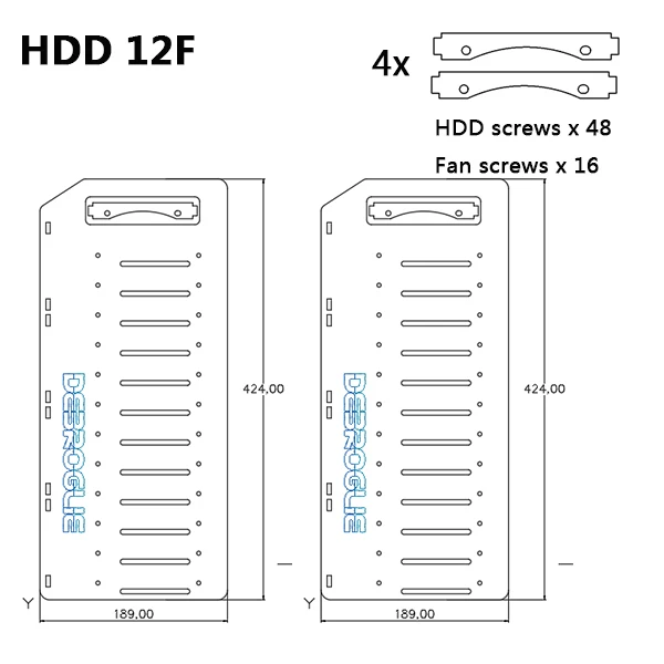 Кронштейн 12F: две боковые панели + 8 крепежных полос вентилятора + винты для крепления механического жесткого диска + винты для вентилятора