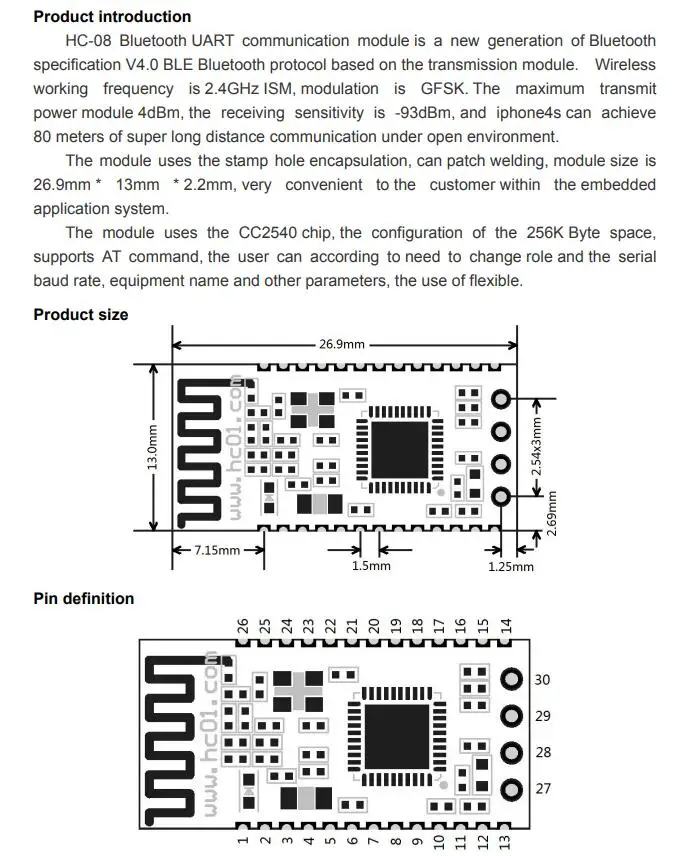 Модуль использует штамп отверстие инкапсуляции, может патч сварки, размер модуля 26,9 мм * 13 мм * 2,2 мм, очень удобно заказчику в встроенное приложение системы.