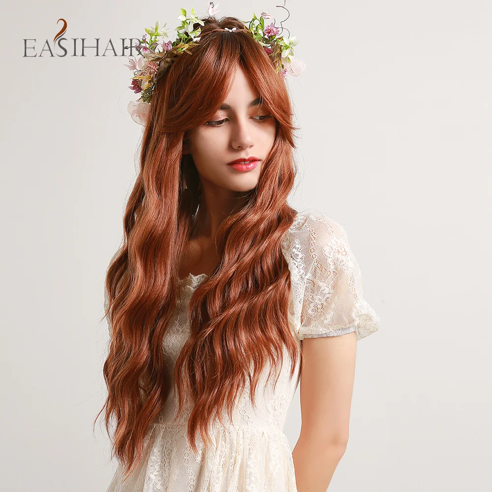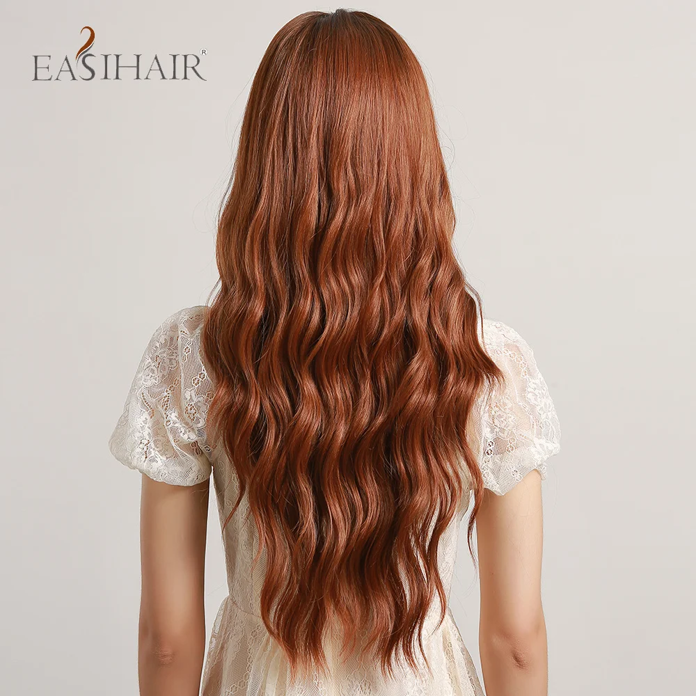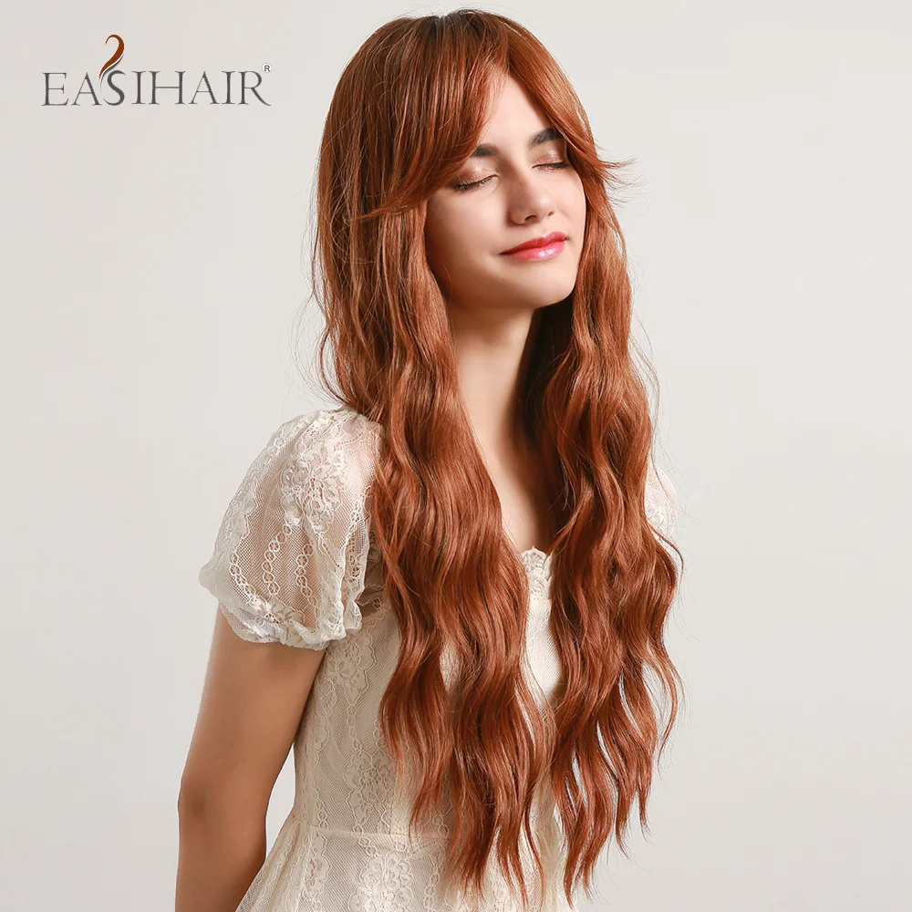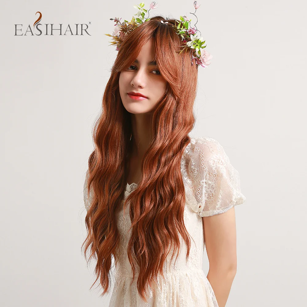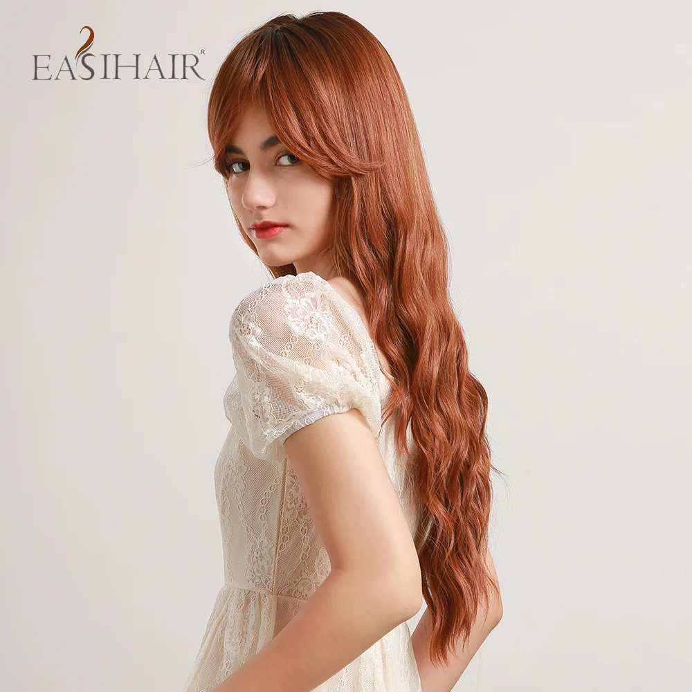 EASIHAIR Ombre Black Red Brown Amber Long Water Wave Synthetic Wig with Bang for Women Wedding Princess Hairstyle Heat Resistant
