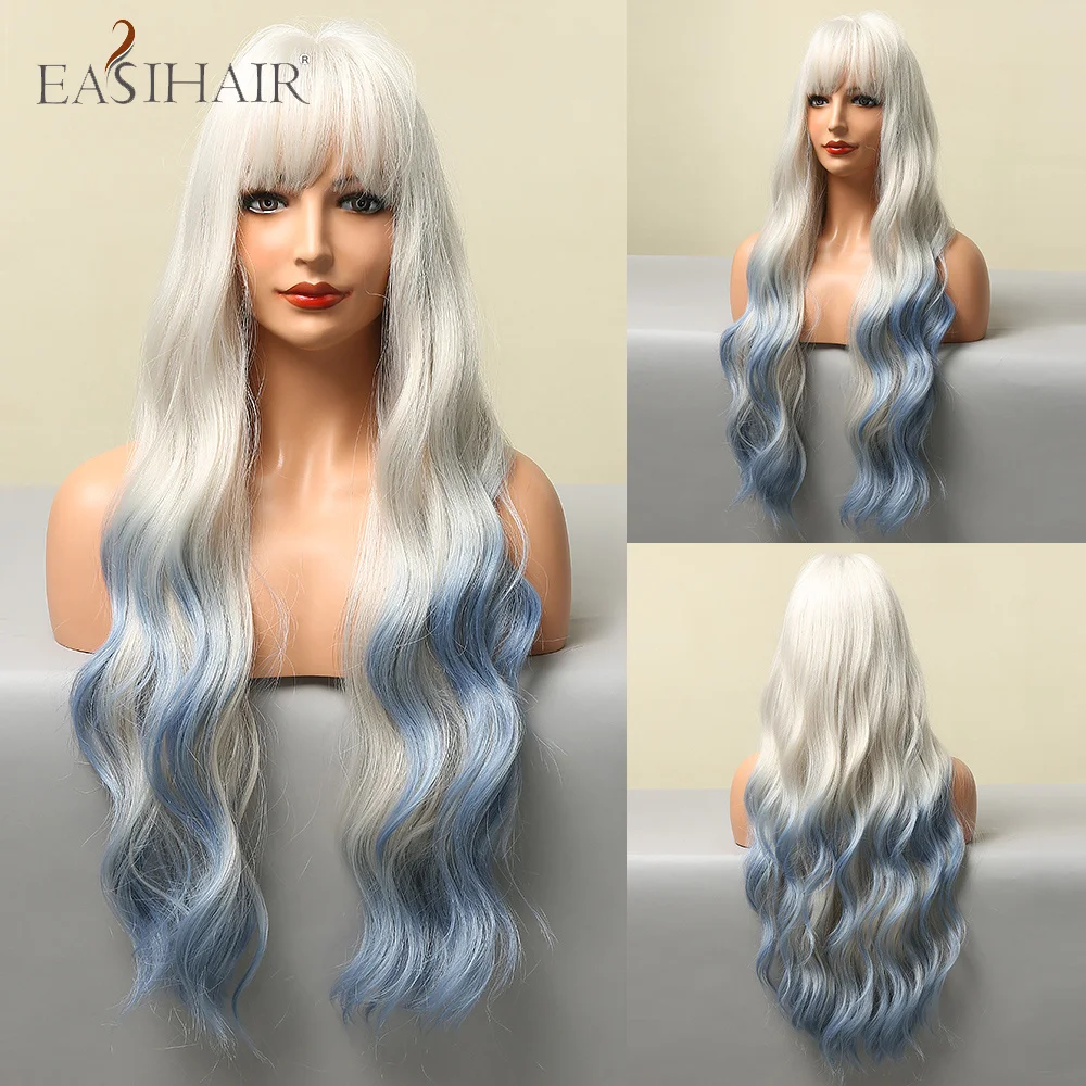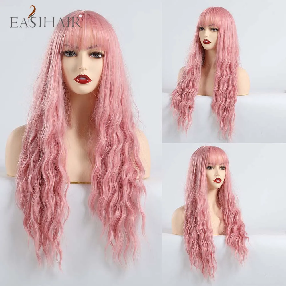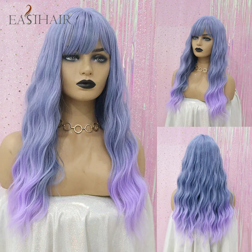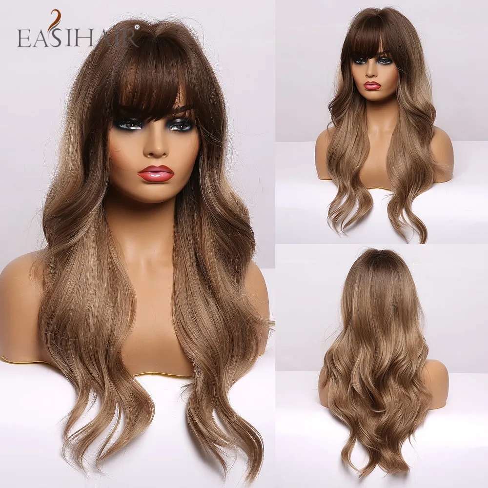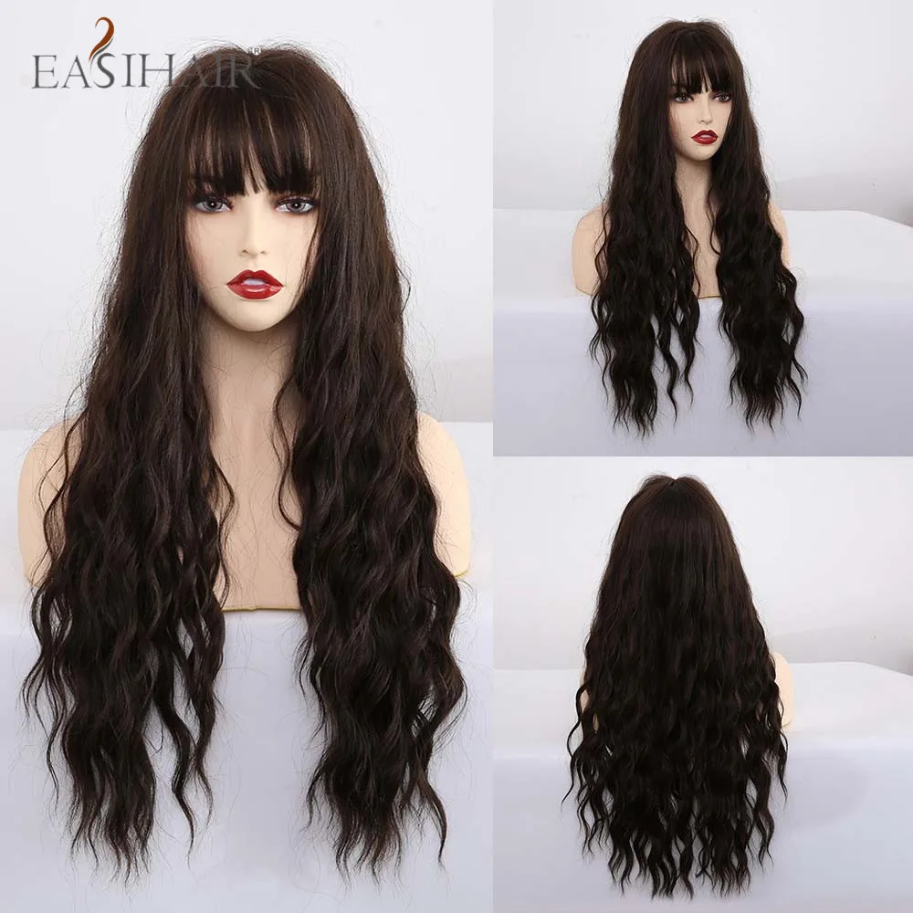 EASIHAIR Ombre Black Red Brown Amber Long Water Wave Synthetic Wig with Bang for Women Wedding Princess Hairstyle Heat Resistant