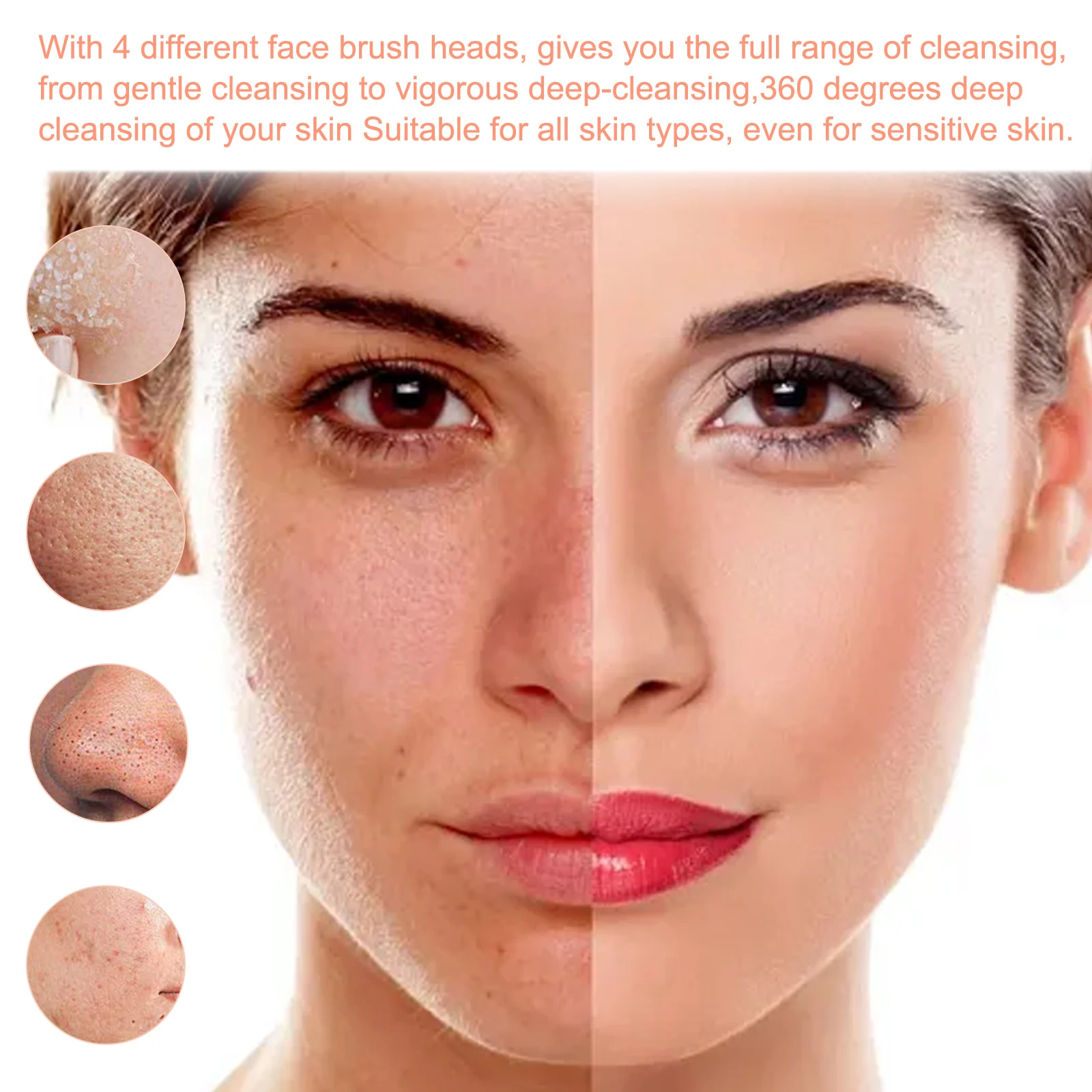 С 4 различными насадками для лица, дает вам полный спектр очищения, от мягкого очищения до энергичного глубокого очищения, глубокое очищение кожи на 360 градусов подходит для всех типов кожи, даже для чувствительной кожи.