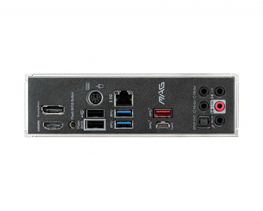 Interfaces: 1*RJ45/2*PS/2/6*USB2.0/3*USB3.2 GEN 1 based on Chipset/2*USB3.2 GEN 2 based on CPU/2*USB3.2 GEN 1 based on CPU/1*M.2 NVMe Lightning GEN 4 64Gbps/1*M.2 NVMe 32Gbps