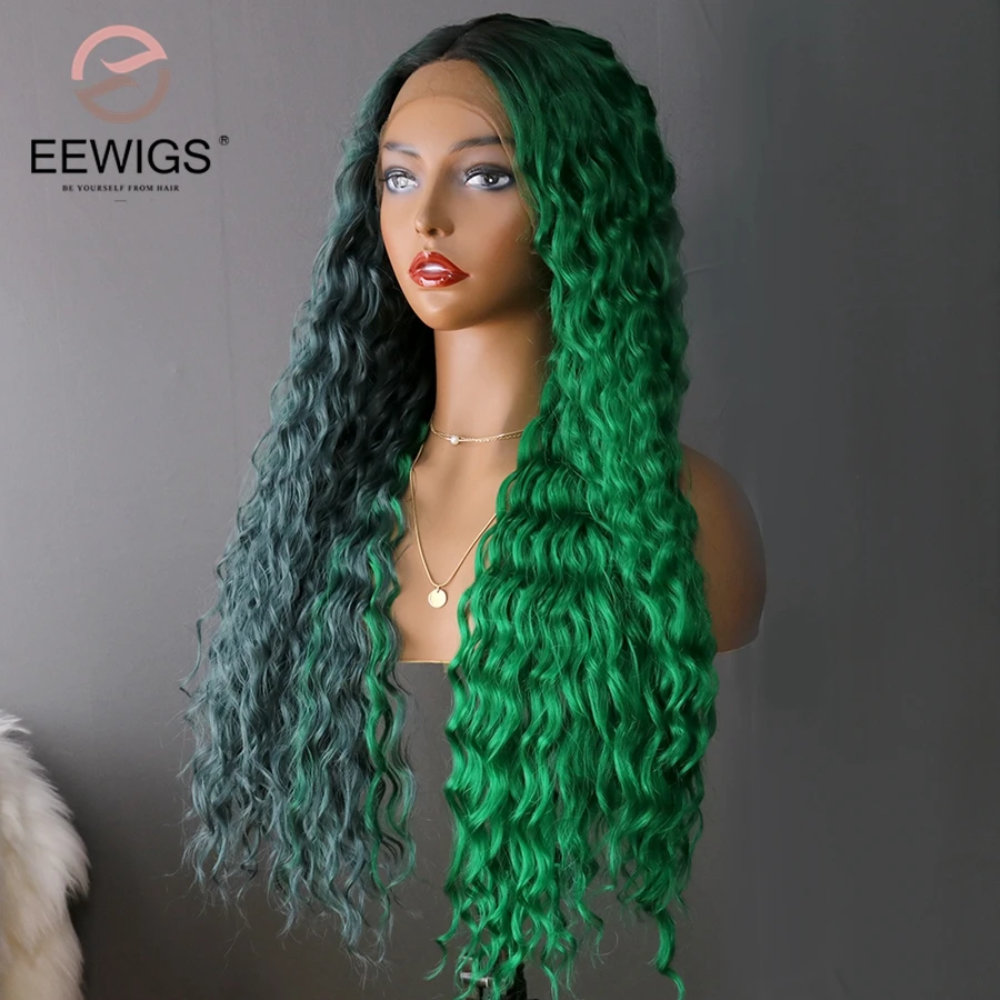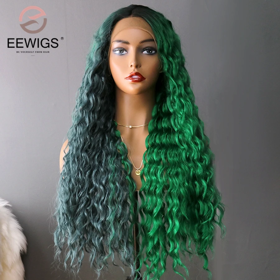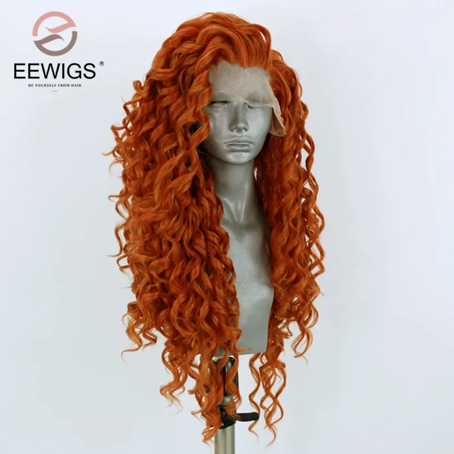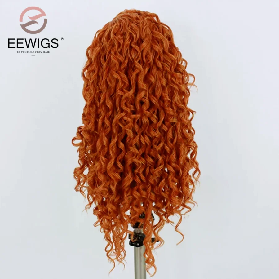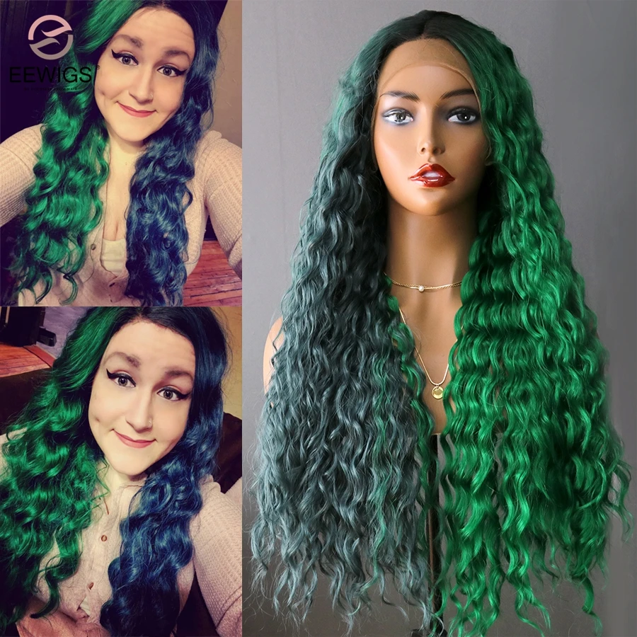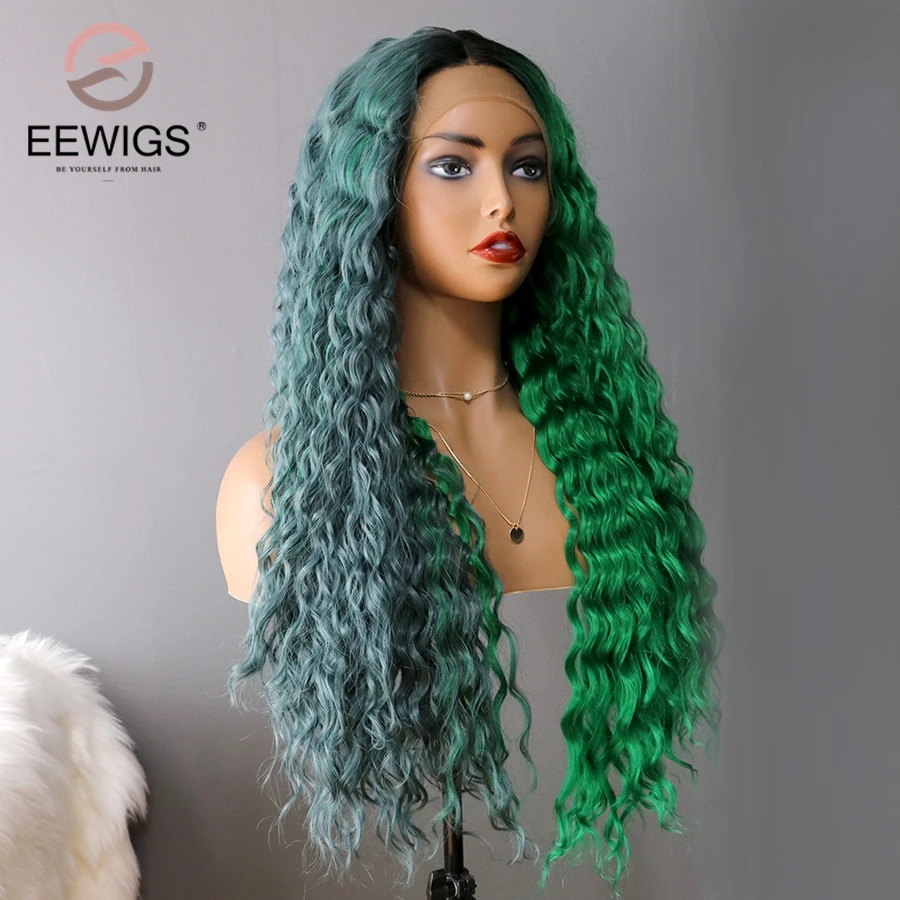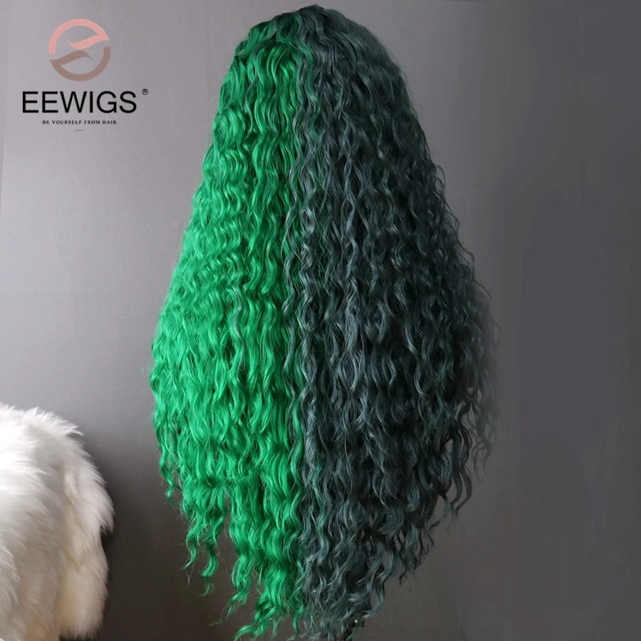Парики EEWIGS, полузеленые, полуголубые, кудрявые, синтетические, кружевные, передние парики, 180% плотность, Имбирные, вьющиеся, термостойкие, длинные, Косплей парики для женщин