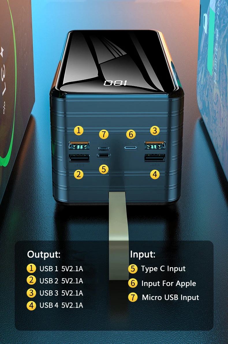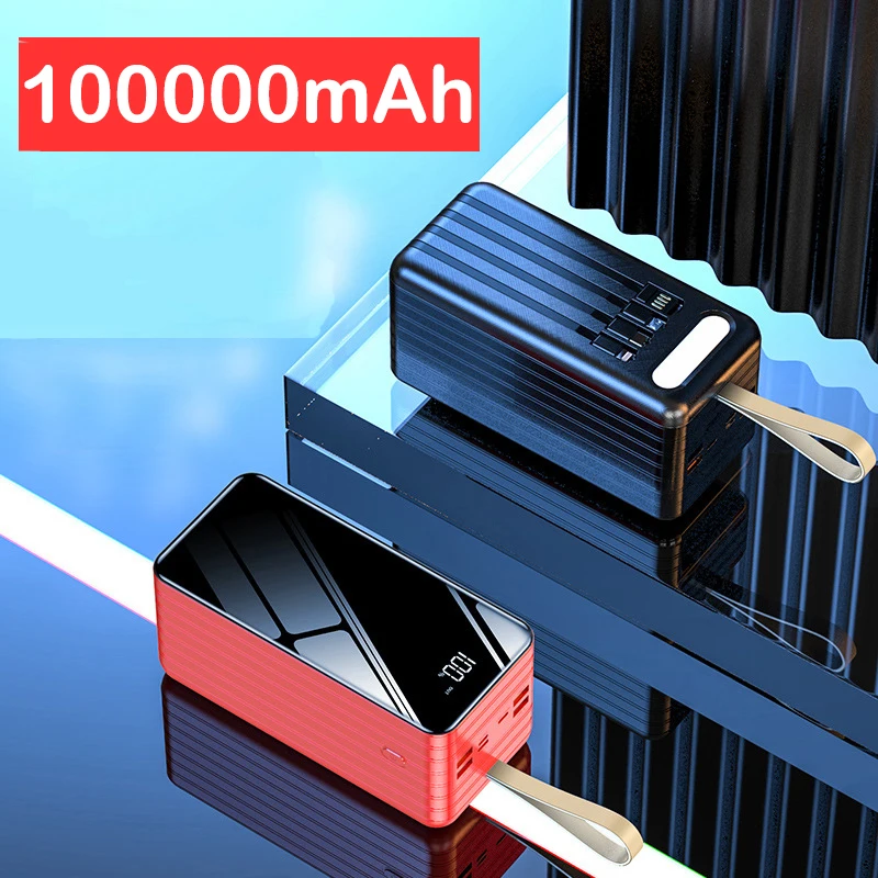 100000 мАч Внешний аккумулятор для iPhone Xiaomi Huawei Samsung Powerbank Встроенный кабель портативное зарядное устройство Внешний аккумулятор внешний аккумулятор для iPad планшетов ноутбуков