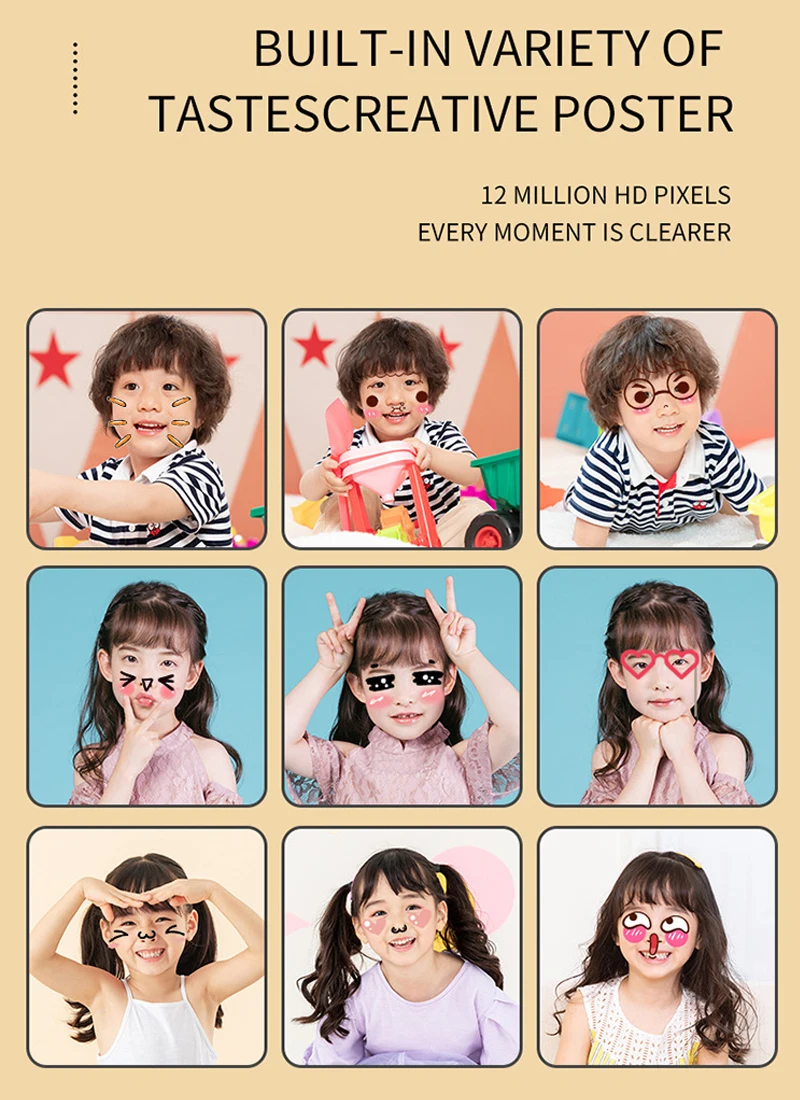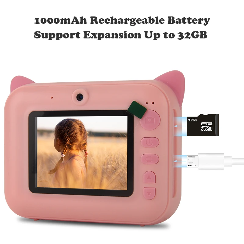 Детская видеокамера оснащена перезаряжаемой батареей емкостью 1200 мАч, ее можно зарядить, подключив кабель Micro USB к преобразователю питания 5 В, а время зарядки всего 2 часа. Он также поставляется с tf-картой 32G, позволяющей хранить тысячи фотографий.