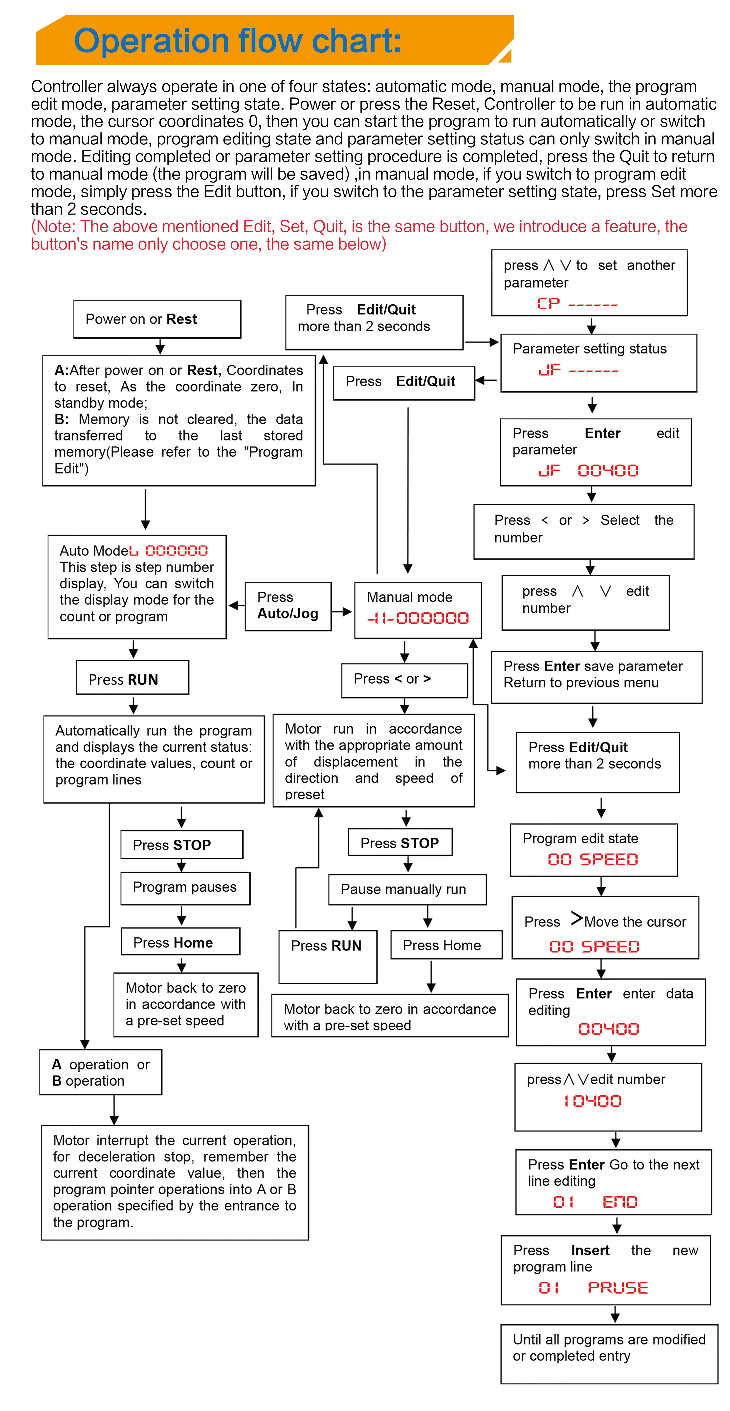 3. (Ограничение A) операция и (ограничение B) B операция являются Основной особенностью этого контроллера: для шаговых двигателей мы, как правило, выполняем количественный контроль позиционирования, например, управление двигателем для работы с определенной скоростью и определенным перемещением. Этот метод легко решить, просто программируйте скорость и смещение. Но существует довольно много элементов управления, которые не могут быть расположены заранее. Например, шаговый двигатель Управляется, чтобы работать в одном направлении от начальной точки до тех пор, пока он не остановится, когда он попадает в дорожный переключатель, и, конечно, он работает в обратном направлении и возвращается в исходную точку. К другому примеру, шаговый двигатель должен возвратно-поступательным образом n раз между двумя ограничительными переключателями и так далее. В ходе этих операций мы не знаем конкретное значение смещения шагового двигателя заранее, как мы должны программировать его? В этом контроллере используется: «Операция прерывания», которую мы называем «(предельное положение A) операция» и «(предельное положение B) операция B». Выберите «(предельное положение A) операцию» в качестве примера, рабочий поток: когда программа работает, если «(предельное положение A) операция» является входной снова, двигатель будет замедляться и останавливаться, программа прерывается здесь, и программа записывается, удерживает координаты перерыва, Программа переходит к программе, указанной адресом входа «(Ограничьте A) операции» для запуска программы.