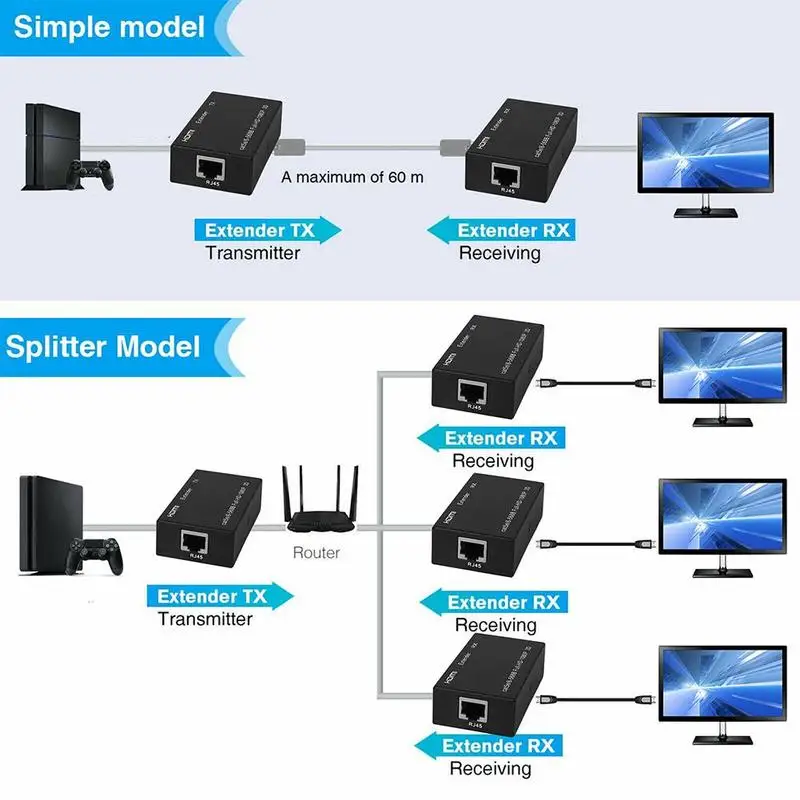 3. Use a cat5e cable or cat6 cable (recommended) to replace the HDMI-compatible cable to connect the emitter and receiver of the extender up to 60 meters