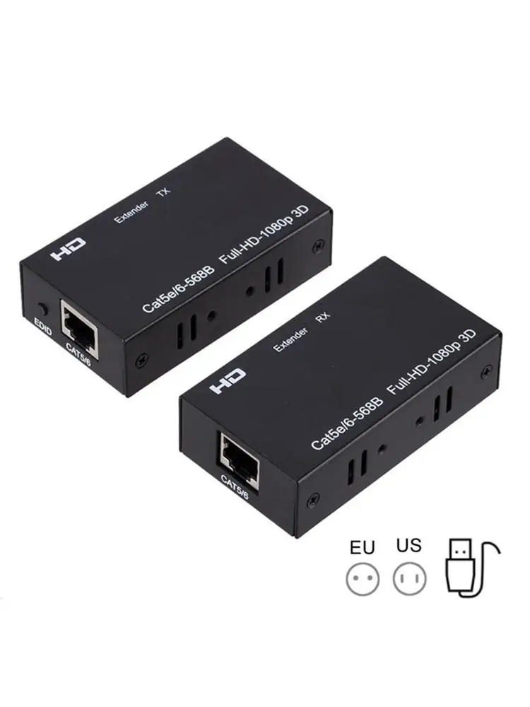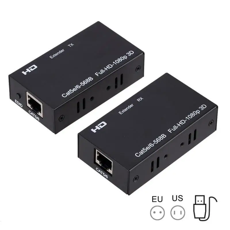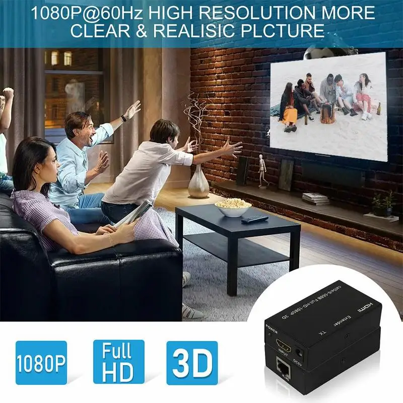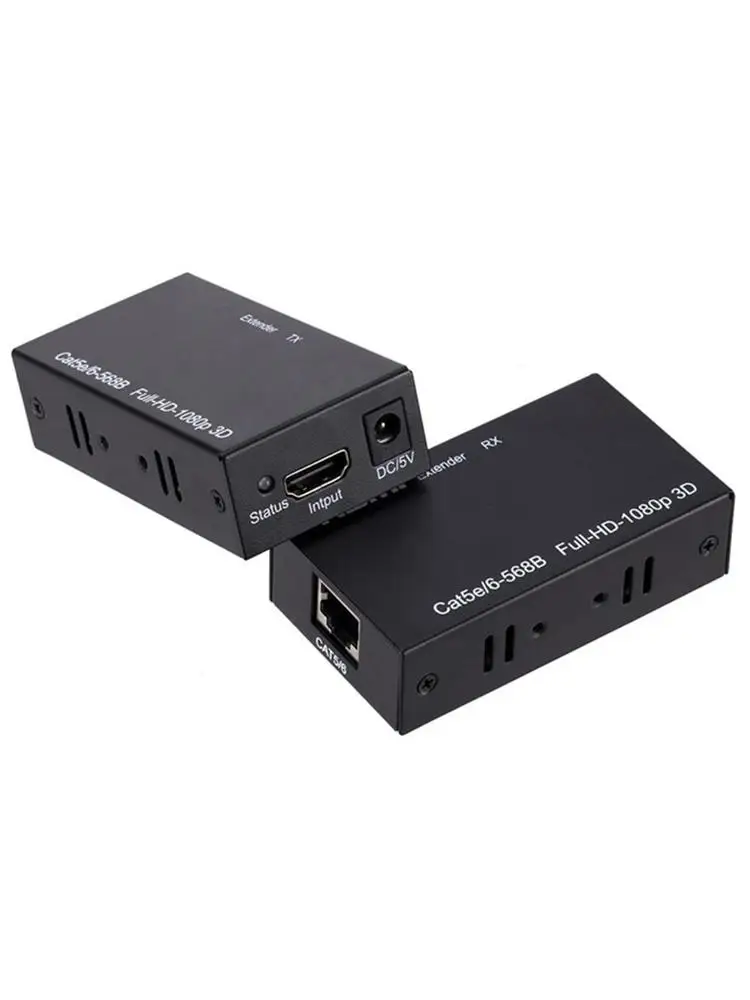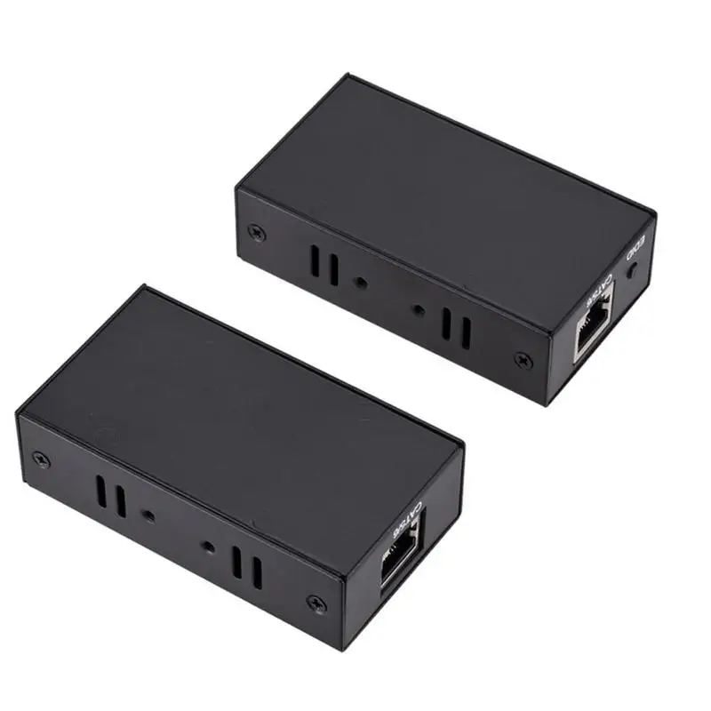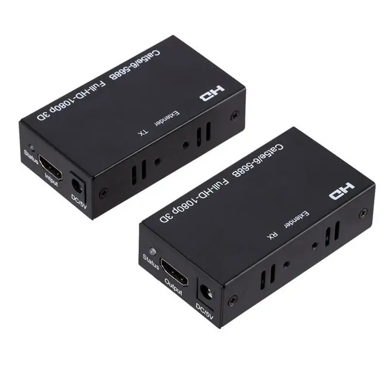 The HDMI-compatible network extender replaces the HDMI-compatible cable over a CAT5e or CAT6 cable (recommended) and can extend the HDMI signal for 60 meters, reducing costs. As HDMI cables are expensive, it is very difficult to transmit HDMI-compatible signals over long distances. The purpose of the extender is to achieve long-distance signal transmission with low-cost wires.