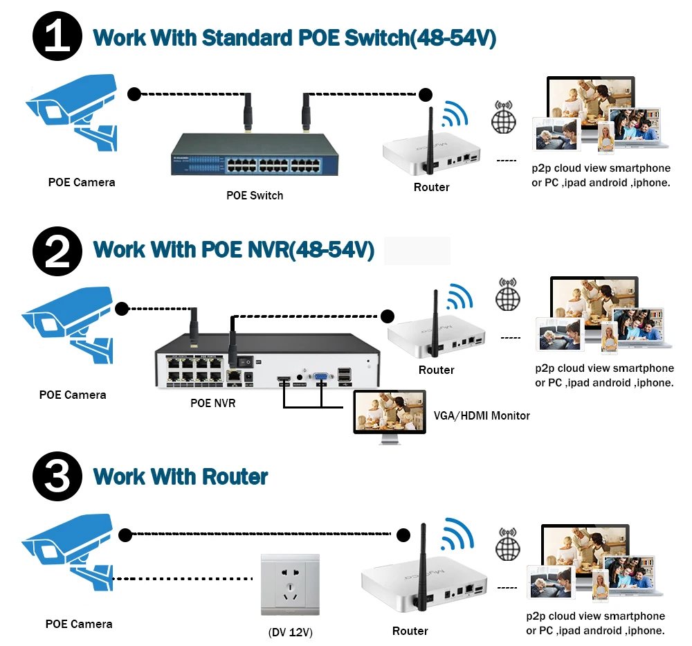 NO extra power cables or adapters are needed and just by connecting a IP camera to NVR with a single cable,you can easily complete the installation without the knowledge about the computer or network and start enjoy the super easy monitoring among your smart-phone,tablet or PC.