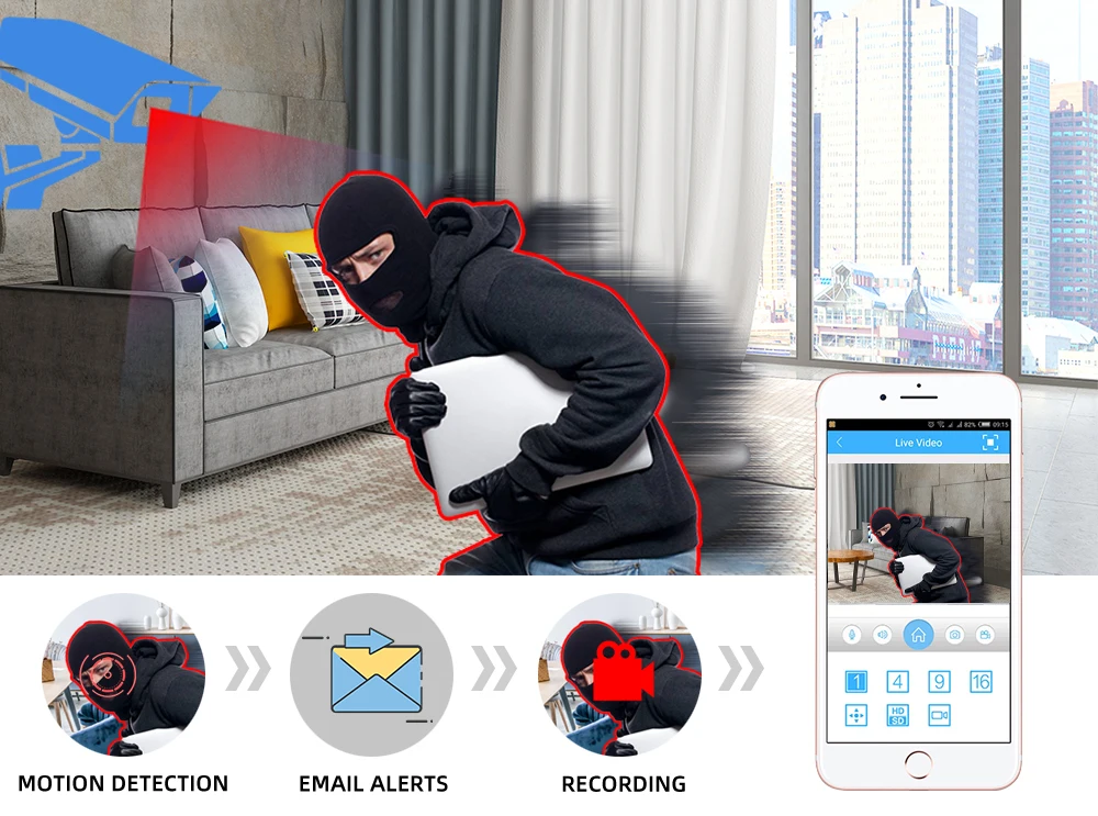 Can set up the area you want to control,When it is triggered,it will send message to your email ,You can get the first hand information ,no matter when and where you are .