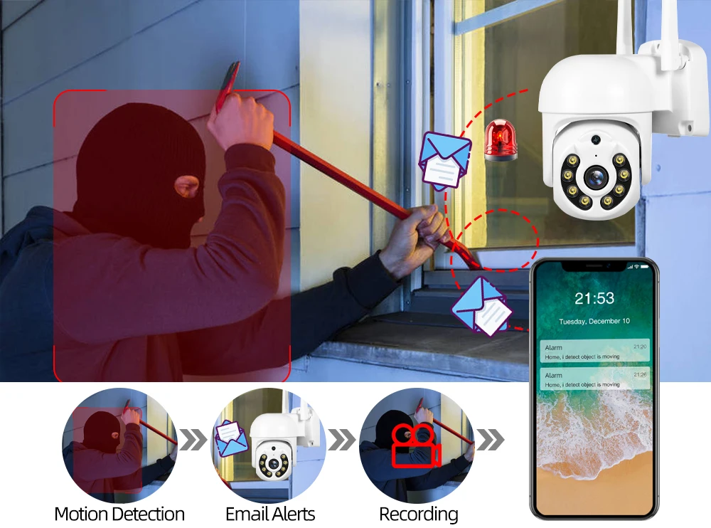 This PTZ Camera system is designed to send an email alert when any motions are detected and allows you to record only when motion is detected.Can set up the area you want to control,When it is triggered,it will send message to your email ,You can get the first hand information ,no matter when and where you are .