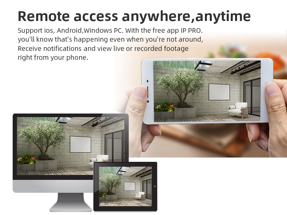 Support ios, Android,Windows PC. With the free app IP PRO. you'll know that's happening even when you're not around, Receive notifications and view live or recorded footage right from your phone.