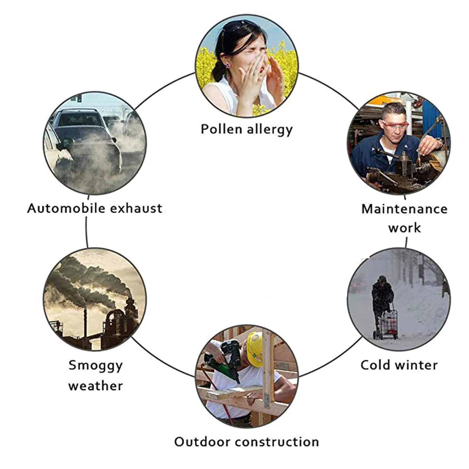 Он может защитить ваш рот и лицо от пыльцы, золы, тумана и дымки, выхлопных газов автомобиля и пассивного курения.