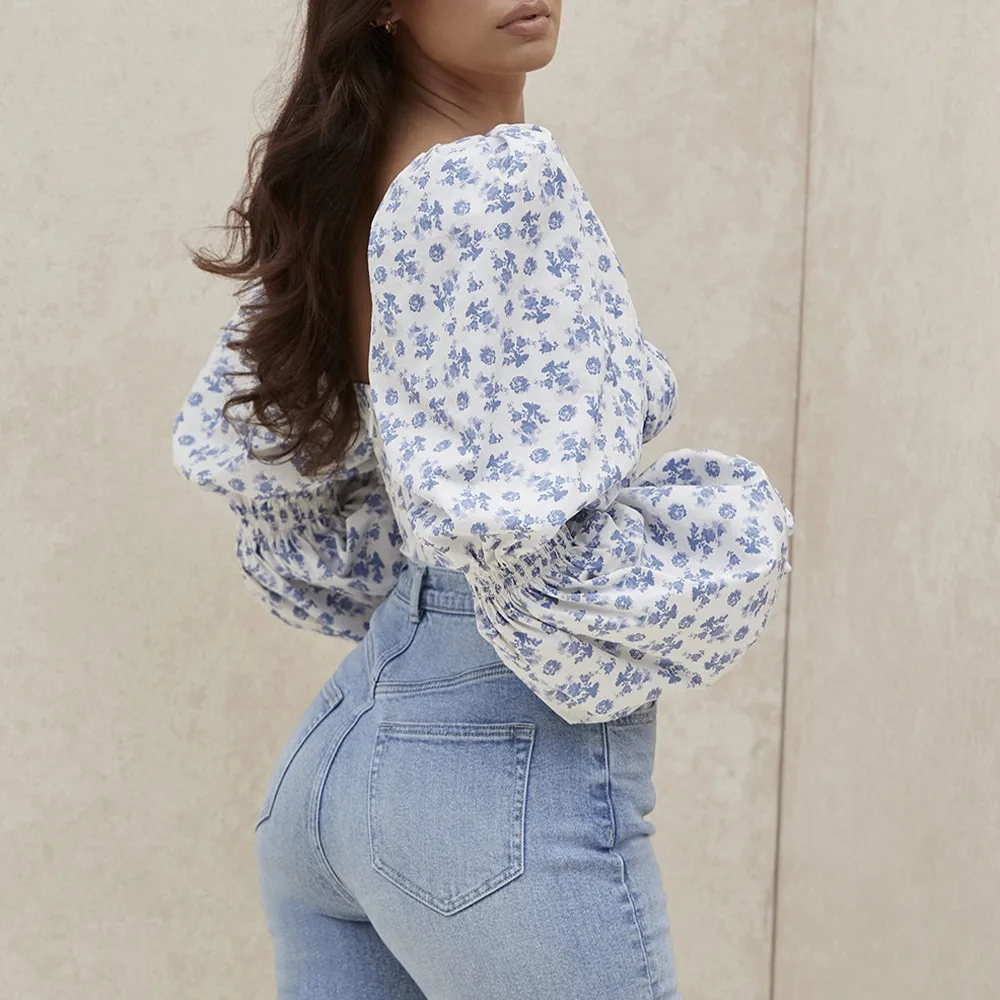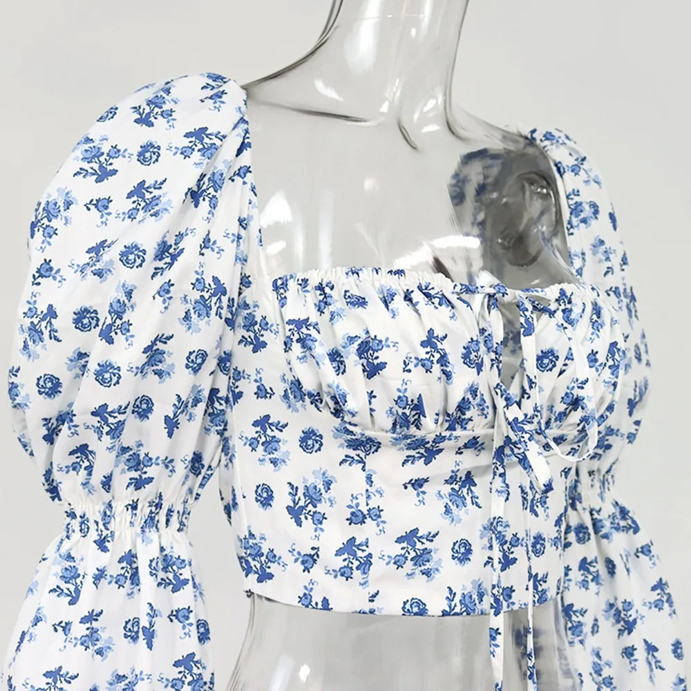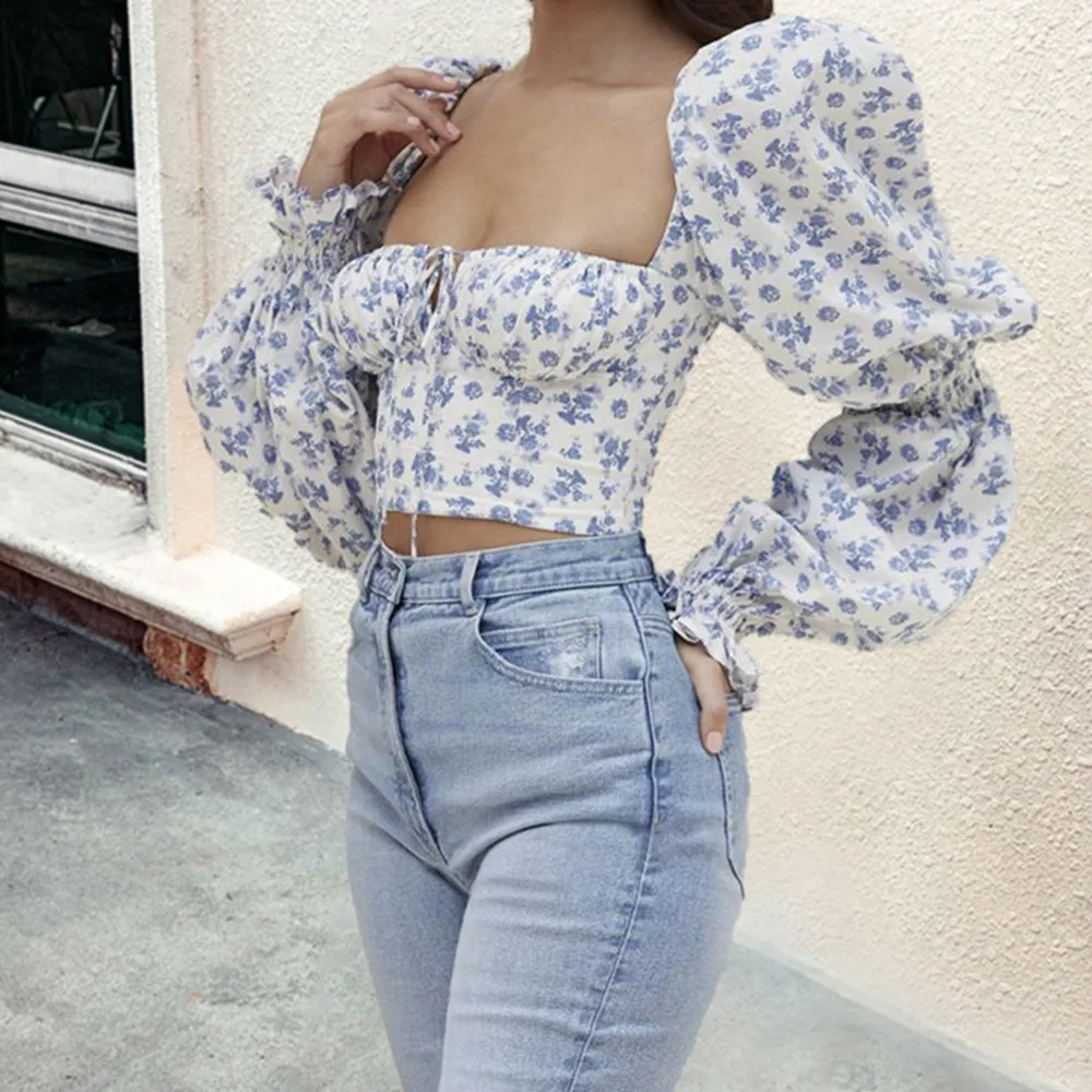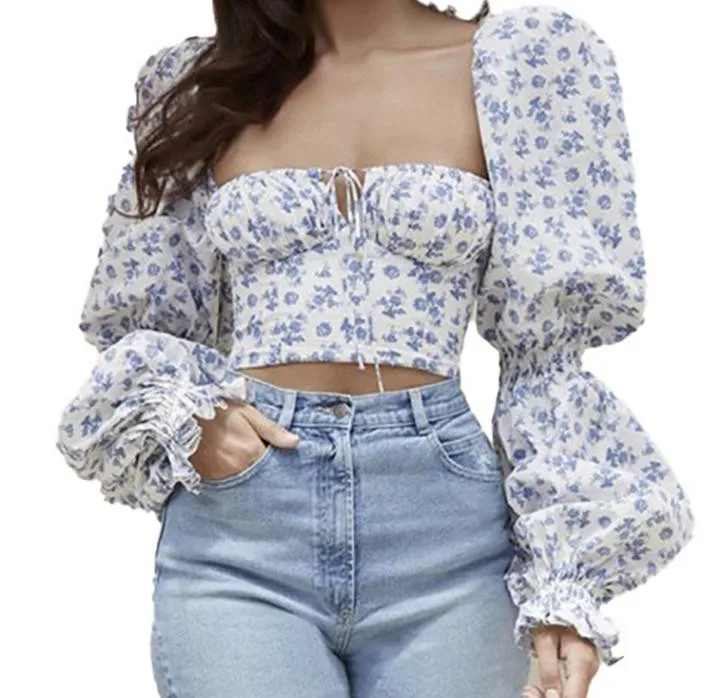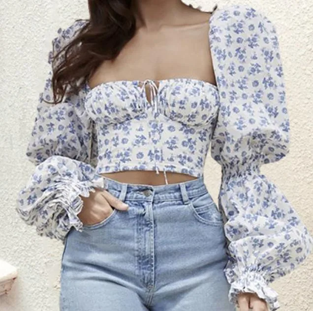 * Описание товара:Синий цветочный принт галстук спереди квадратный воротник Пышный рукав элегантная винтажная Сексуальная рубашка Топ