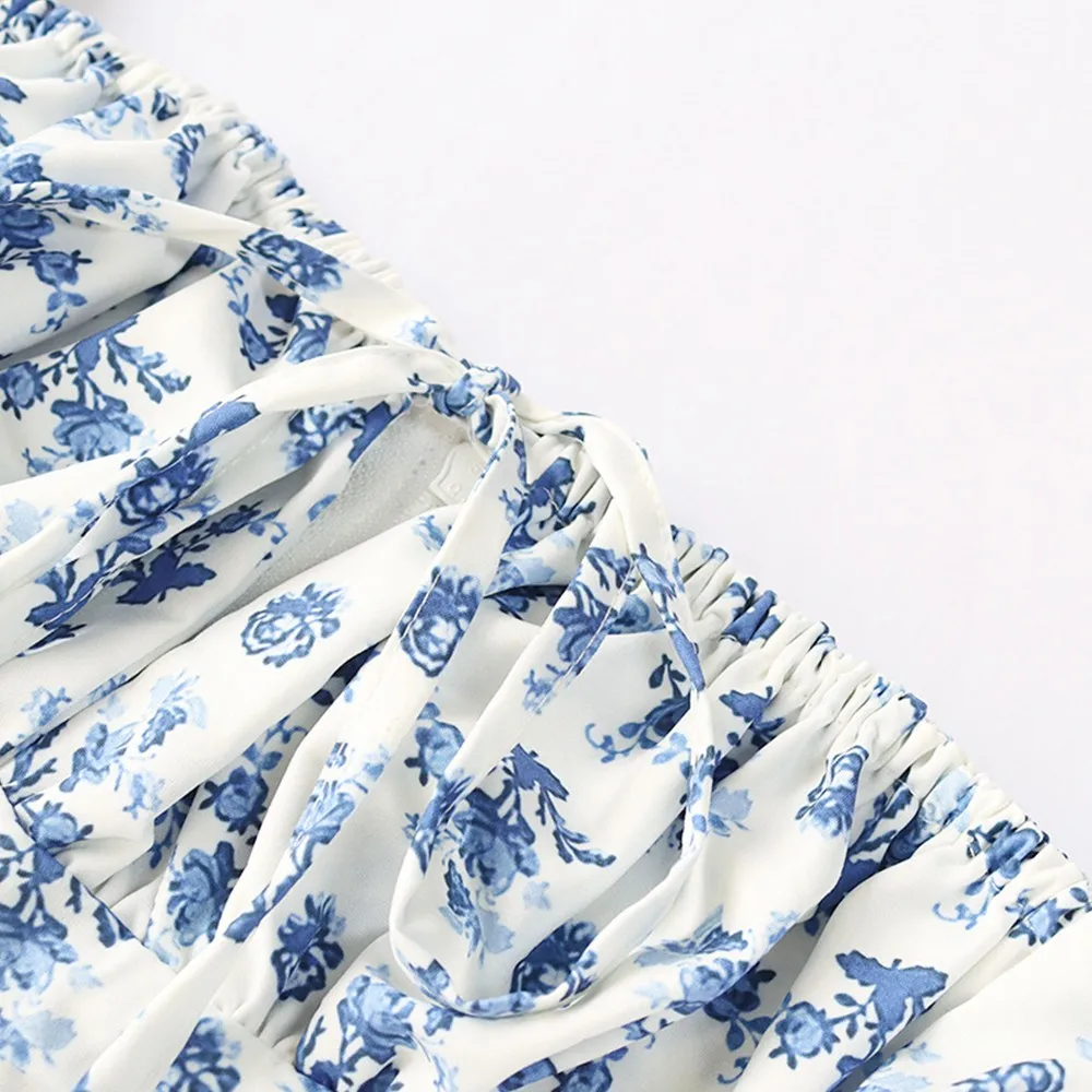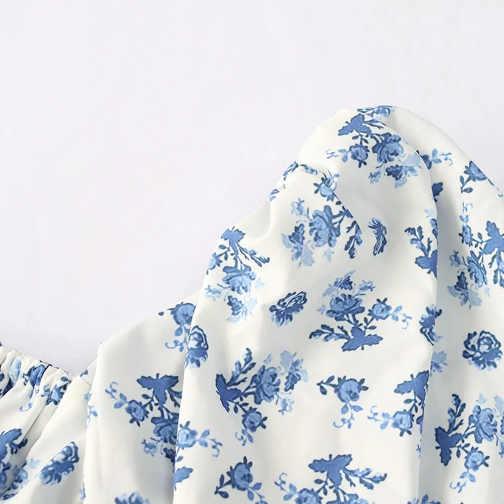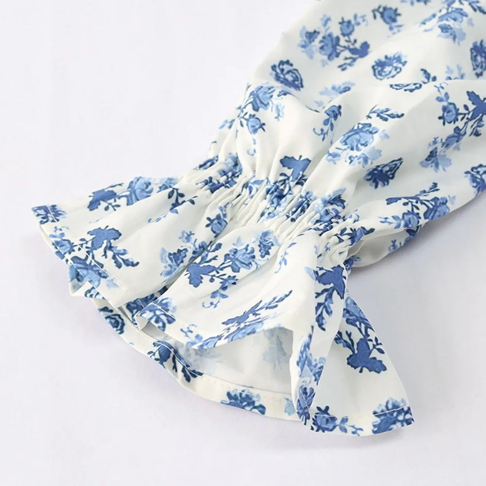 * Описание товара:Синий цветочный принт галстук спереди квадратный воротник Пышный рукав элегантная винтажная Сексуальная рубашка Топ