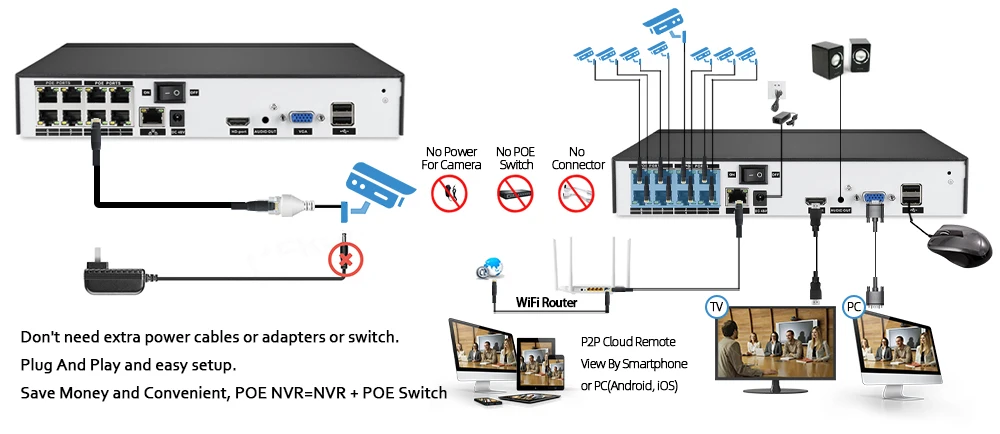 Нет дополнительных кабелей питания или адаптеров, просто подключив ip-камеру к NVR с помощью одного кабеля, вы можете легко завершить установку без знания о компьютере или сети и начать наслаждаться супер простым мониторингом среди вашего смартфона, планшета или ПК.