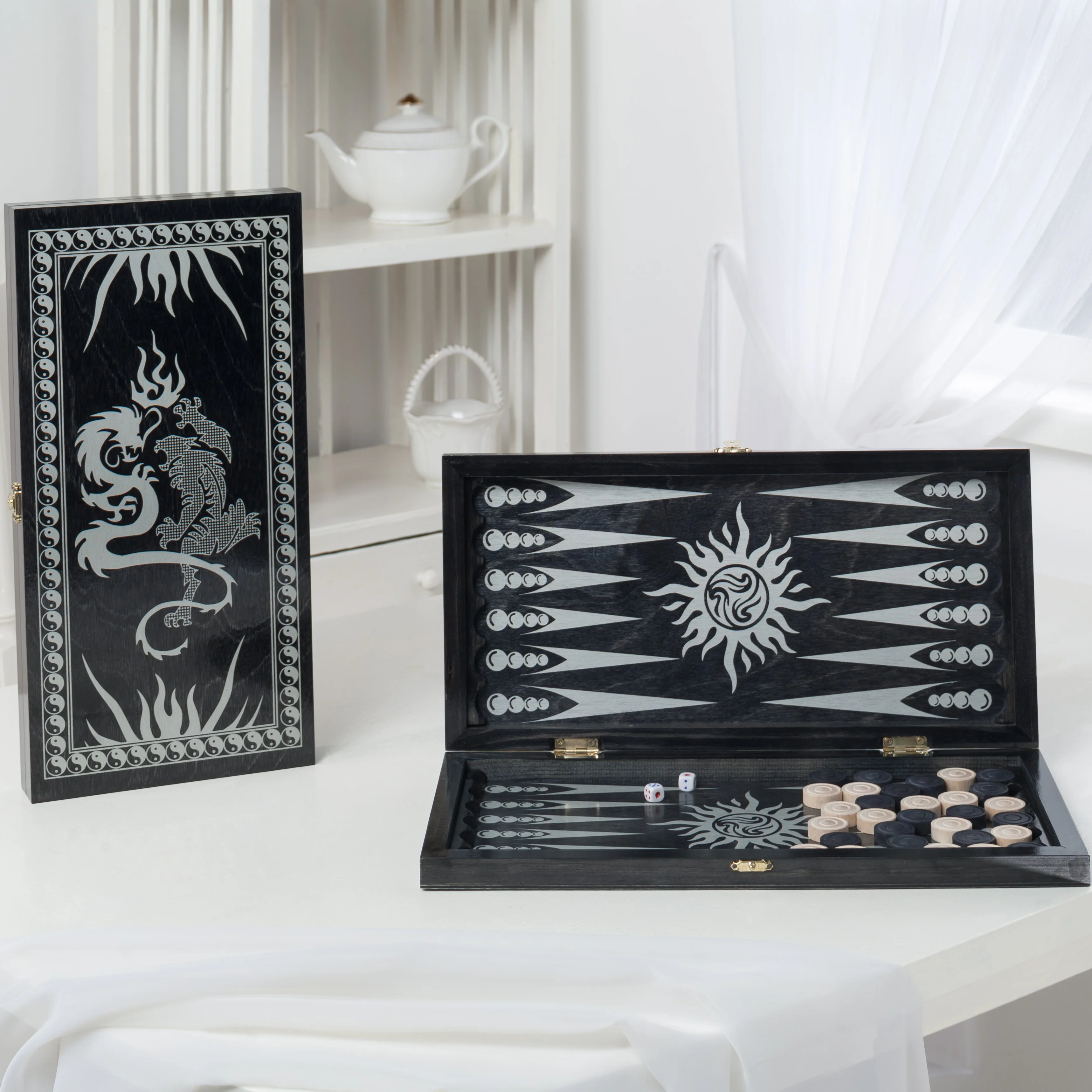 Game of backgammon. Wood of coniferous, hardwood. Plywood stained in black color, pattern silkscreen silver, coating soil, lacquer. Wooden Chips-height 10mm * d25-30 PCs, Bury-2 PCs Board size 400*200*40 in thermal package. Weight: 0.550 weight: 550g package height: 40mm package depth: 200mm features: fast delivery. Simple refund up to 60 days. Dimensions: 20.000/40.000/4.000 country of origin: Russia type: backgammon packing width: 400mm