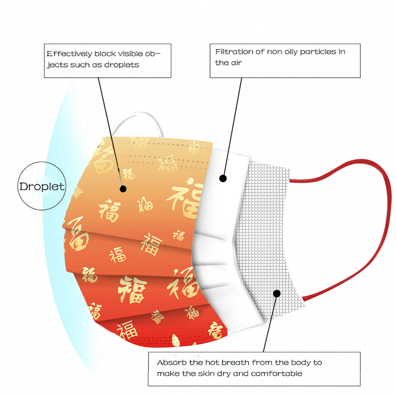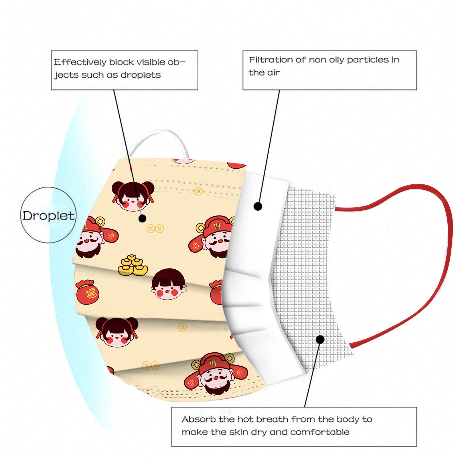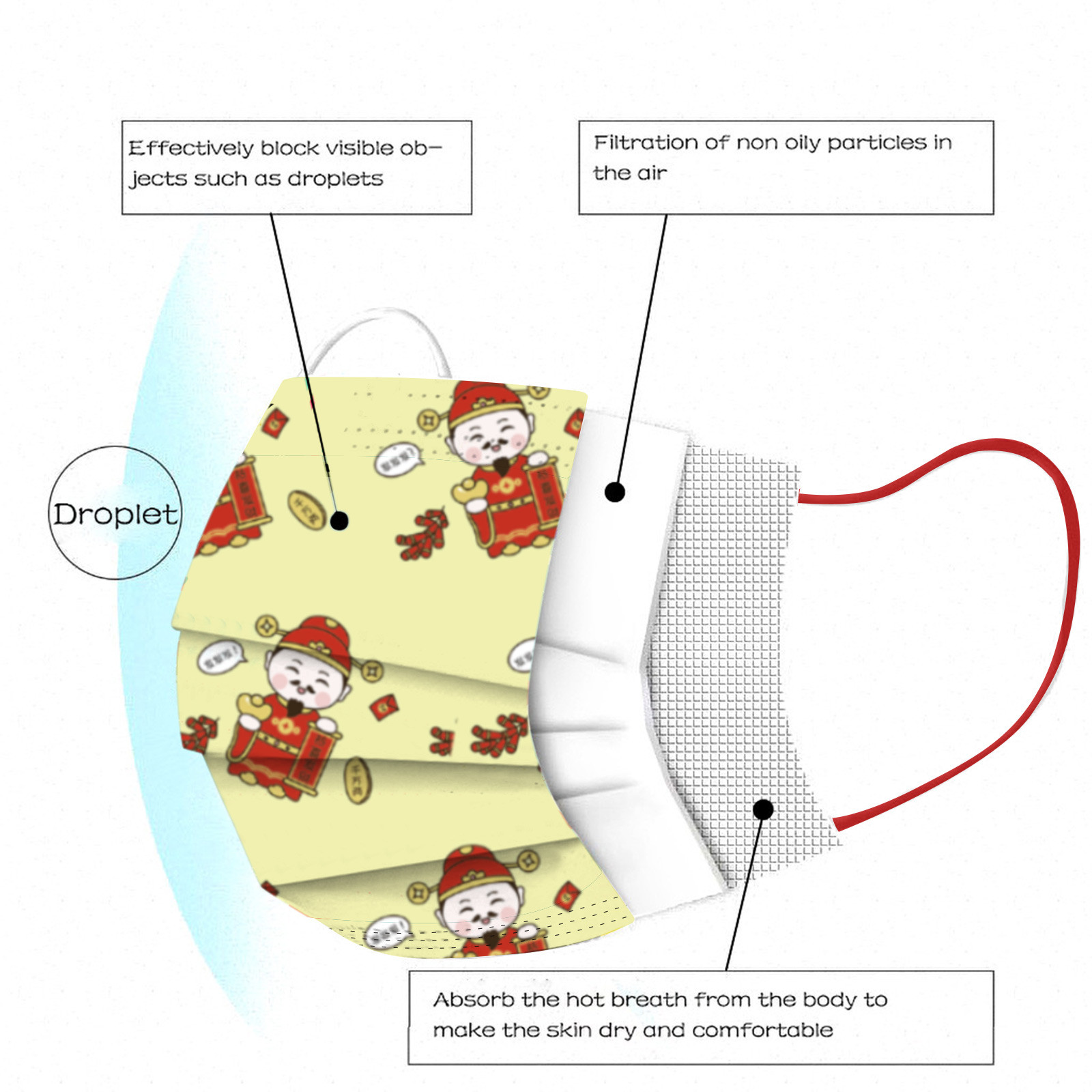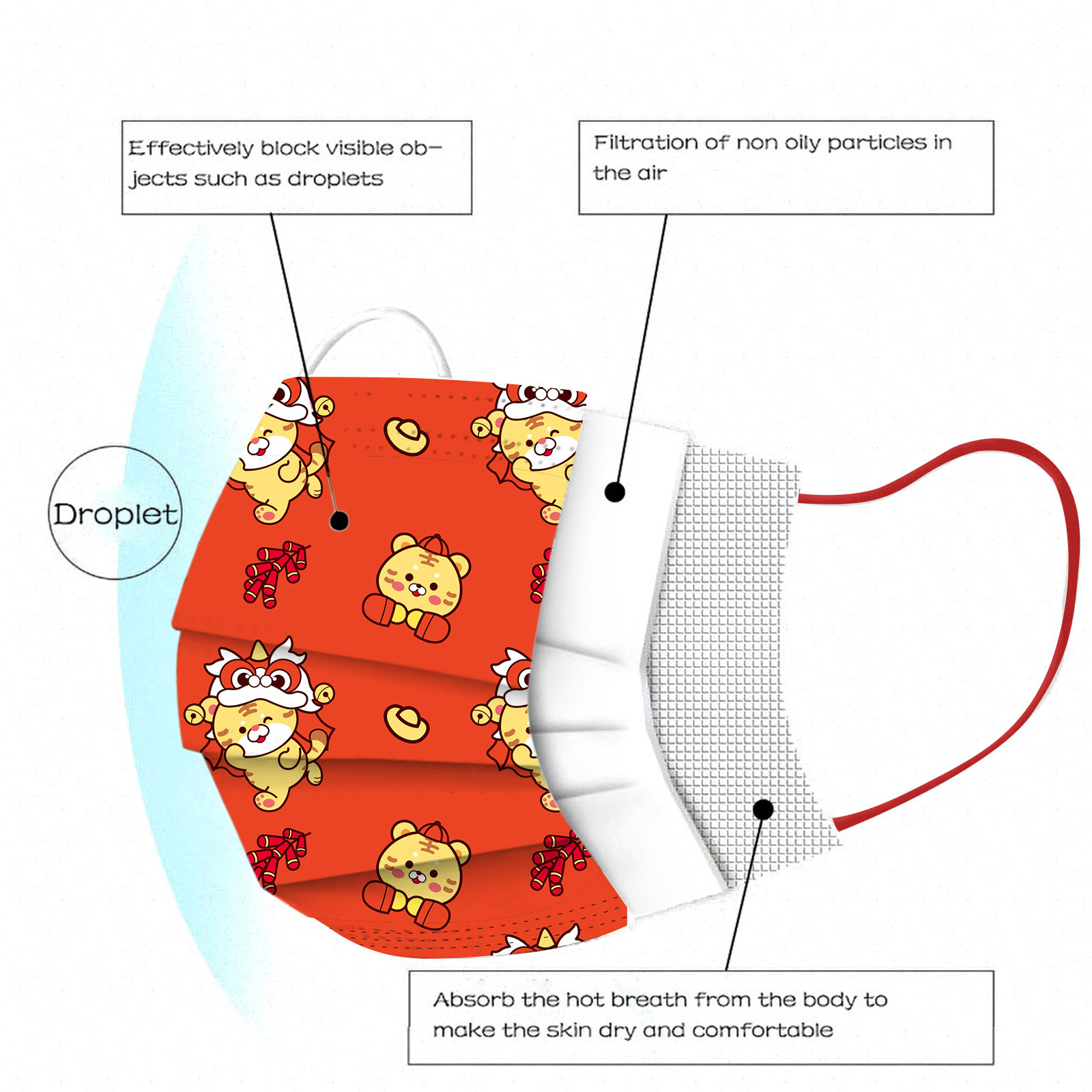 Breathable material and cute patterns, which makes it useful and fashionable. Special 3 ply non-woven design, provides some protections against automobile exhaust, pollen, etc.