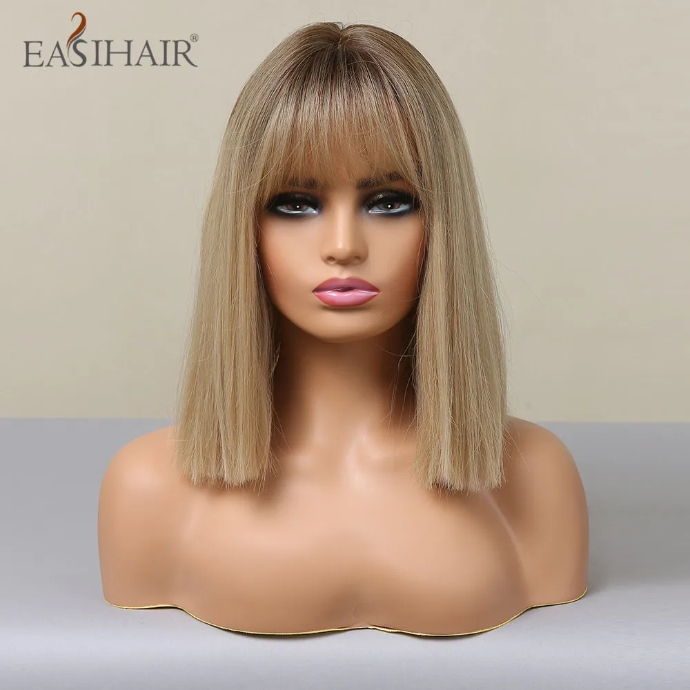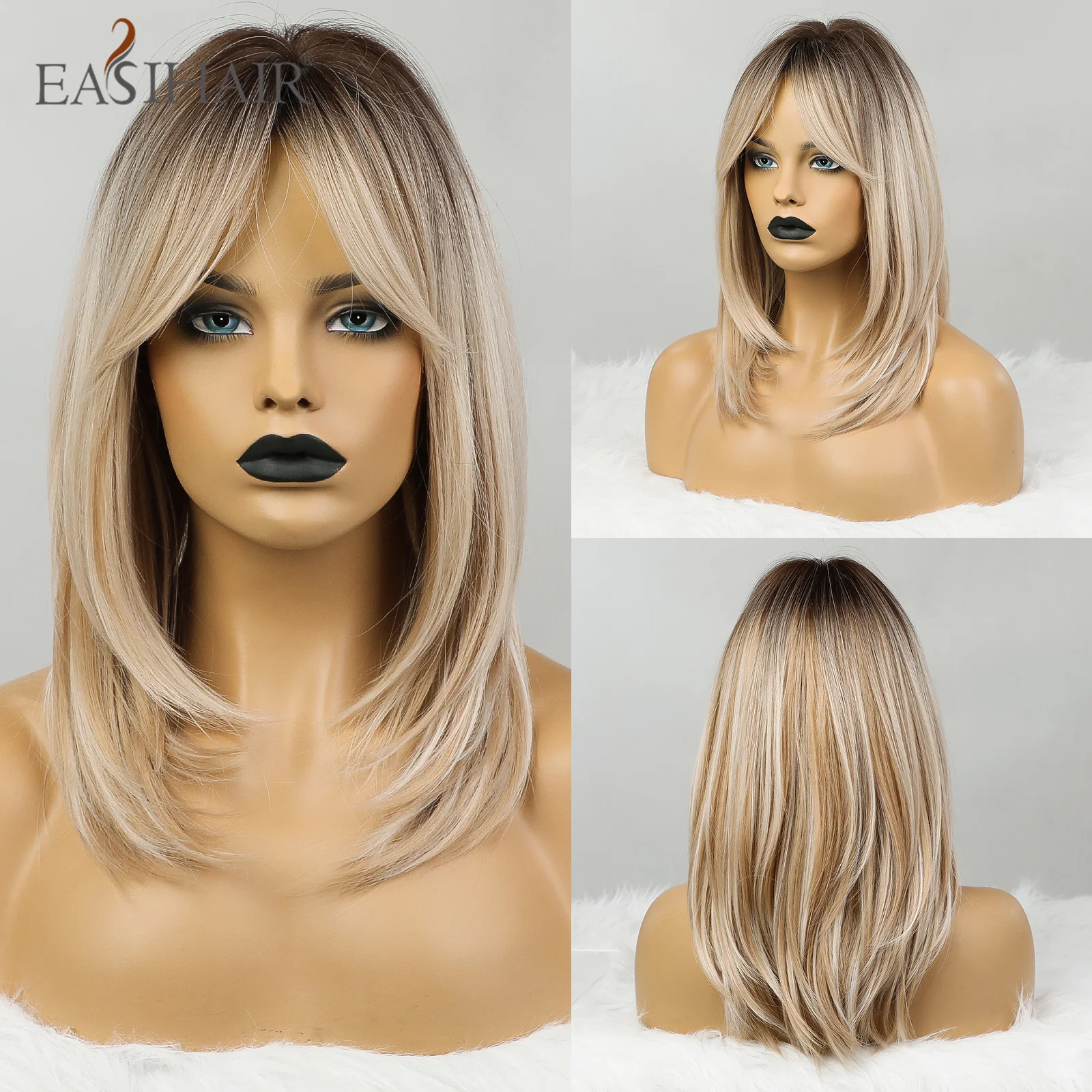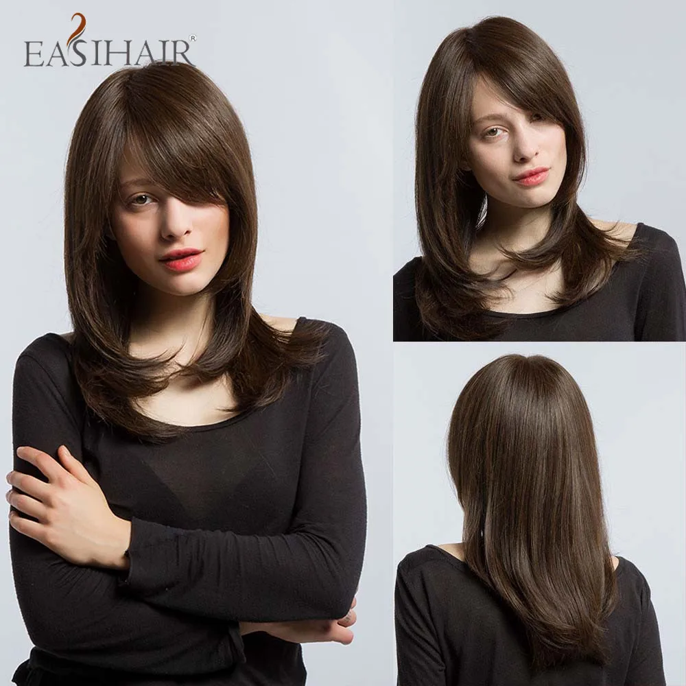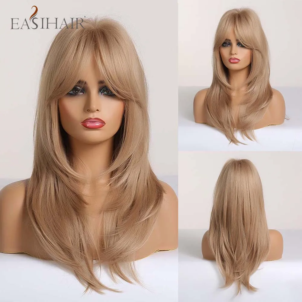 EASIHAIR Brown Golden Women's Wigs with Bangs Medium Length Straight Hair Heat Resistant Synthetic Wigs for Women Daily Cosplay