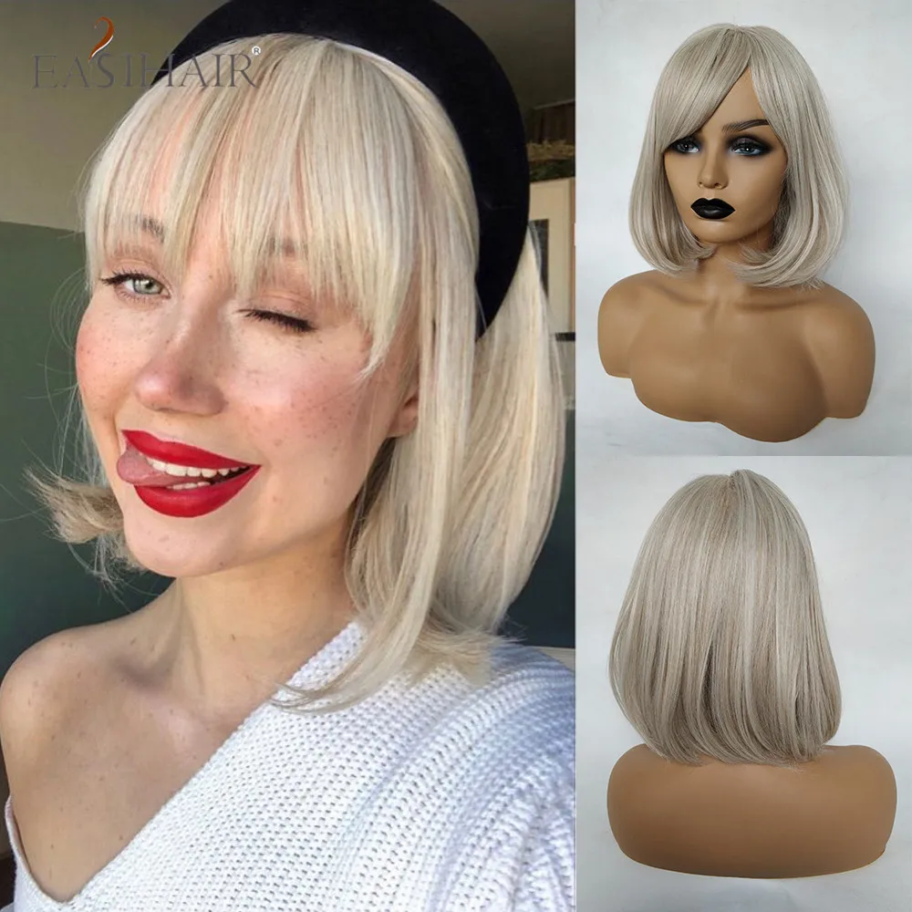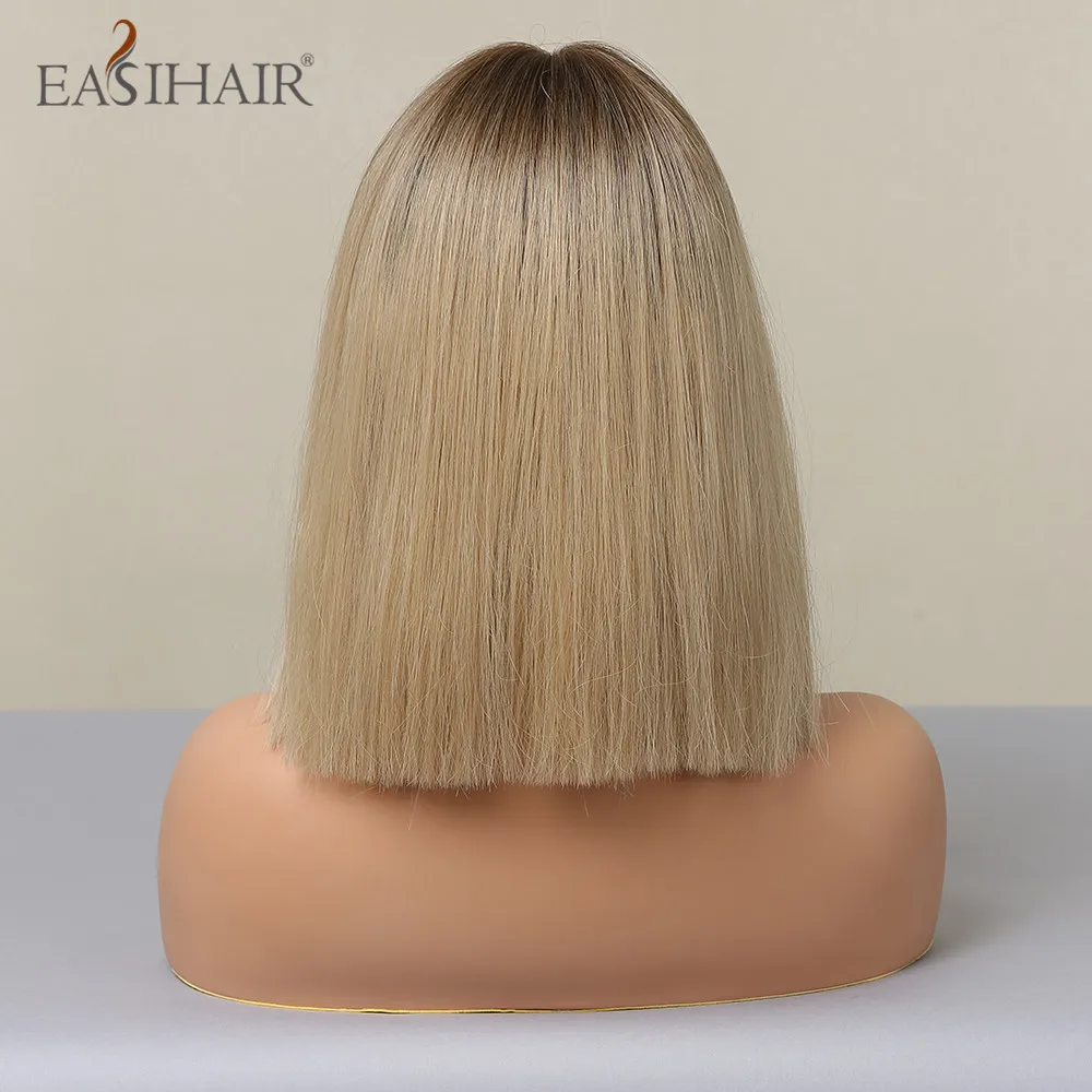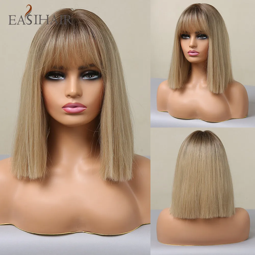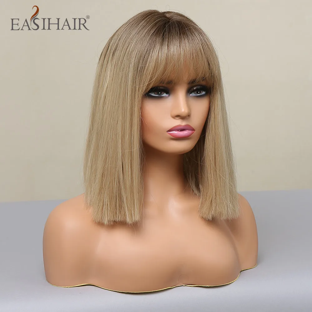 EASIHAIR Brown Golden Women's Wigs with Bangs Medium Length Straight Hair Heat Resistant Synthetic Wigs for Women Daily Cosplay