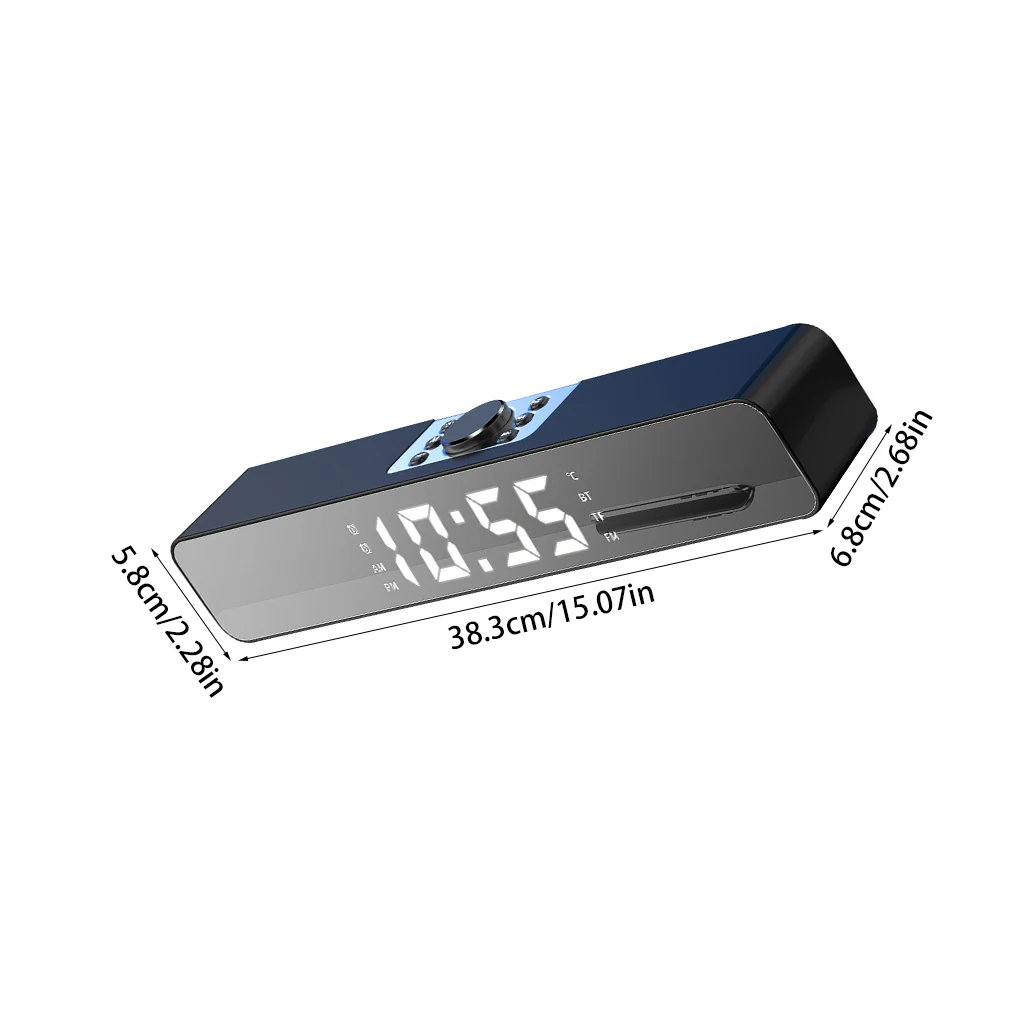 Этот светодиодный bluetooth-совместимый Саундбар имеет двойные сигналы и функцию повтора и имеет светодиодный зеркальный экран для отображения времени, будильника, температуры.
