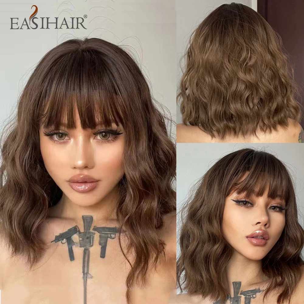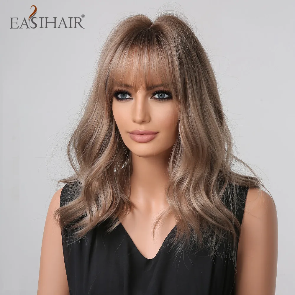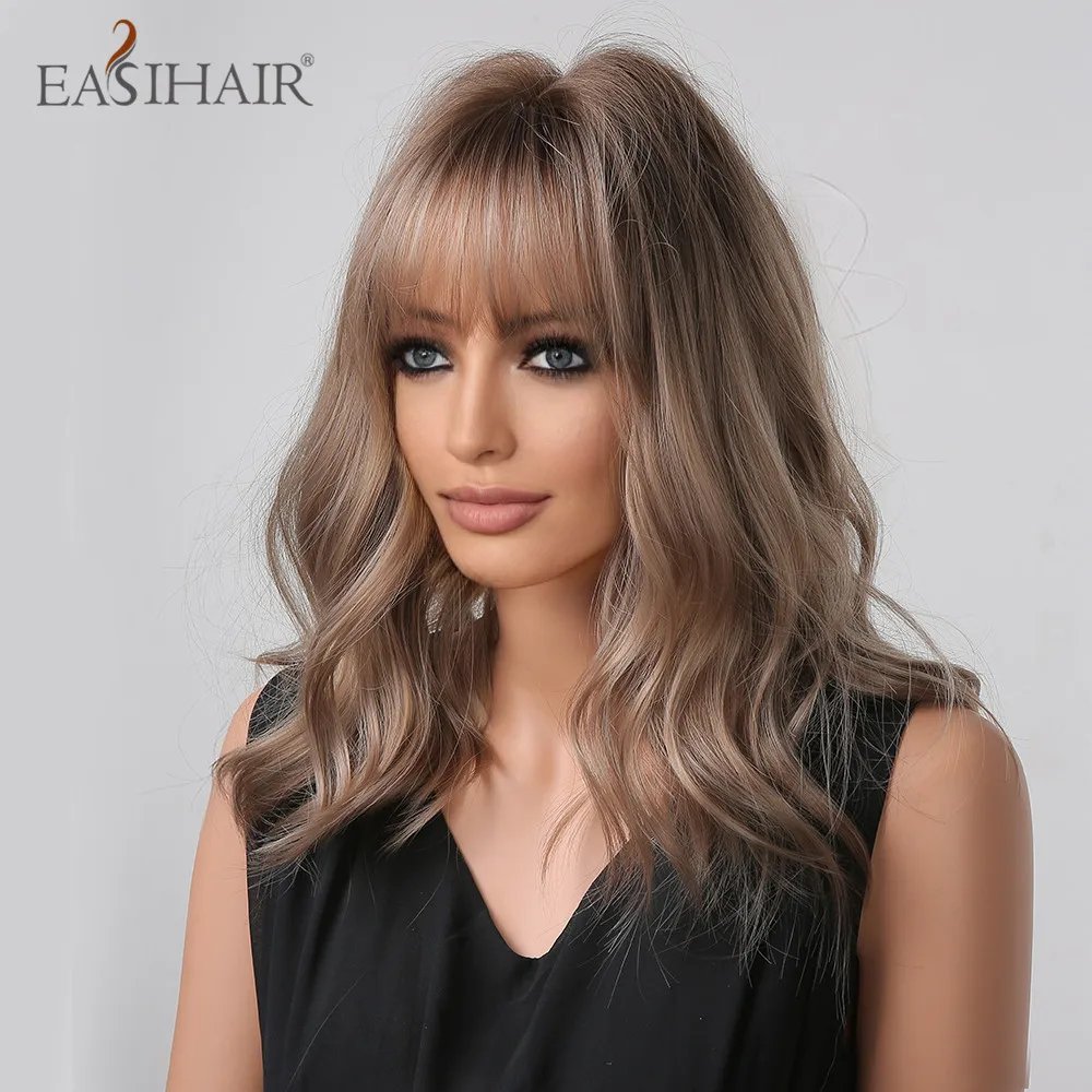 EASIHAIR синтетические волнистые парики с челкой коричневый пепельный блонд средние волнистые волосы парики для женщин повседневный Косплей термостойкий женский парик
