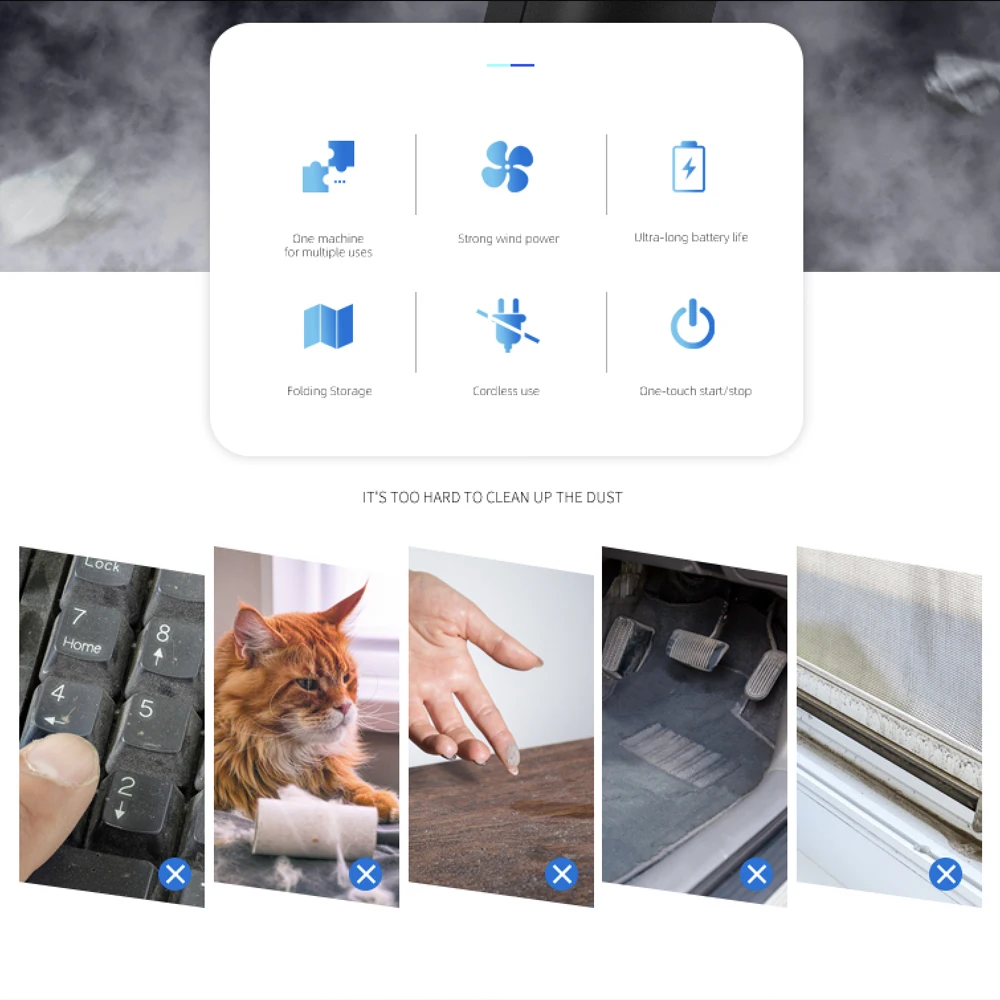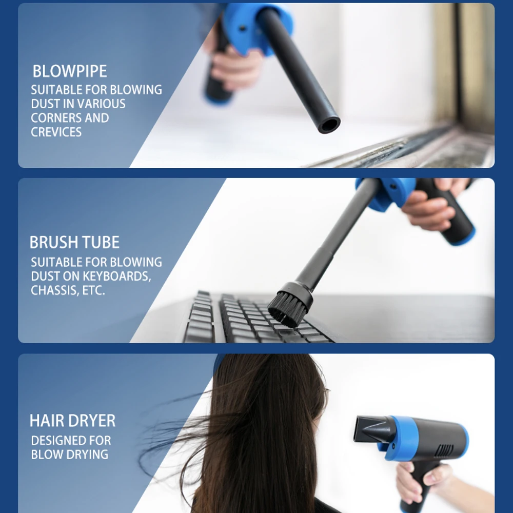 Application range: hair drying, computer keyboard, computer case, car, home, office, outdoor barbecue, etc.